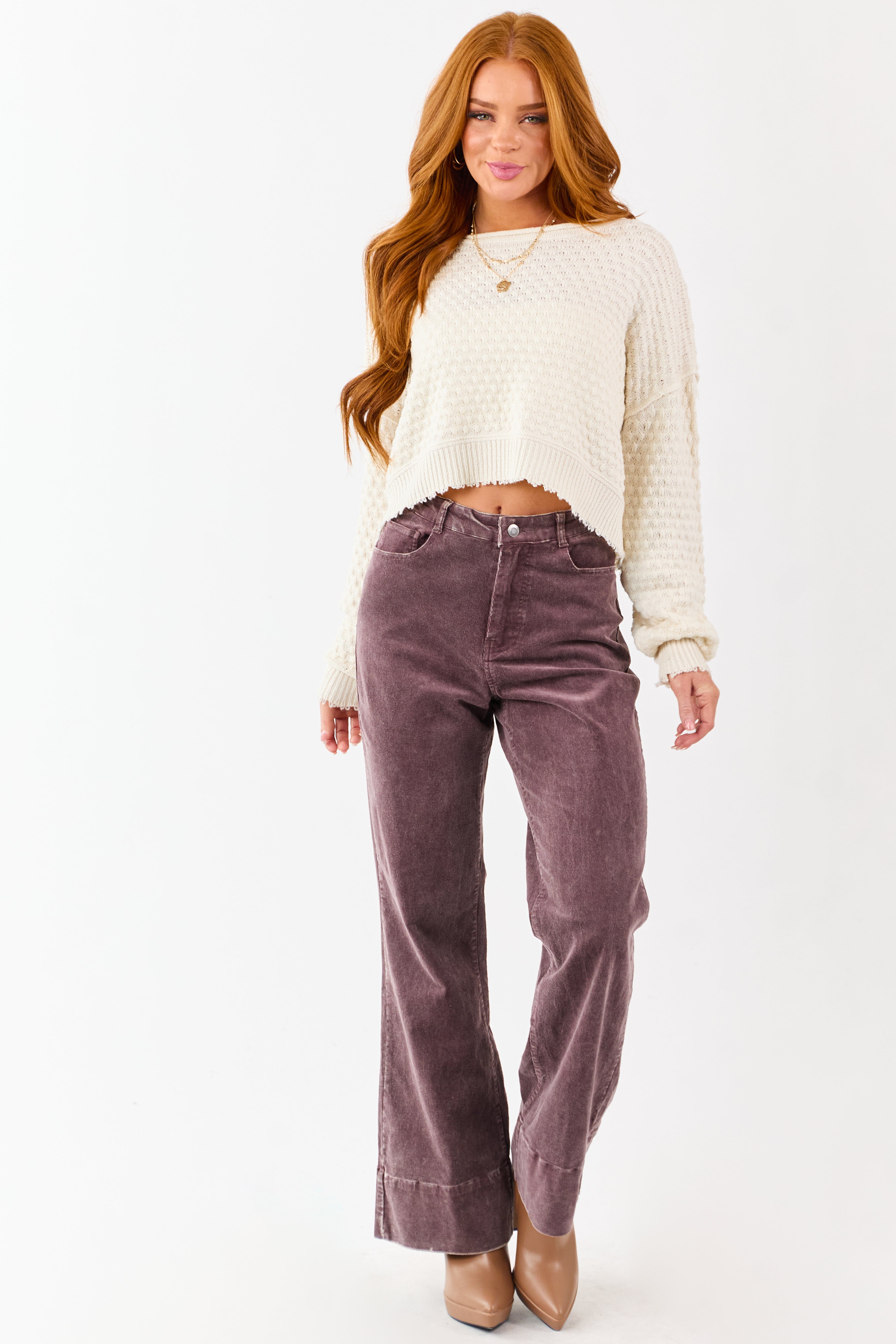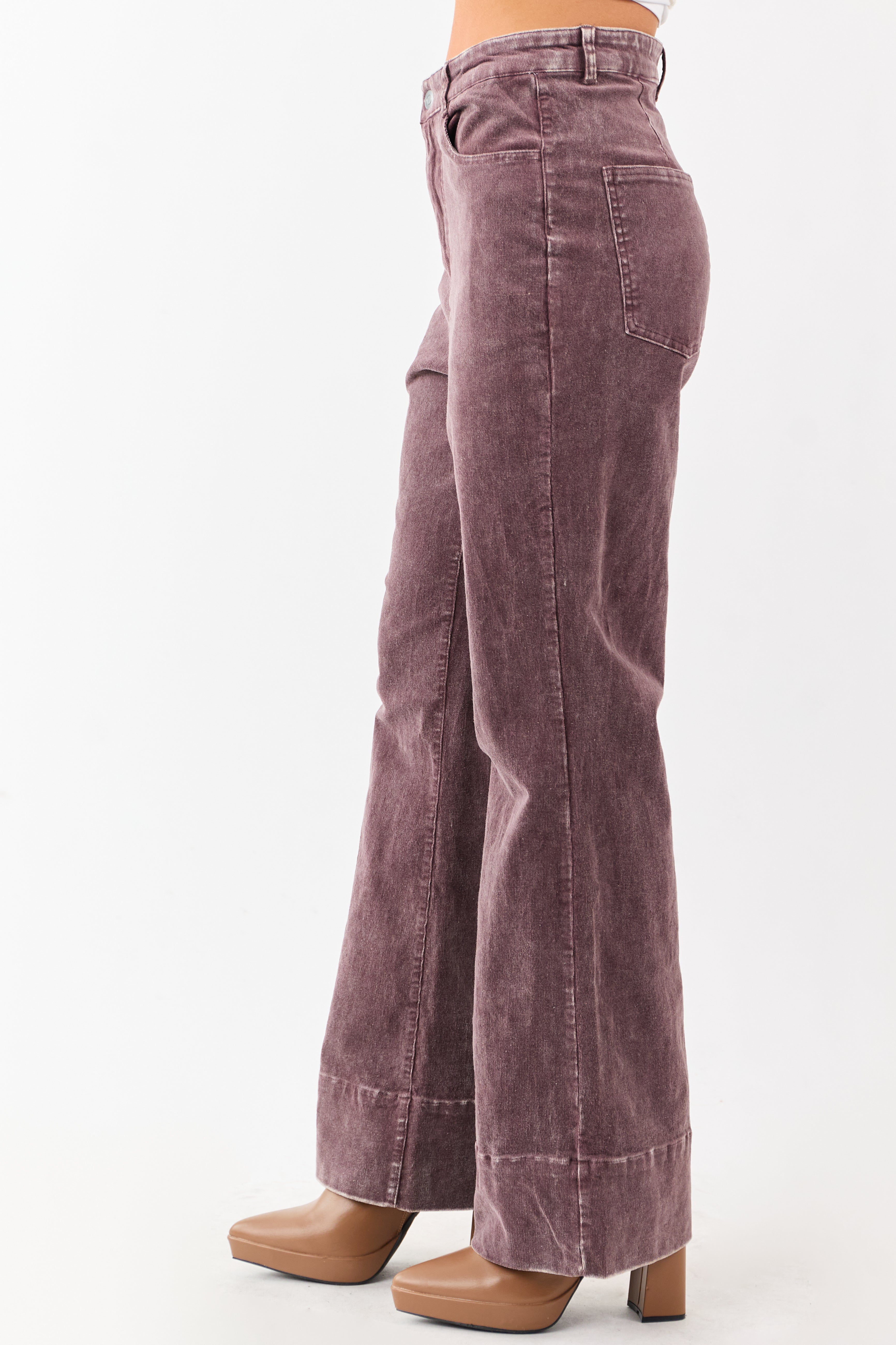 Upgrade your wardrobe with our retro-chic and versatile mineral wash corduroy flare pants. These pants feature a lived-in, vintage-inspired look and are crafted from stretchy corduroy for comfort. The high-waisted design with five pockets, belt loops, and a zipper fly with button closure adds both style and convenience to your outfit. Available in sizes XS to XL.