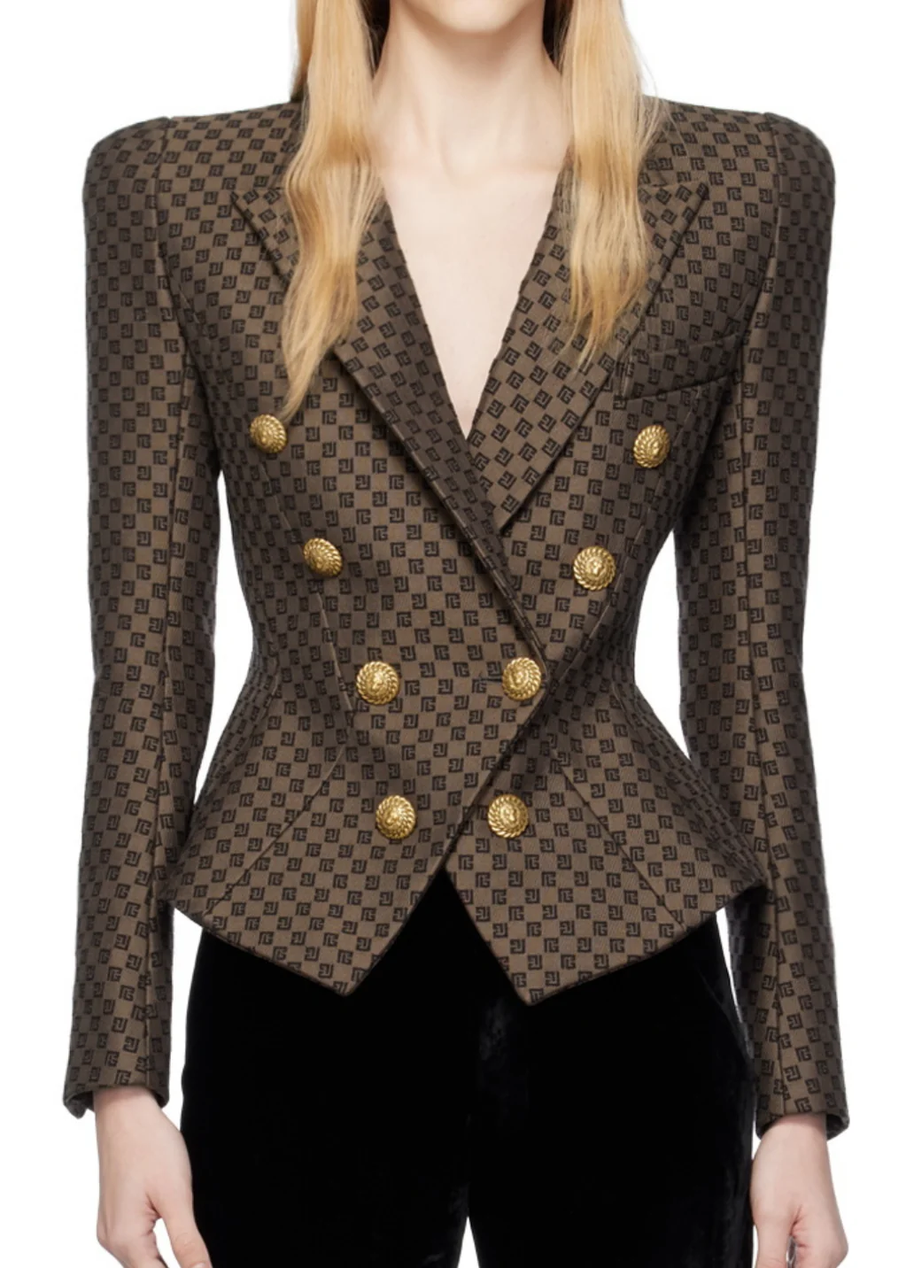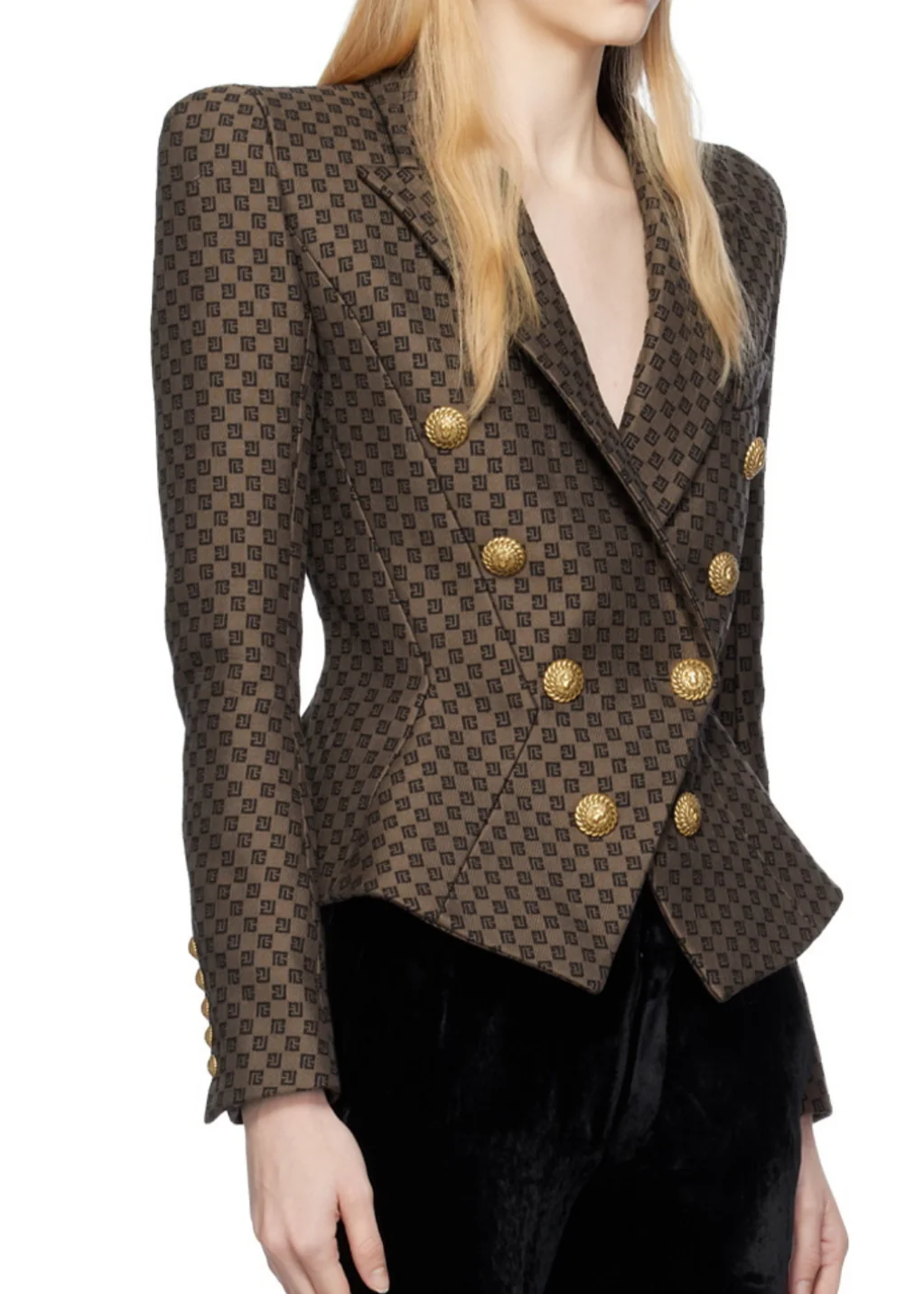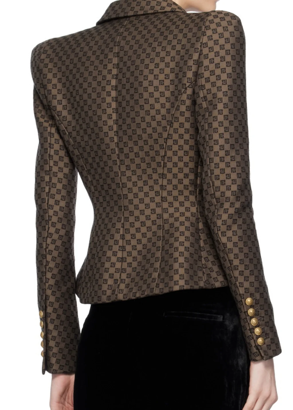 Elevate your wardrobe with the playful Brown Monogram Print Blazer. Its quirky design and unique color add personality to your look. This blazer features a peaked lapel, double-breasted button closure, padded shoulders, and more. The full twill lining and surgeons cuffs enhance its premium appeal. Feel confident and fashionable in this standout piece that matches various styles effortlessly.