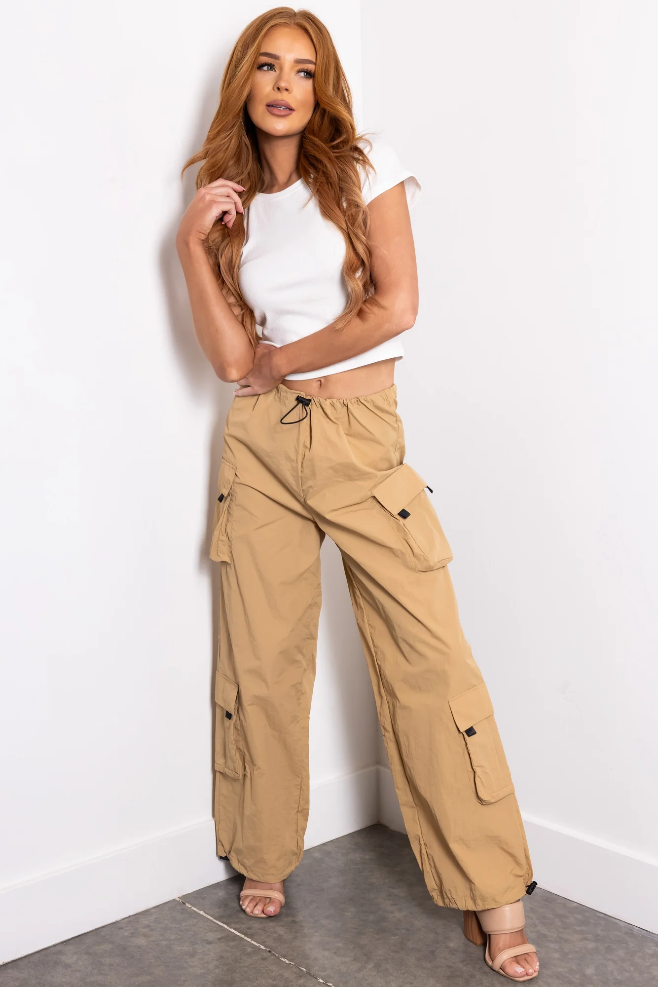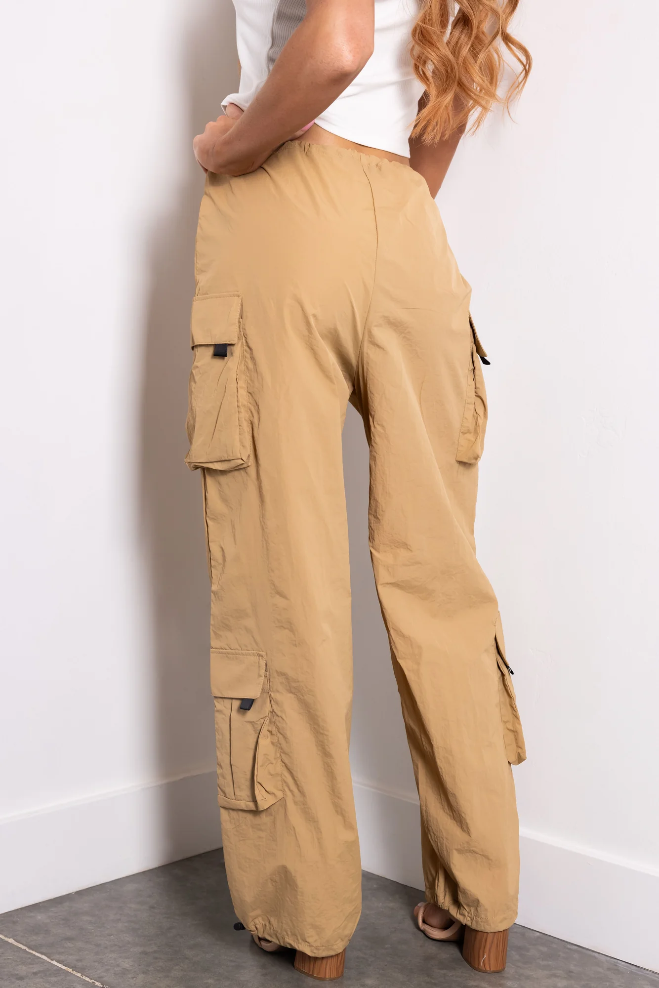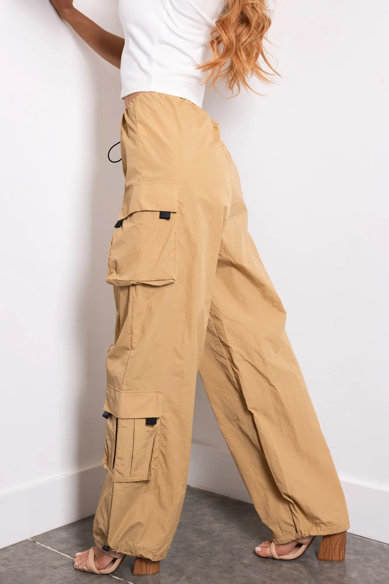 Indulge in the comfort and versatility of our Brown Nylon Cargo Drawstring Pants . Crafted from non-stretchy windbreaker fabric, these high-waisted pants feature a bungee drawstring waist, double cargo pockets, and a wide leg with adjustable hems. Perfect for casual daytime wear, these pants are unlined and imported. Care instructions: hand wash cold, hang to dry. Available in sizes S, M, and L.