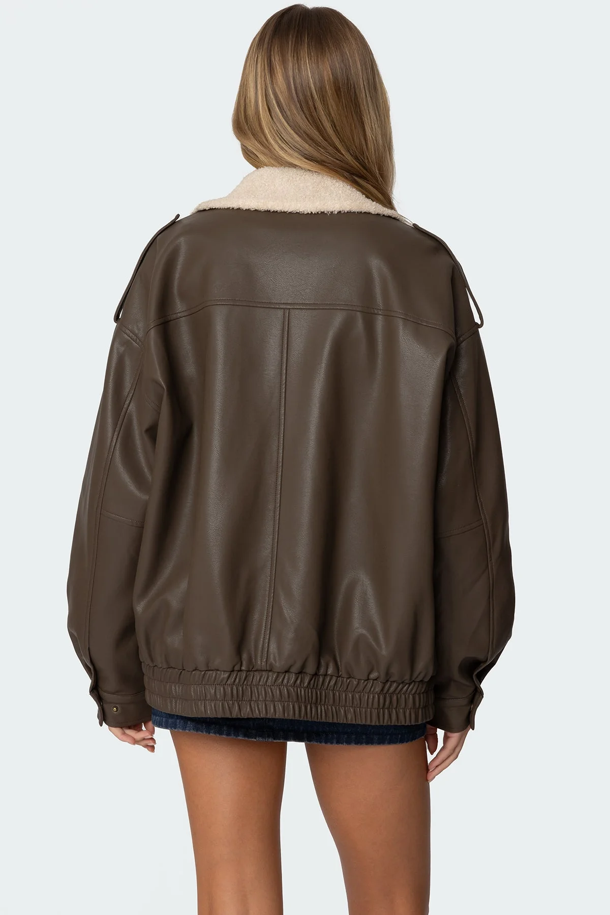 Upgrade your style with this brown faux leather jacket featuring an oversized fit, faux sherpa collar, and pocket detailing. Stay cozy with front zip & button closures and durable polyurethane fabric thats easy to maintain. Whether for a casual day out or a stylish night in town, this jacket is a versatile addition to your wardrobe. Model wears size S. Machine wash at maximum 30ºC for easy care.