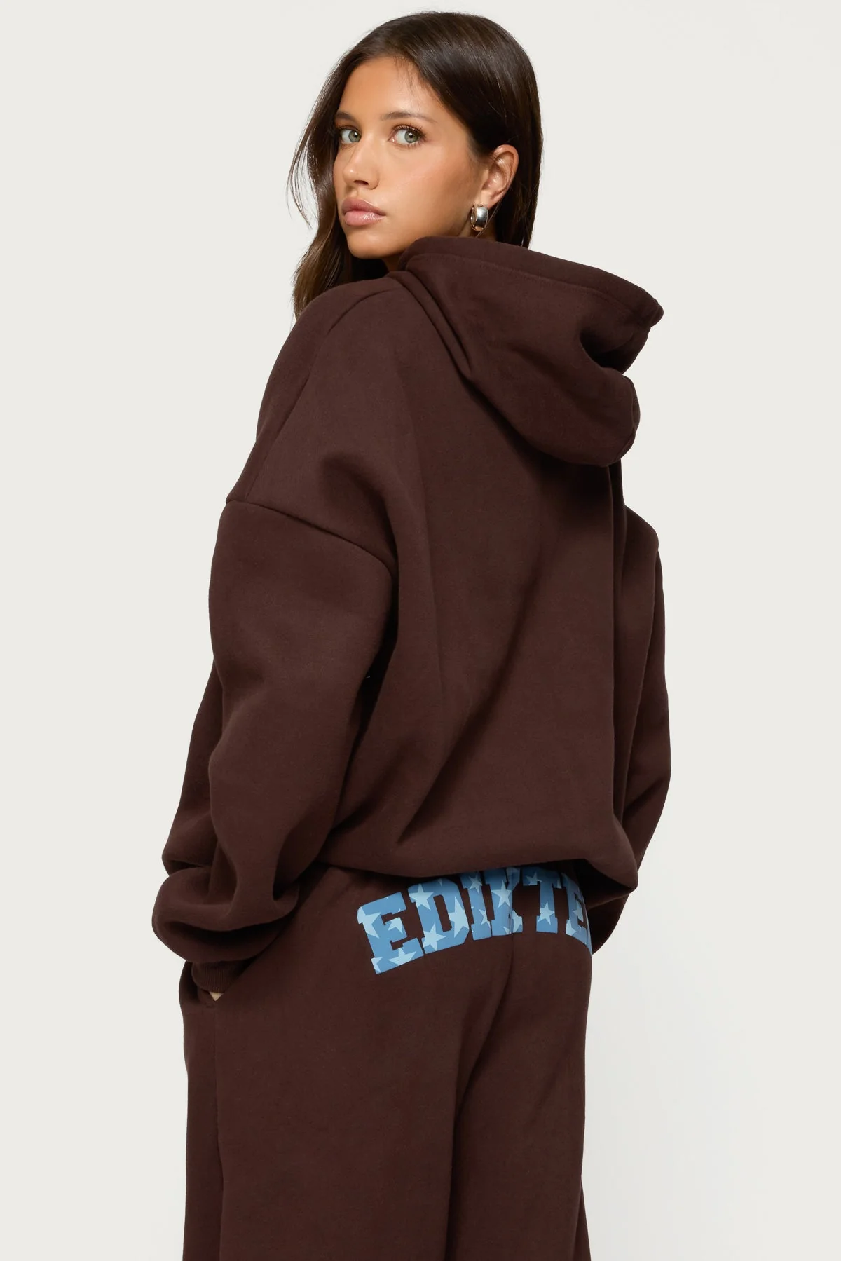 Stay cozy and stylish with our Brown Oversized Graphic Text Hoodie Set. This matching polyester and cotton set features a puff printed graphic, ideal for casual outings or relaxing at home. The hoodie comes in an oversized fit with a range of sizes available including XS, S, M, L, and XL. Easy to care for, simply machine wash with similar colors. Complete your look effortlessly with this versatile and trendy hoodie set.