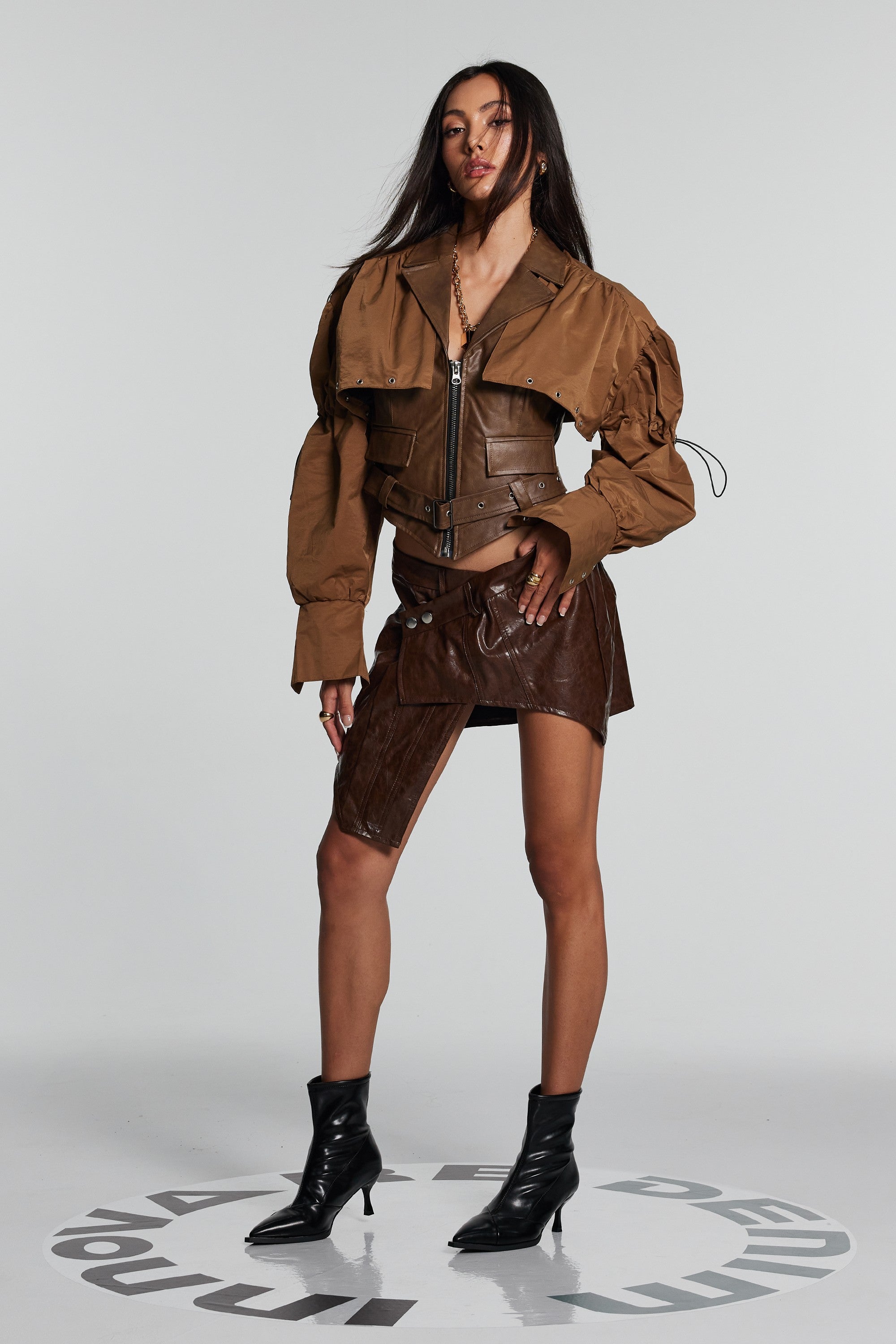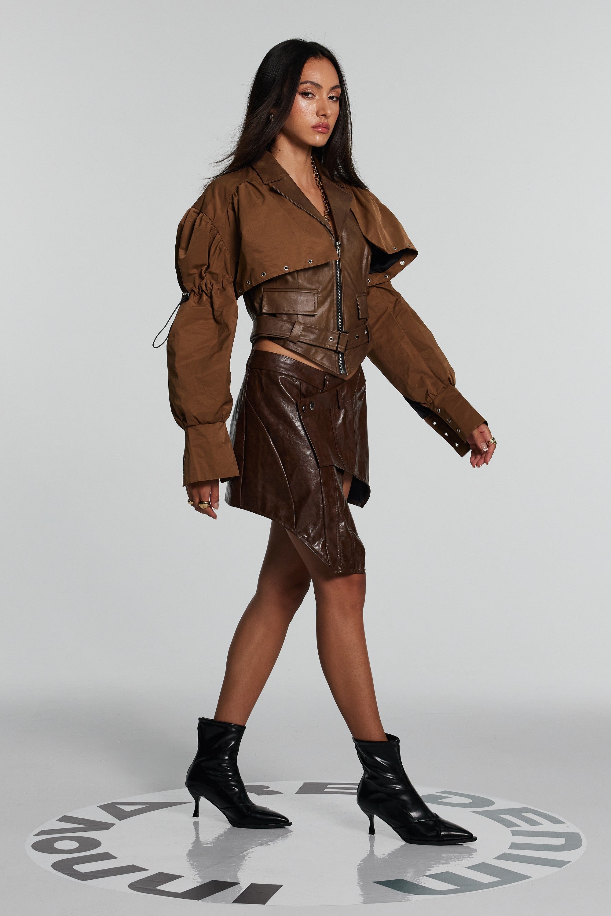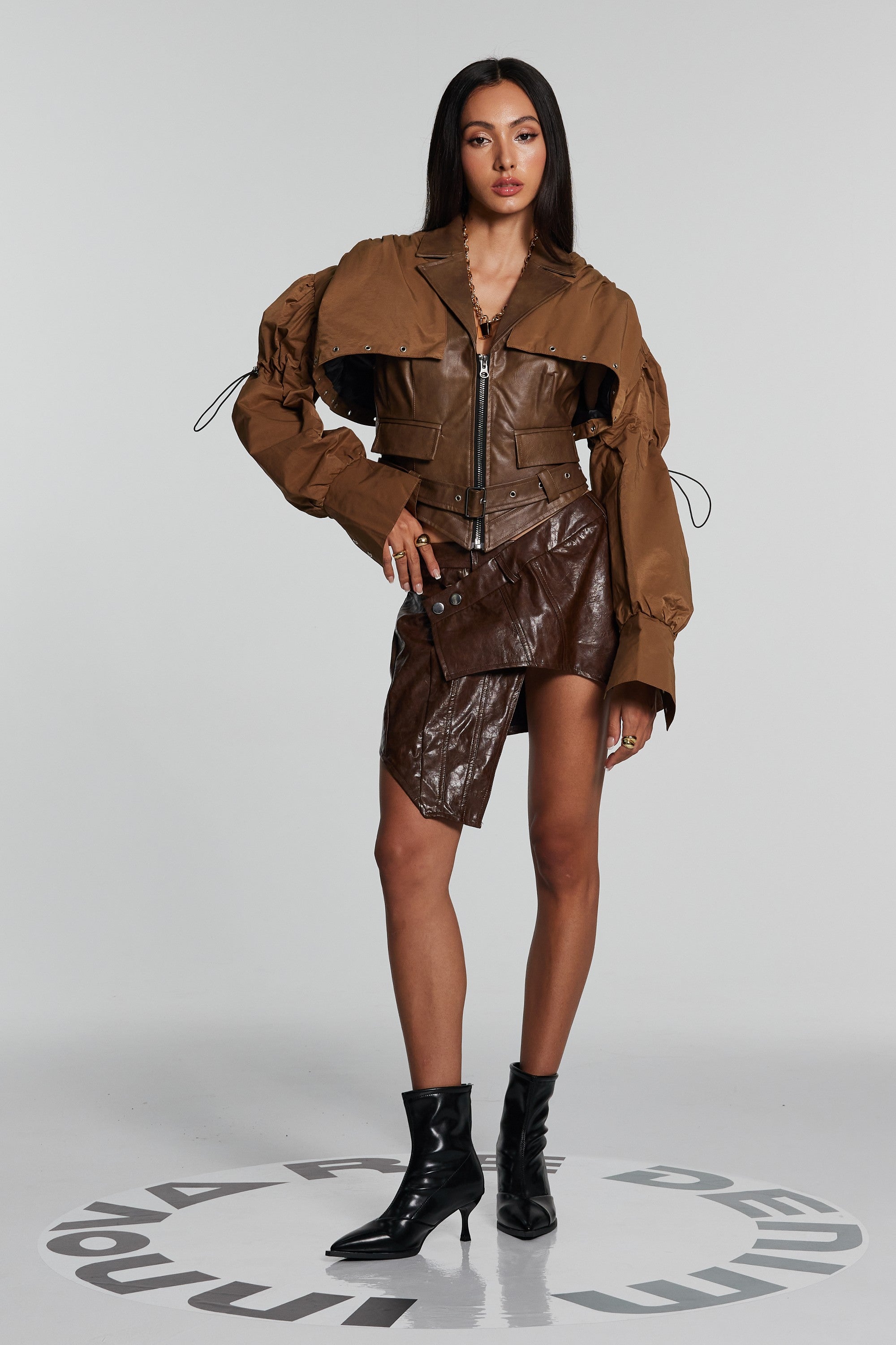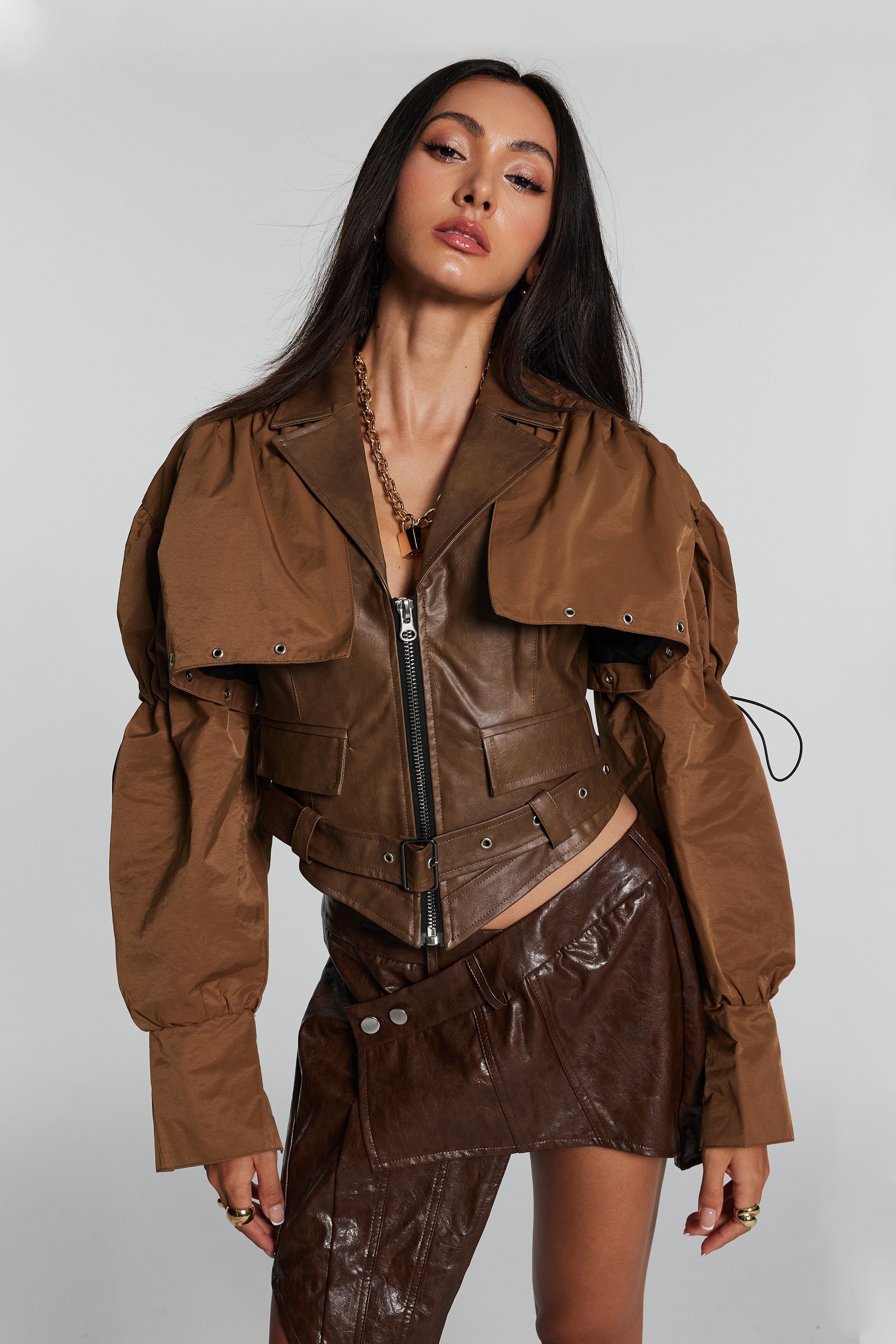 Upgrade your wardrobe with the Brown Patchwork Faux Leather Jacket . This stylish and edgy jacket is crafted from high-quality faux leather, featuring a unique patchwork design that adds a touch of individuality. The sleek lapel enhances the modern look, making it a must-have for those who value both warmth and style. This jacket is made of 100% Polyester and is recommended for dry clean only. Please note that the color may vary slightly due to lighting conditions in images. Choose this urban edge staple to express your rebellious attitude. Available in sizes S, M, and L.