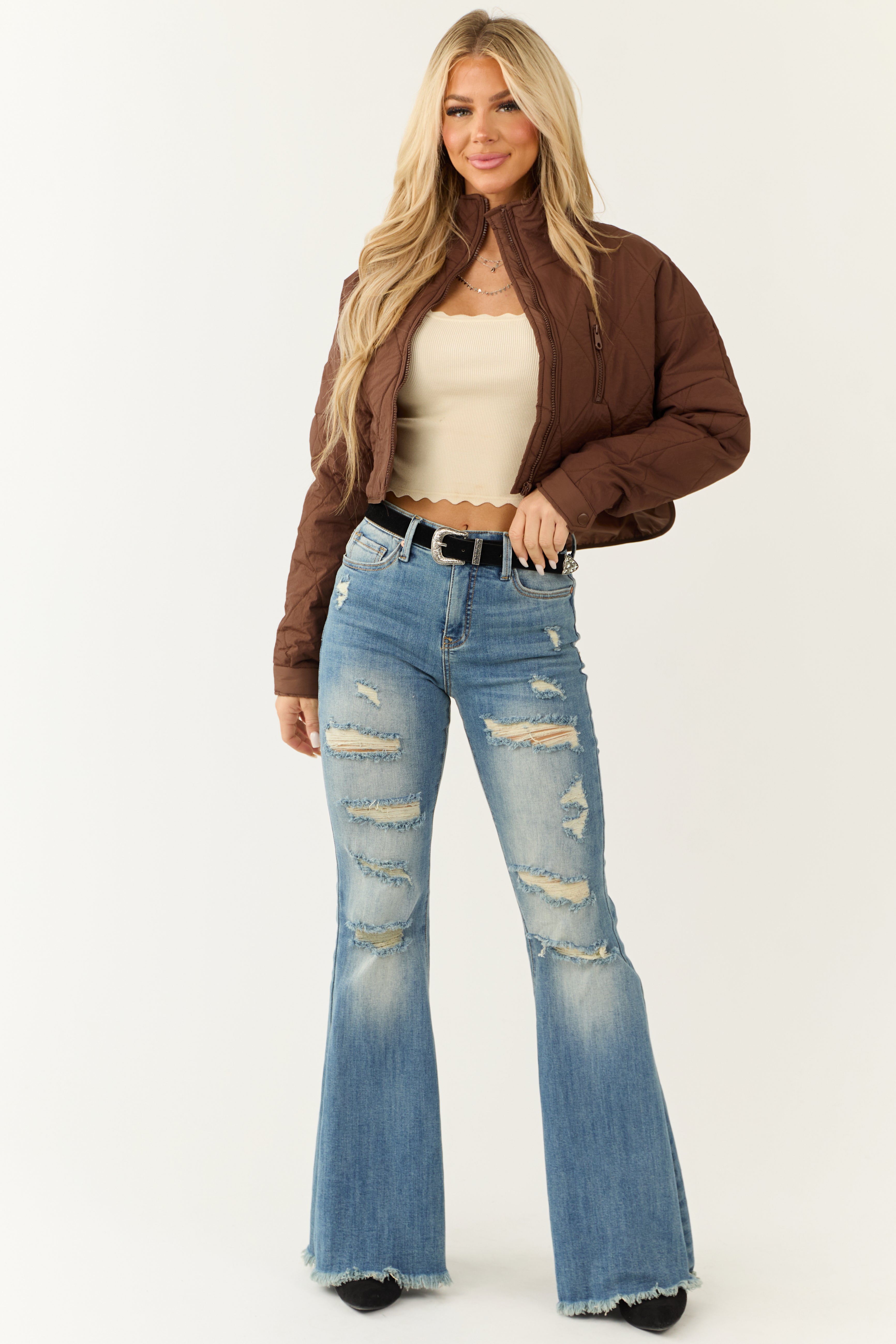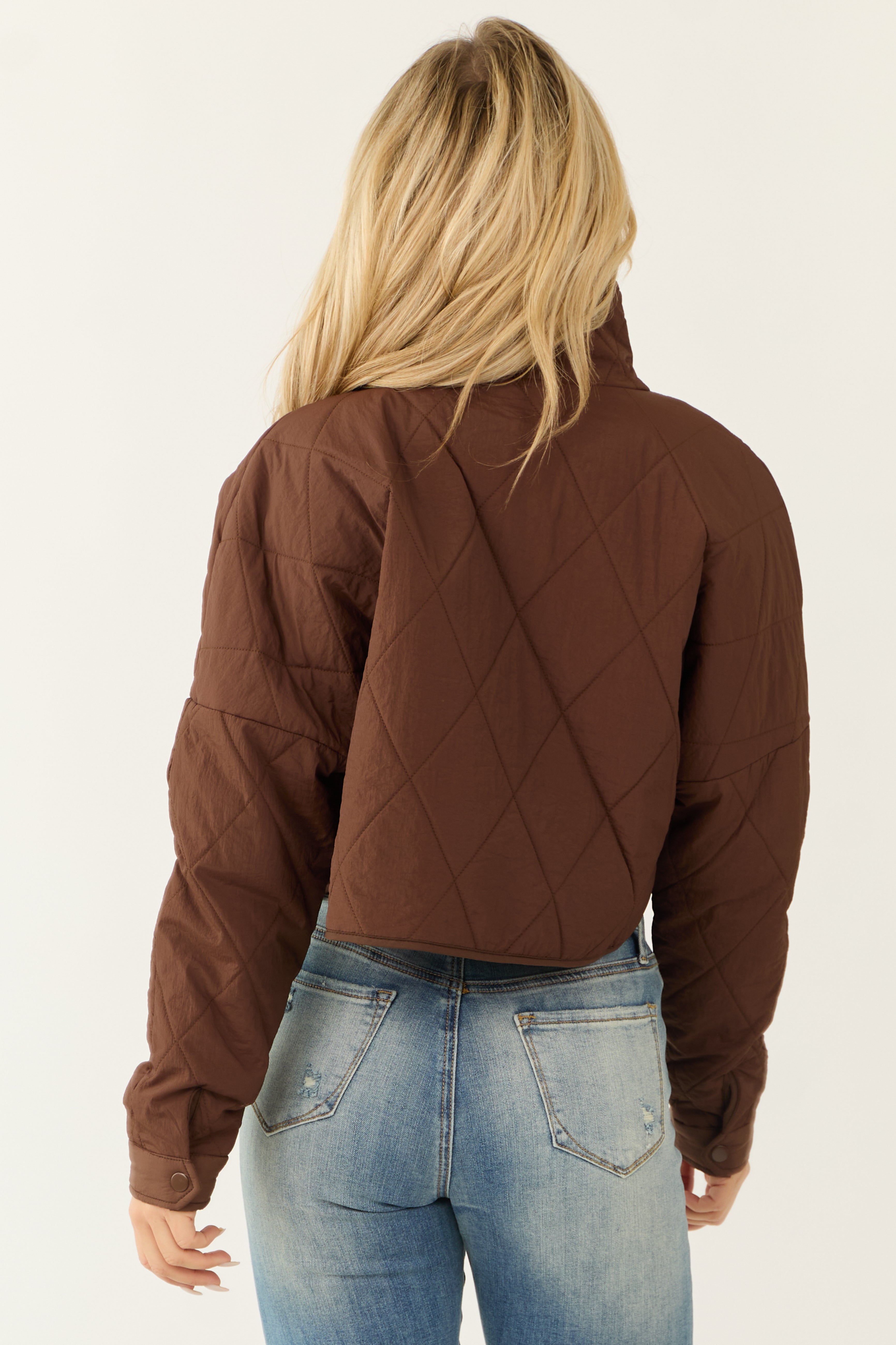 Stay warm and stylish with our Brown Quilted Puffer Cropped Winter Jacket. Available in sizes S, M, and L with sleeve lengths from 22.5″ to 23.5″ and a variety of bust sizes. This non-stretchy woven jacket features a zipper chest pocket, high low hem, drop shoulder, button banded cuff, and a lined collar for extra warmth. Made of 100% polyester with a seamed lining for comfort. Care instructions: Hand wash cold, hang dry. Model is 57″ tall, wears size Small, bust 34″, waist 26″.