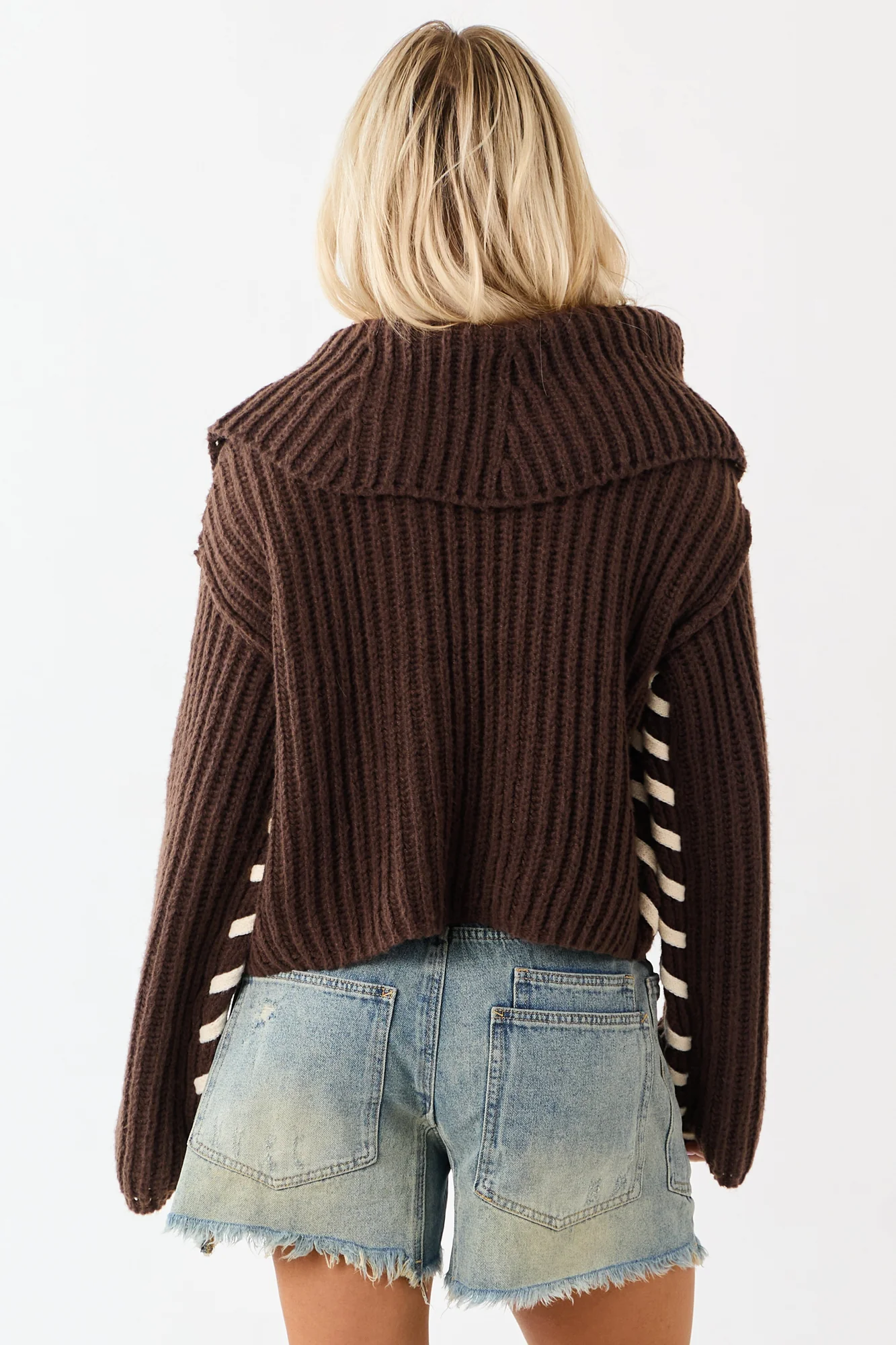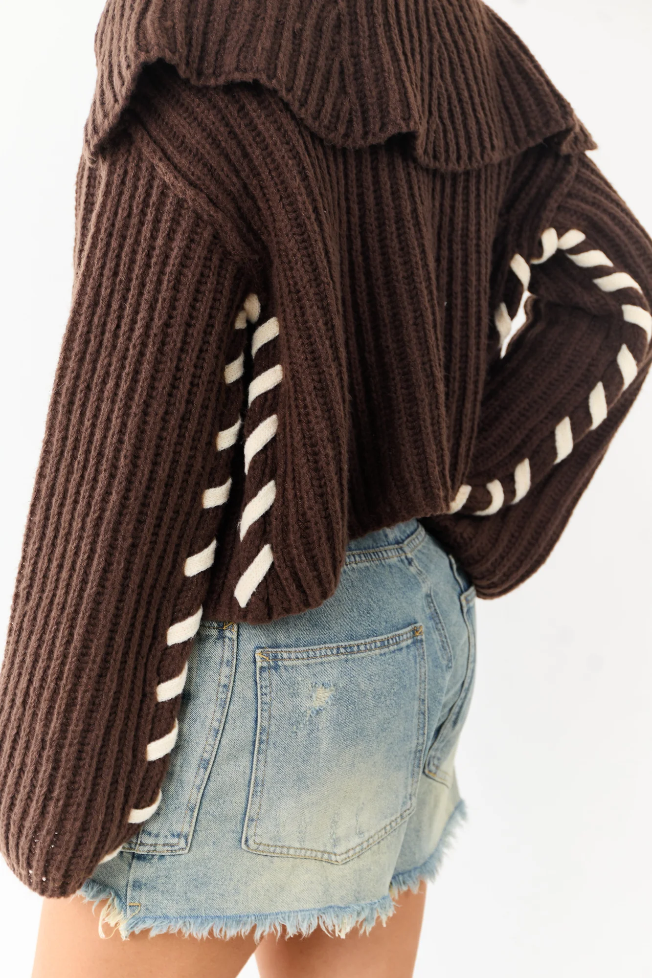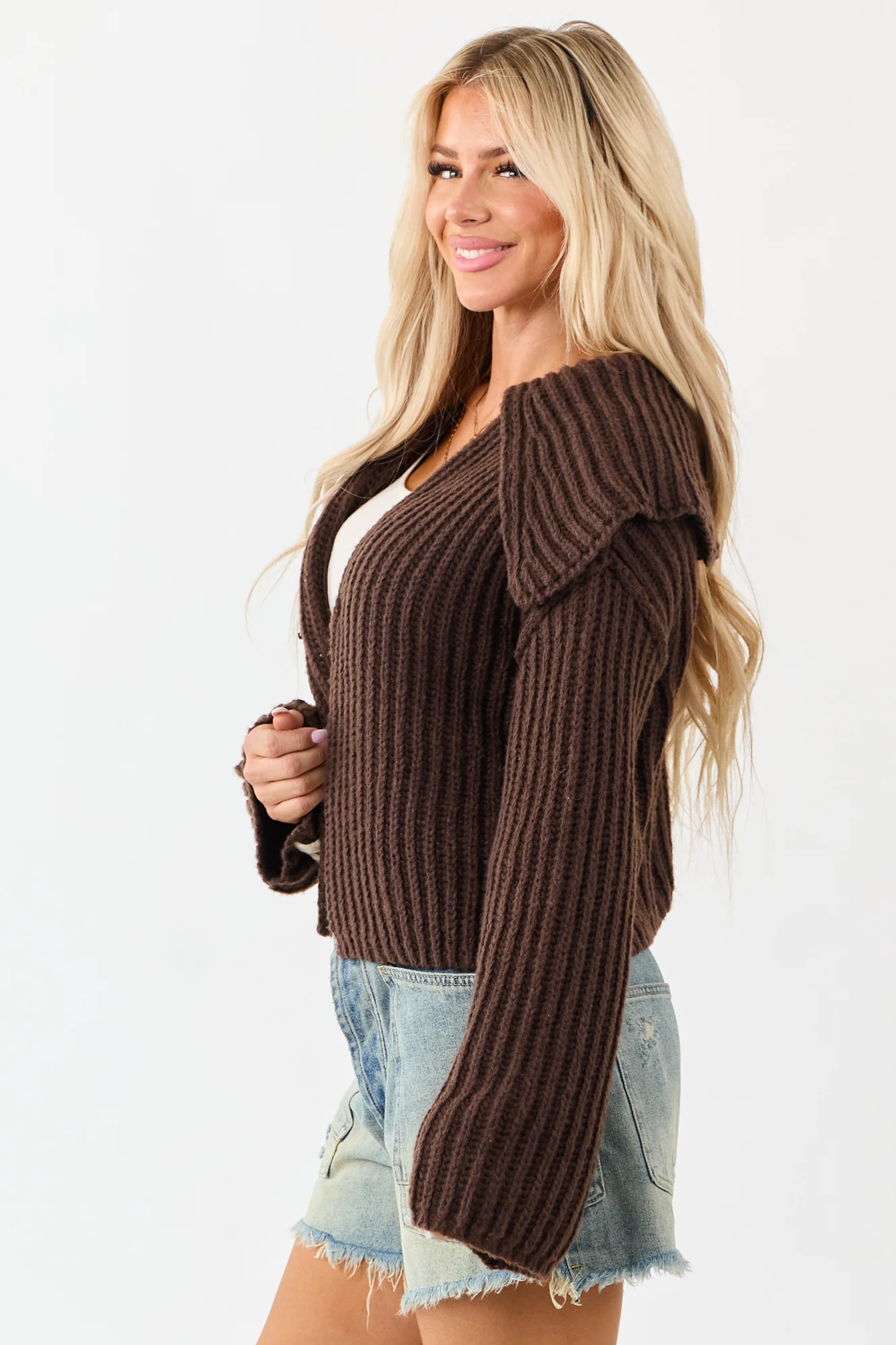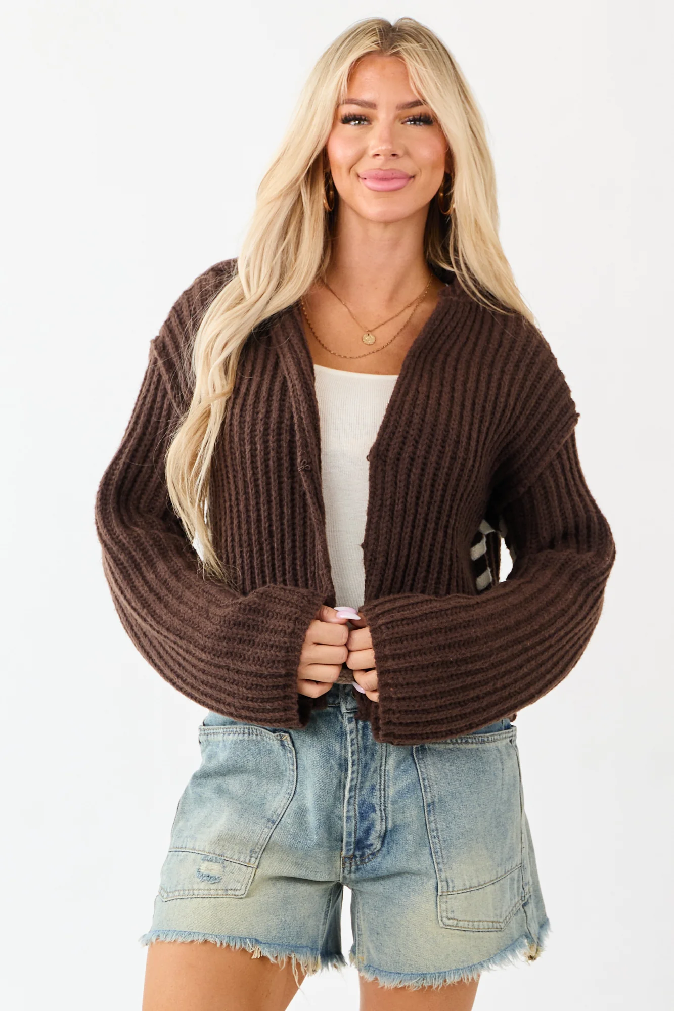 Stay cozy and chic with our Brown Rib Knit Cardigan featuring cream contrast detailing for a touch of style. This long-sleeve cardigan with a relaxed fit is perfect for layering over any outfit. Made from stretchy ribbed knit fabric, it offers comfort and style in one. The collared design with hook and eye front closure adds a sophisticated touch. Available in sizes S, M, and L. Ideal for pairing with dresses or jeans. Imported. Model is wearing a size Small.