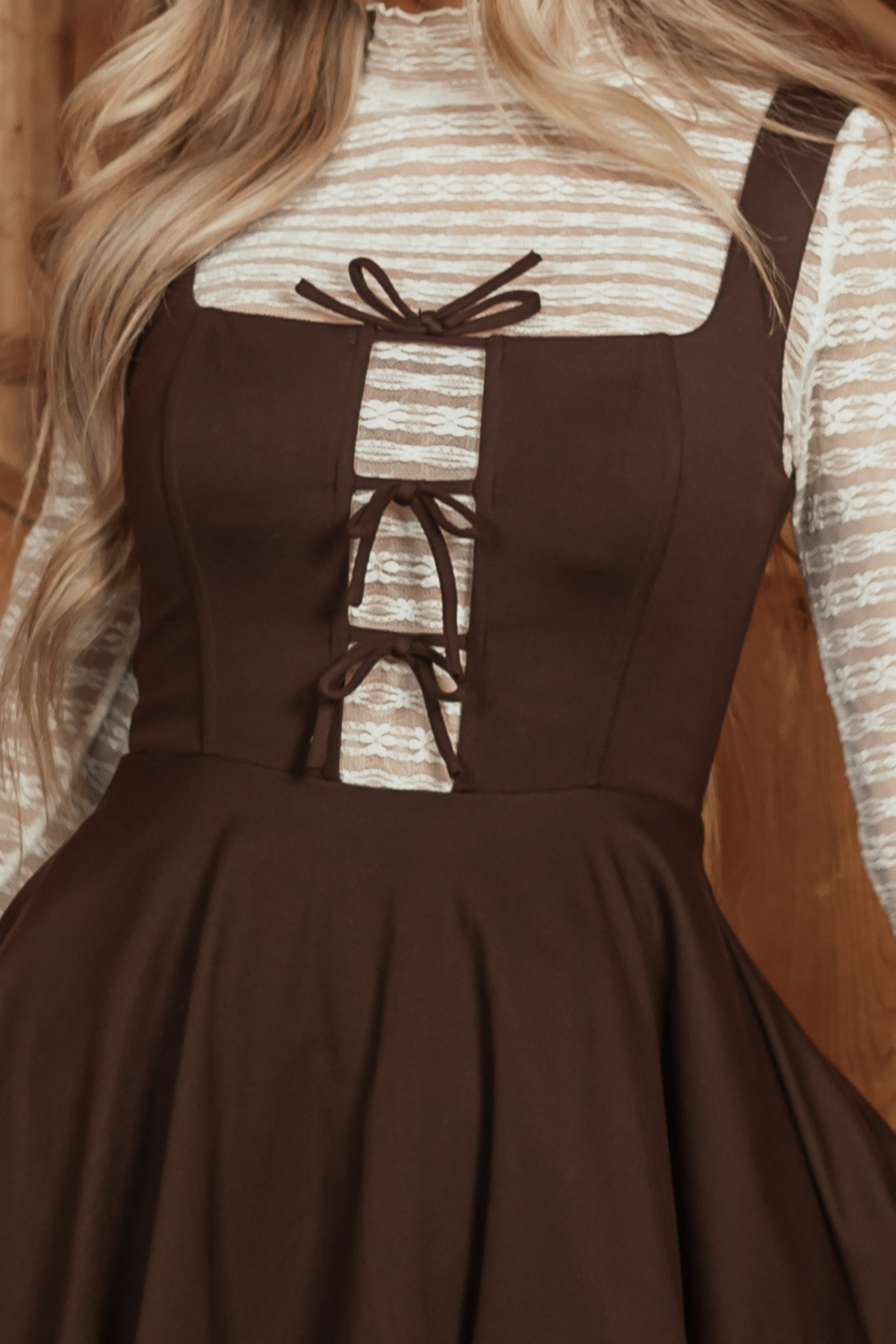 Experience chic style with this Brown Ribbed Knit Mini Dress. Crafted from stretchy ribbed knit, it features a tie front detail, boning detail, and square neckline. The dress also includes a tulle underskirt, back zipper, open front with ties, and is lined for comfort. Made of 60% Rayon, 35% Nylon, and 5% Spandex with contrast and lining in 100% Polyester. Perfect for a date night or any special occasion. Care instructions: Hand wash cold, line dry. Model is 57″ and wearing a size Small.