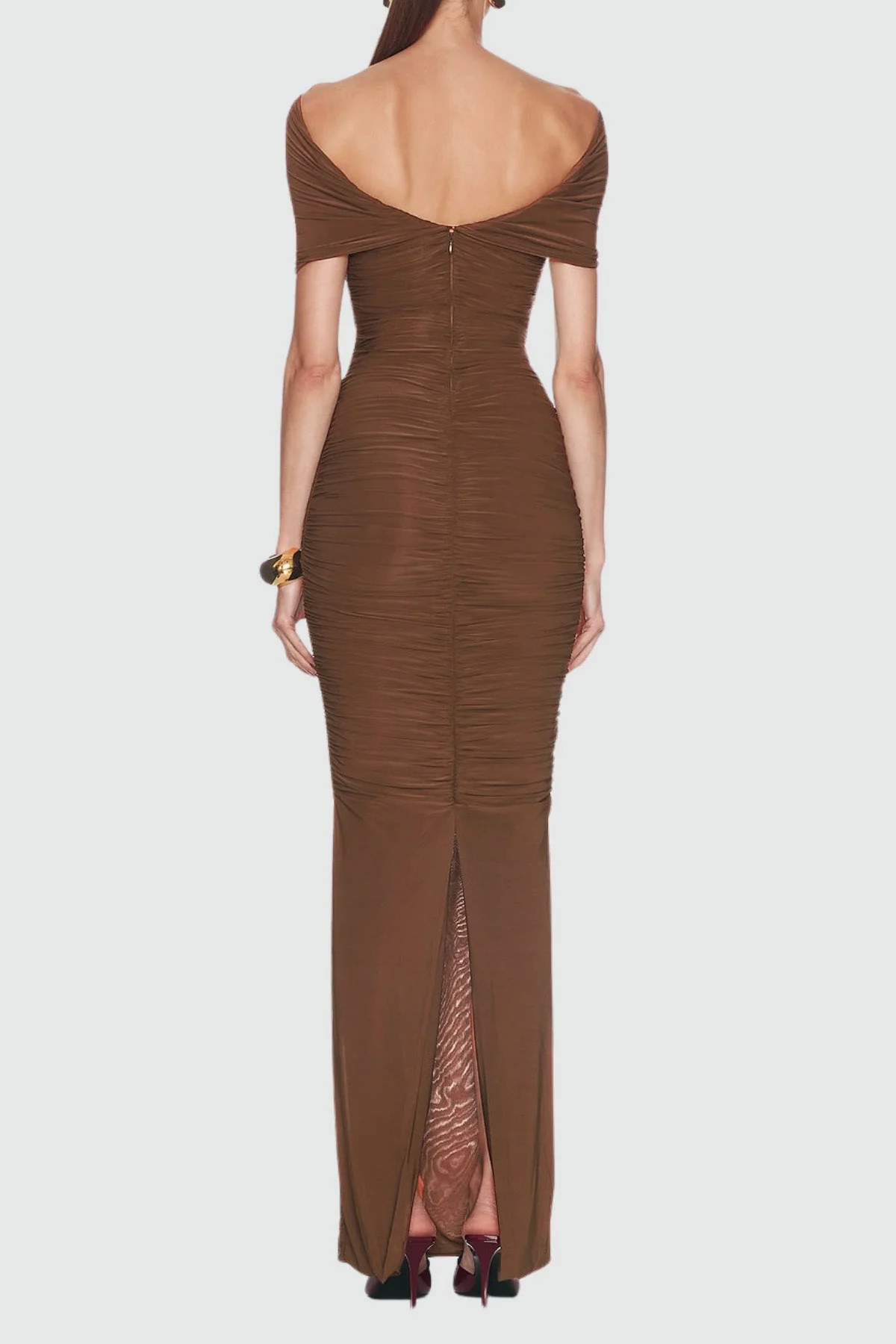 Elevate your style with our Brown Ruched Maxi Dress featuring stunning cutout details. This elegant dress is designed to accentuate your figure with its ruched fabric, while the modern cutouts add a touch of flair. The rich brown color presents versatility, perfect for both casual gatherings and formal events. Achieve a perfect blend of sophistication and allure with this maxi dress, ideal for those who desire a refined yet distinctive appearance. This dress offers a slight stretch for comfort and is easy to care for with gentle machine wash. Please note that the actual color may vary slightly due to lighting differences in images.