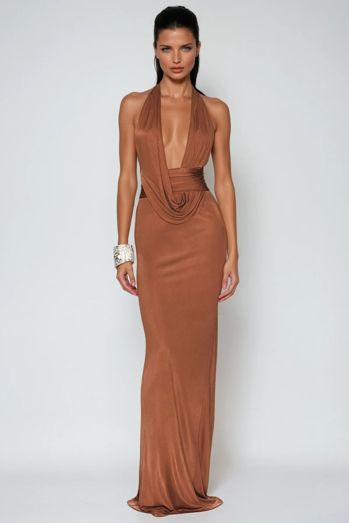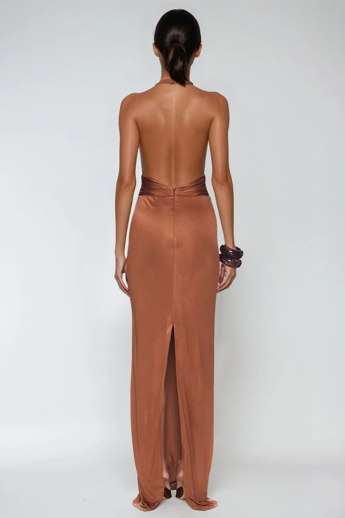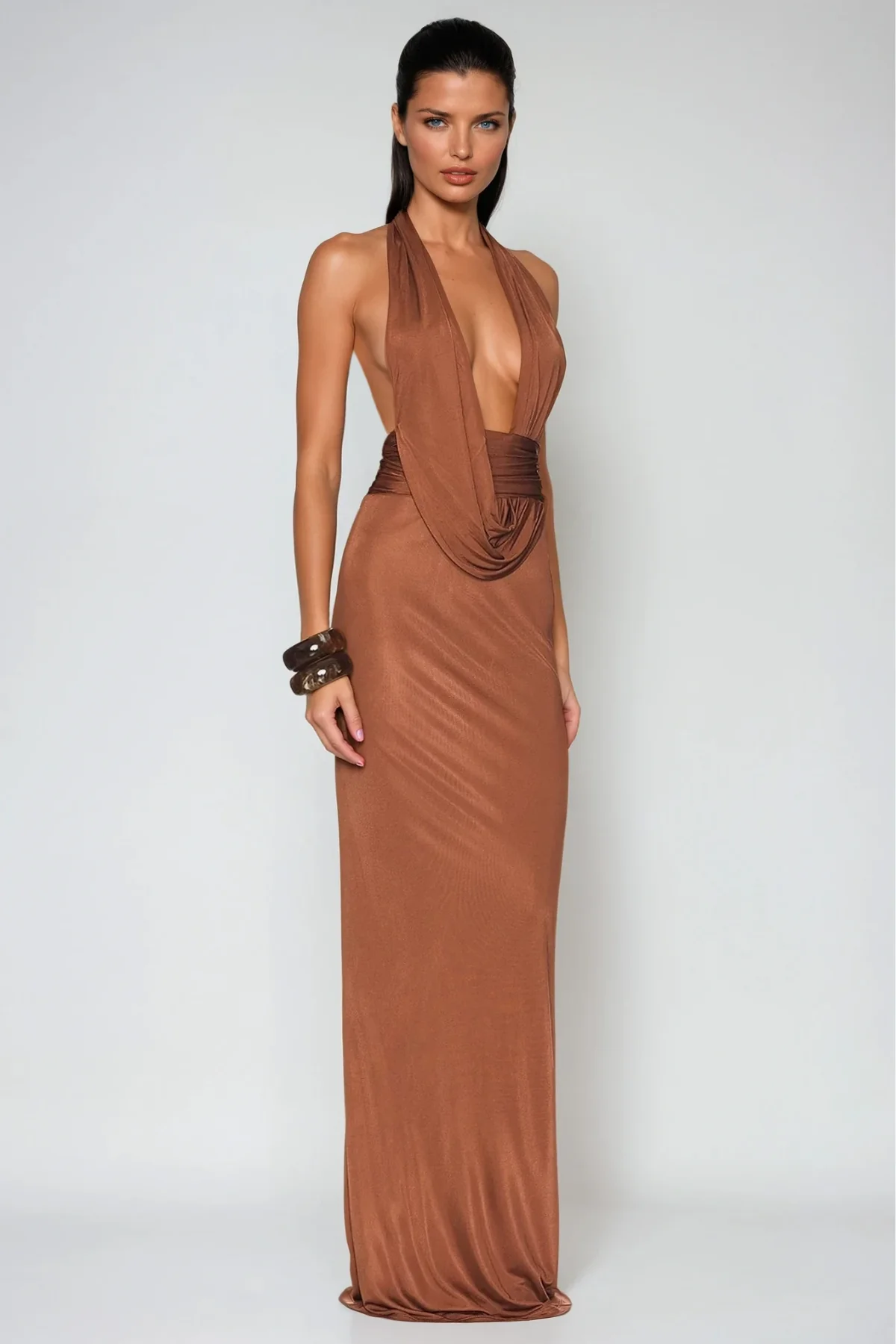 Elevate your evening wardrobe with the sophisticated and daring design of the Brown Ruched Maxi Dress. This dress features a deep plunge neckline, elegant backless silhouette, and flattering ruched detailing that contours your body for a stylish fit. Designed for upscale events, the dress offers a perfect balance between boldness and grace, ensuring comfort with slight stretch fabric. Make a confident and refined statement at any occasion with the expertly tailored Debra Plunge Backless Dress. Color may vary due to lighting on images.