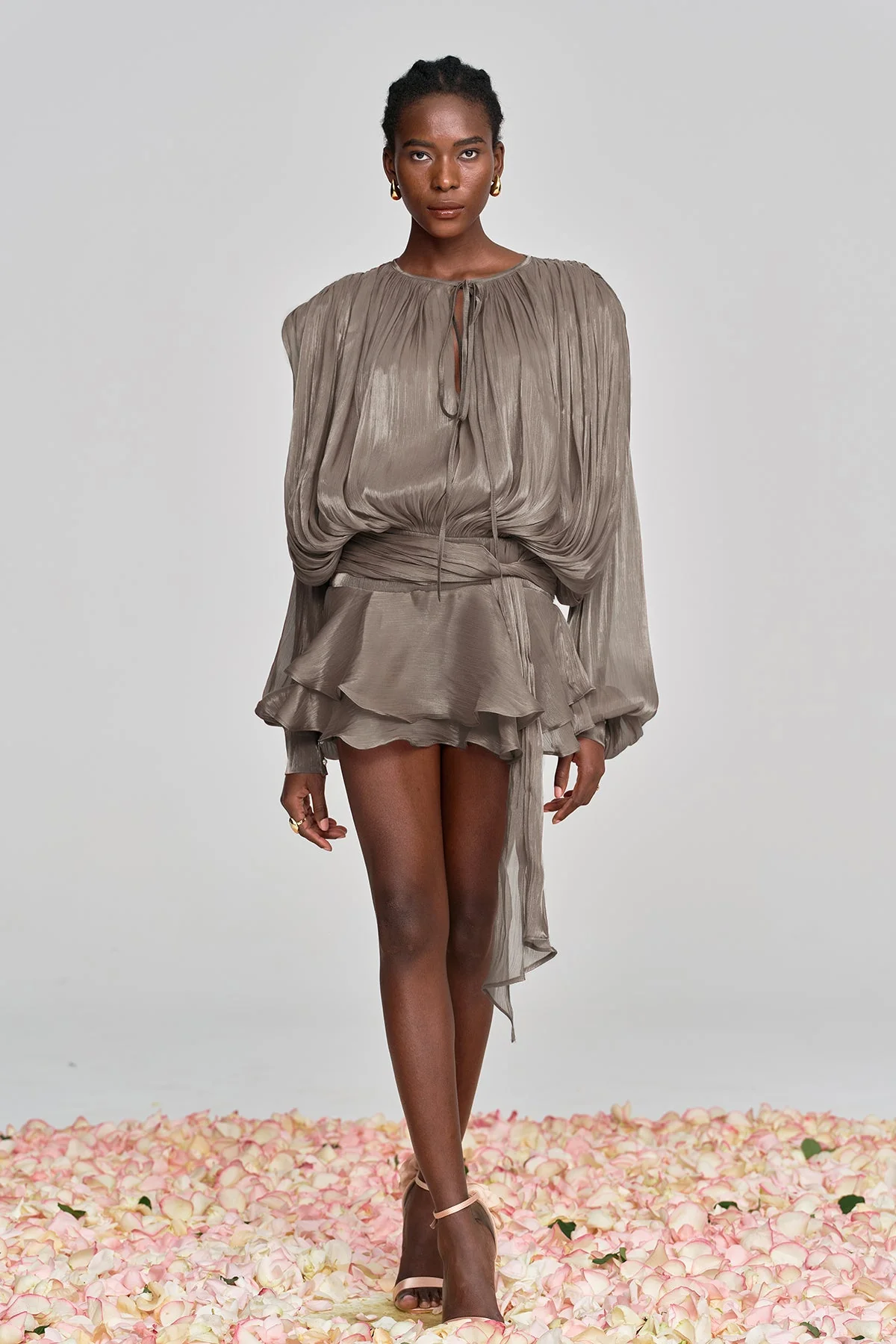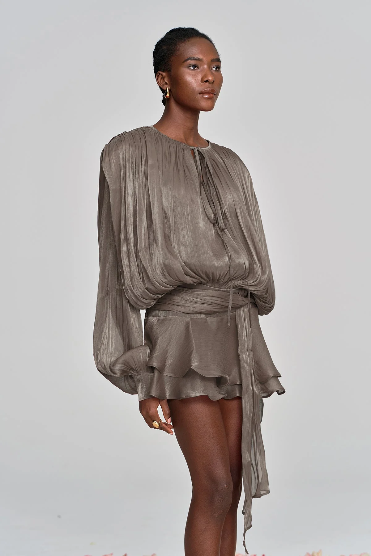 Experience elegance and playfulness with our Brown Ruched Ruffle Mini Dress. This unique and fashionable dress features balloon sleeves, ruched details, and a ruffled hem, making you stand out in style. Crafted from a rich brown fabric blend of 50% Polyester and 50% Cotton with a slight stretch for comfort. Care Instructions: Machine wash gently. Please note, the color may vary slightly due to lighting. Elevate your wardrobe with this stunning piece!