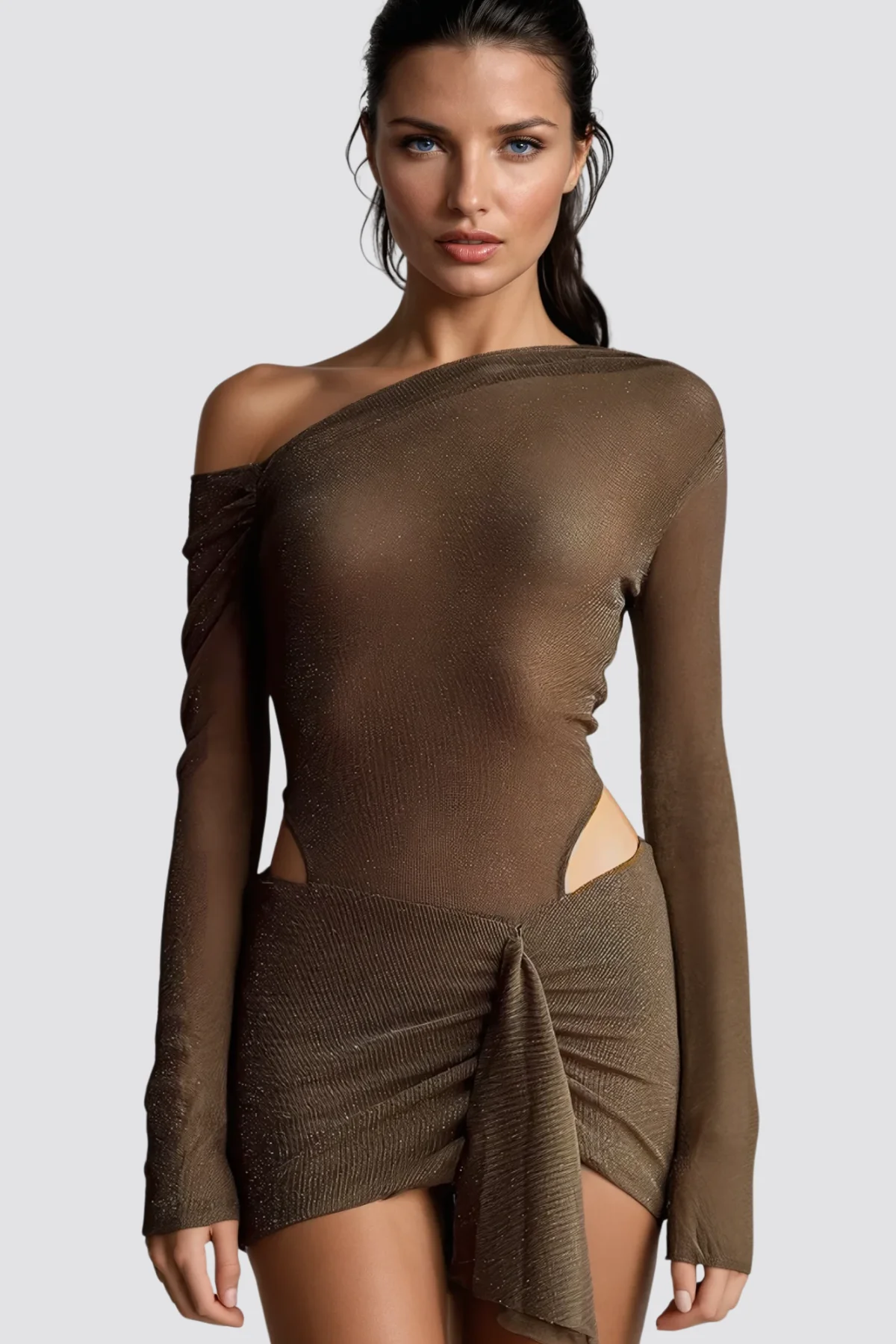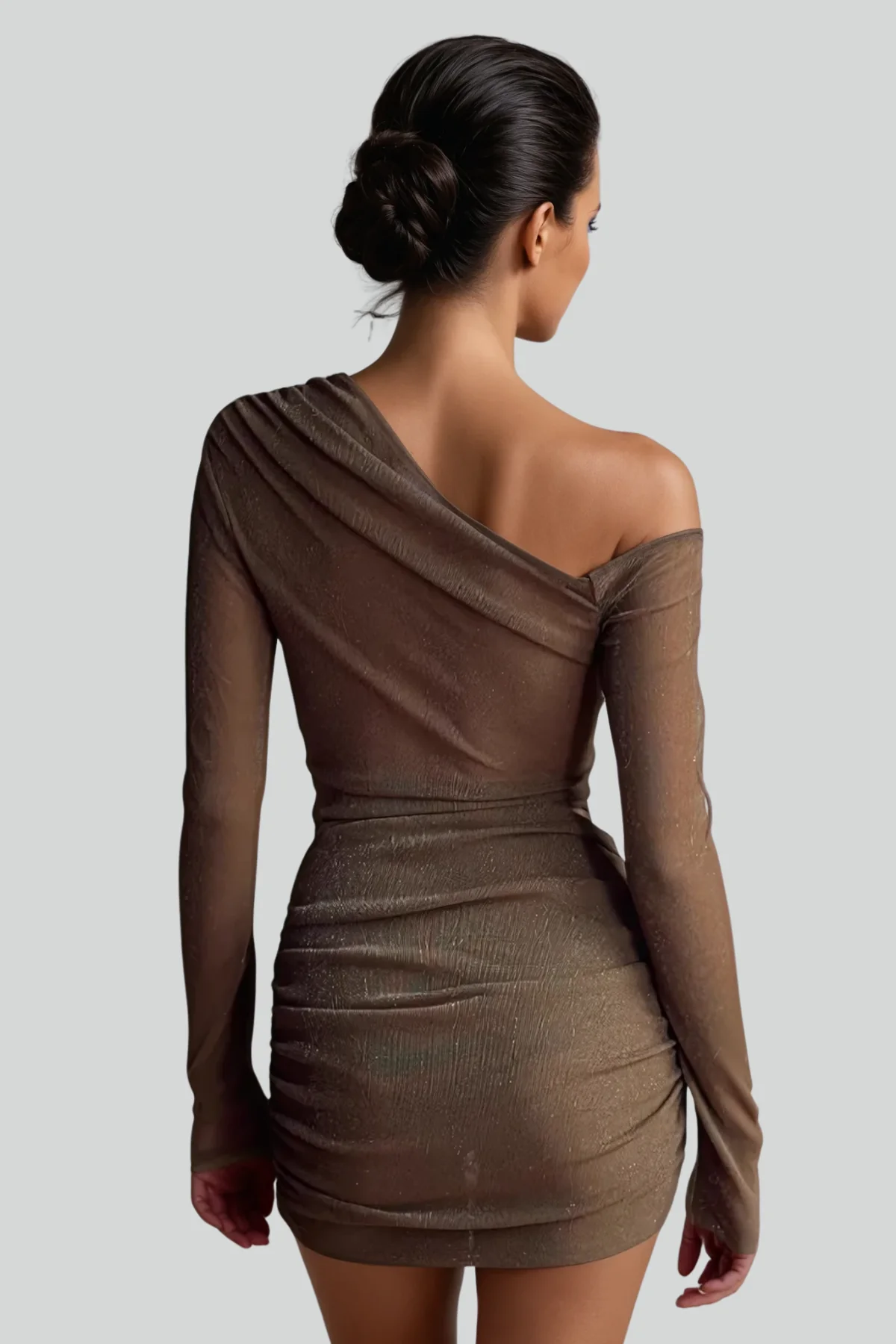 Elevate your evening wardrobe with this sophisticated Brown Sequin Asymmetric Mini Dress . Crafted with a striking asymmetric hem and shimmering sequin detailing that catches the light elegantly, this tailored dress enhances your silhouette for special occasions. The mini length offers a modern edge, combining glamour with comfort for those who value quality and refinement in their party attire. The non-stretch fabric requires gentle machine wash. Please note that the actual color may vary due to lighting conditions.