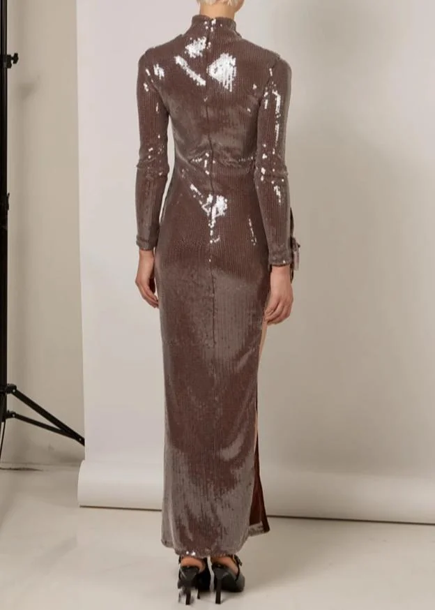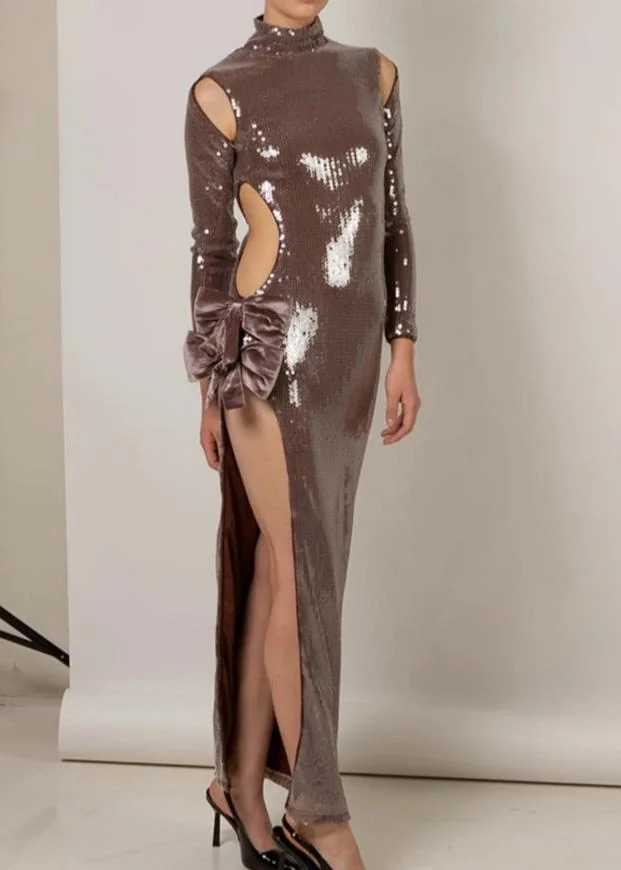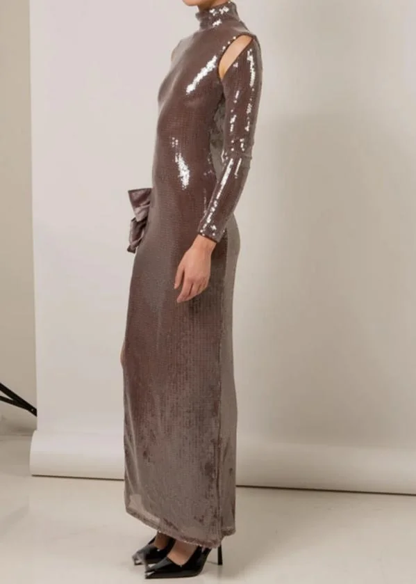 Elevate your style with our stunning brown sequin maxi dress featuring a flattering peplum bustier design and elegant bow detail. The mock neck, cut-out detail, and concealed back zipper add a touch of sophistication. Made from 100% polyester for comfort. This dress is perfect for any occasion, making you stand out effortlessly. Ensure a perfect fit by referring to our size chart. Order now to own this unique and stylish piece that is sure to turn heads.