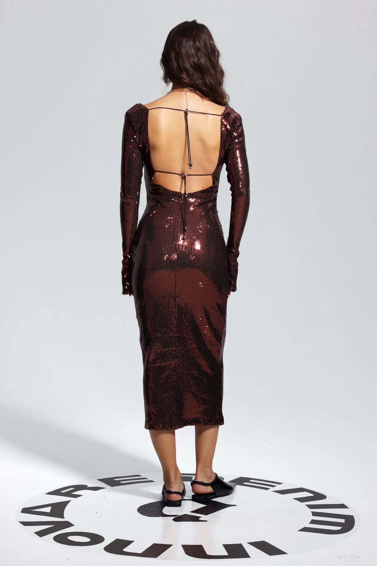 Elevate your evening wear with our stunning Brown Sequin Midi Dress. This dress features intricate sequin detailing in a rich brown hue that will have you shining all night long. With its midi length, its perfect for showing off your legs while still providing coverage. Sparkle and stand out in style with this chic dress . Made of 100% Polyester with a gentle hand wash care routine. Please note, color may vary slightly due to lighting differences. Get ready to radiate elegance and style with this timeless piece.