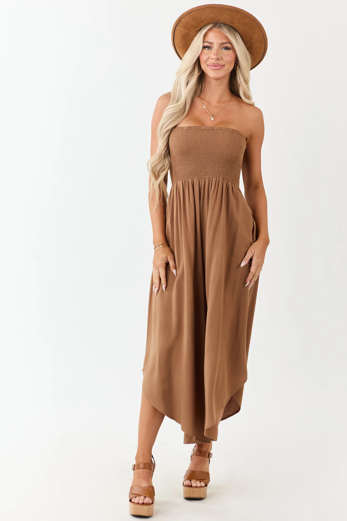This comfortable and breezy strapless jumpsuit in a rich cognac color features a stretchy smocked bodice, flowy wide leg, and side pockets. The cropped leg, rounded high-low hemline, and 100% Rayon fabric ensure a flattering and free-spirited silhouette. With sizes ranging to XL, this jumpsuit is perfect for any occasion. Make a fashion statement with this trendy, versatile attire.
