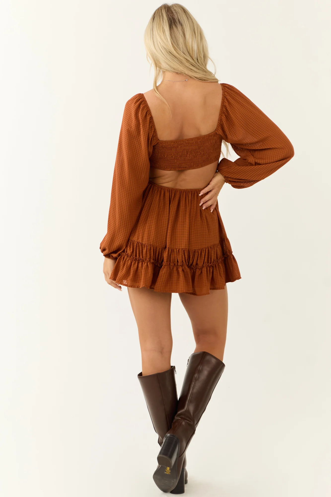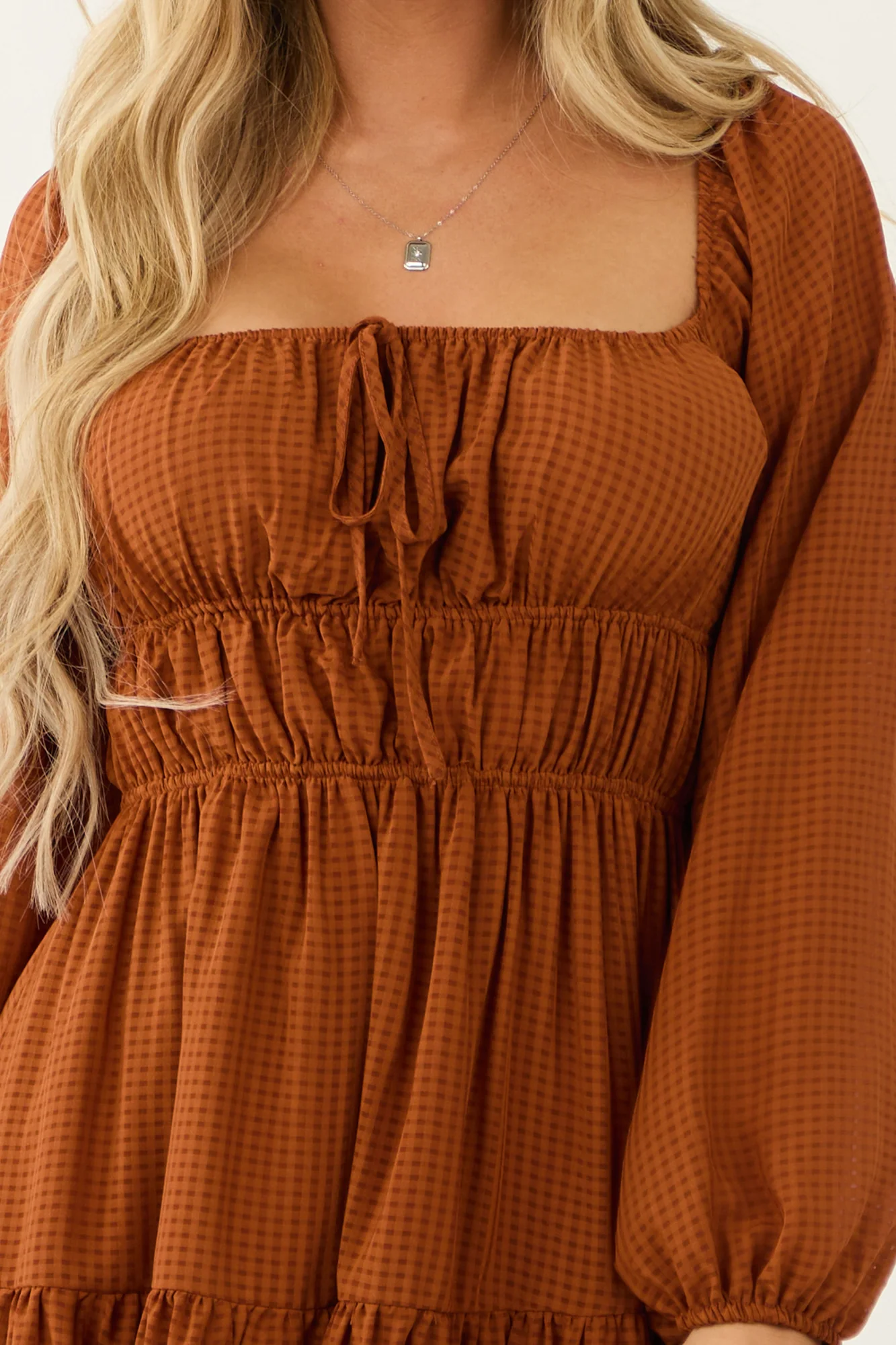 This elegant brown mini dress features puff sleeves and a square neckline. Available in sizes XS to L, it offers a comfortable fit with non-stretchy woven fabric. The dress includes off-the-shoulder options, a ruffle hemline, elastic cuffs and neckline, front tie detail, and a smocked open back. The mesh puff sleeves and lining in rust shade add a trendy touch. Made of 100% polyester (self) and 97% polyester, 3% spandex (lining). Hand wash cold, do not bleach, dry flat, and iron at low heat. Perfect for both daytime and date night occasions.