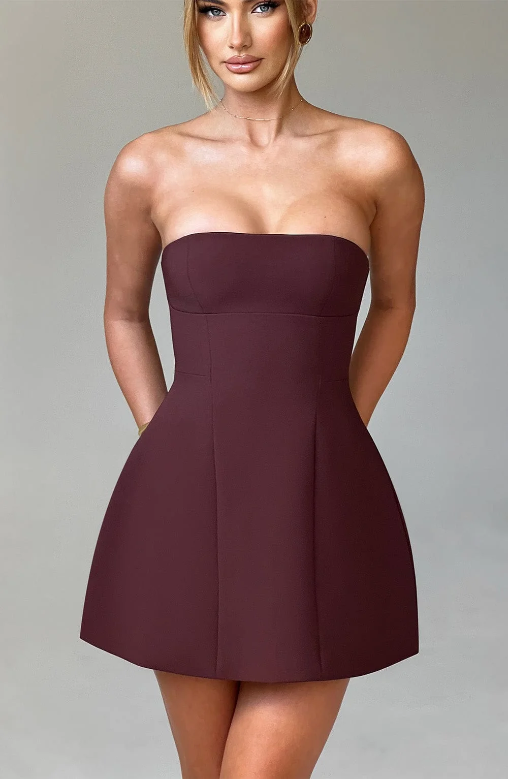 The versatile Brown Strapless Bubble Mini Dress is the epitome of chic fashion. Crafted from premium non-stretch crepe, this dress features seam details, a flattering bubble shape skirt for added volume, and an invisible zip fastening. Whether its a date night or a party, this dress hugs your figure beautifully. Fully lined for comfort. Model is wearing size XS. Elevate your wardrobe with this seasons must-have dress.