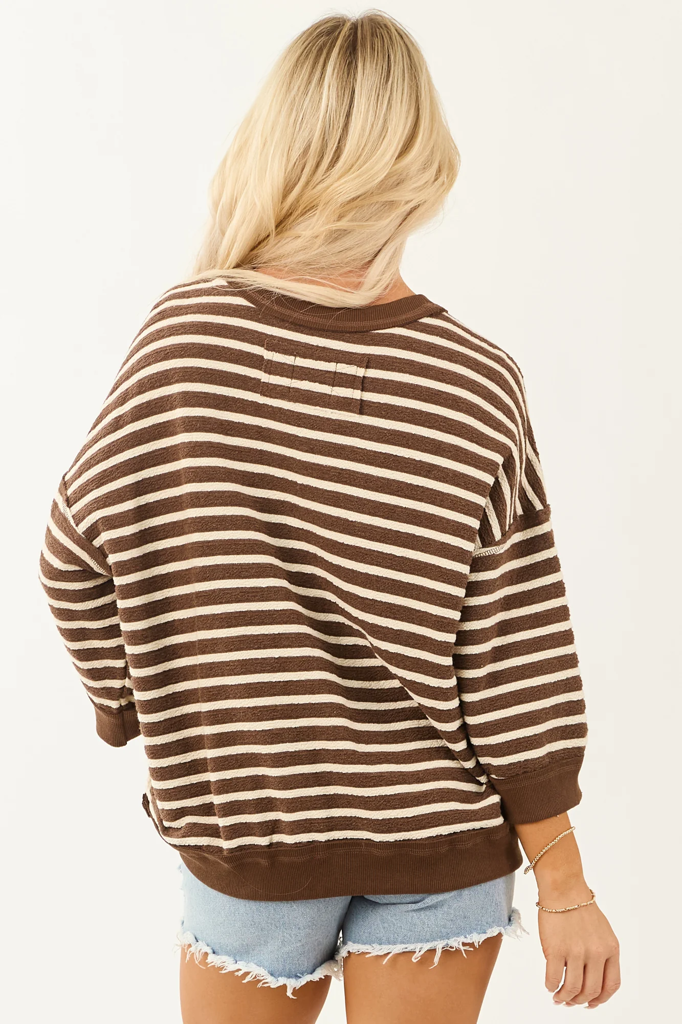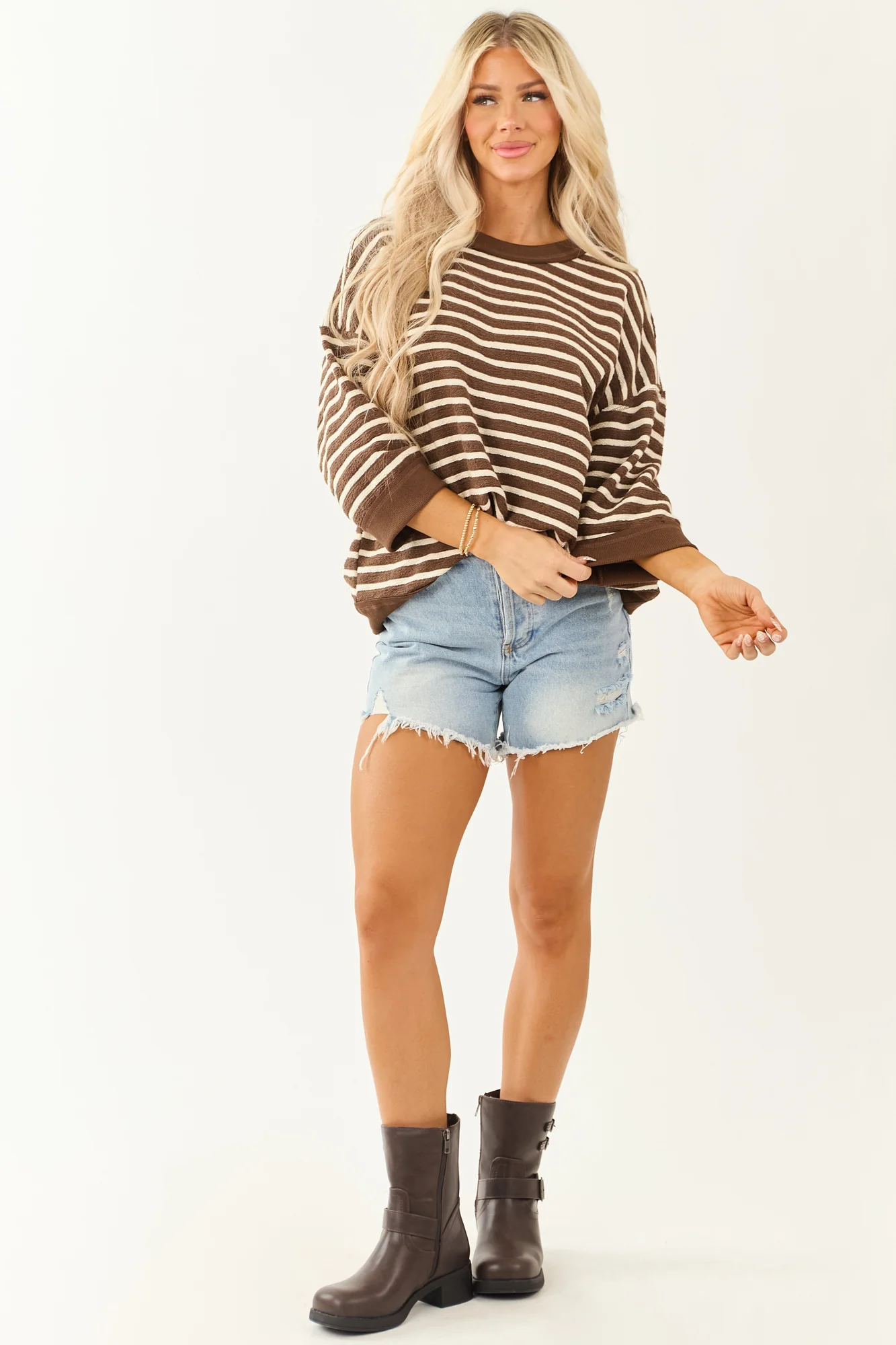 Stay cozy in transitional weather with this brown stripe 3/4 sleeve oversized sweater top made of 100% cotton for soft, breathable comfort. Perfect for layering up, this top features white stripes, drop shoulders, and raw banded trim. The stretchy textured knit ensures a relaxed fit. Available in sizes S, M, and L, with bust measurements of 54″, 57″, and 60″, lengths of 25″, 25.5″, and 26″, and sleeve lengths of 12″, 12.5″, and 13″. Imported. Model is wearing a size Small. Size 3, Height 57″, Bust 35″, Waist 26″