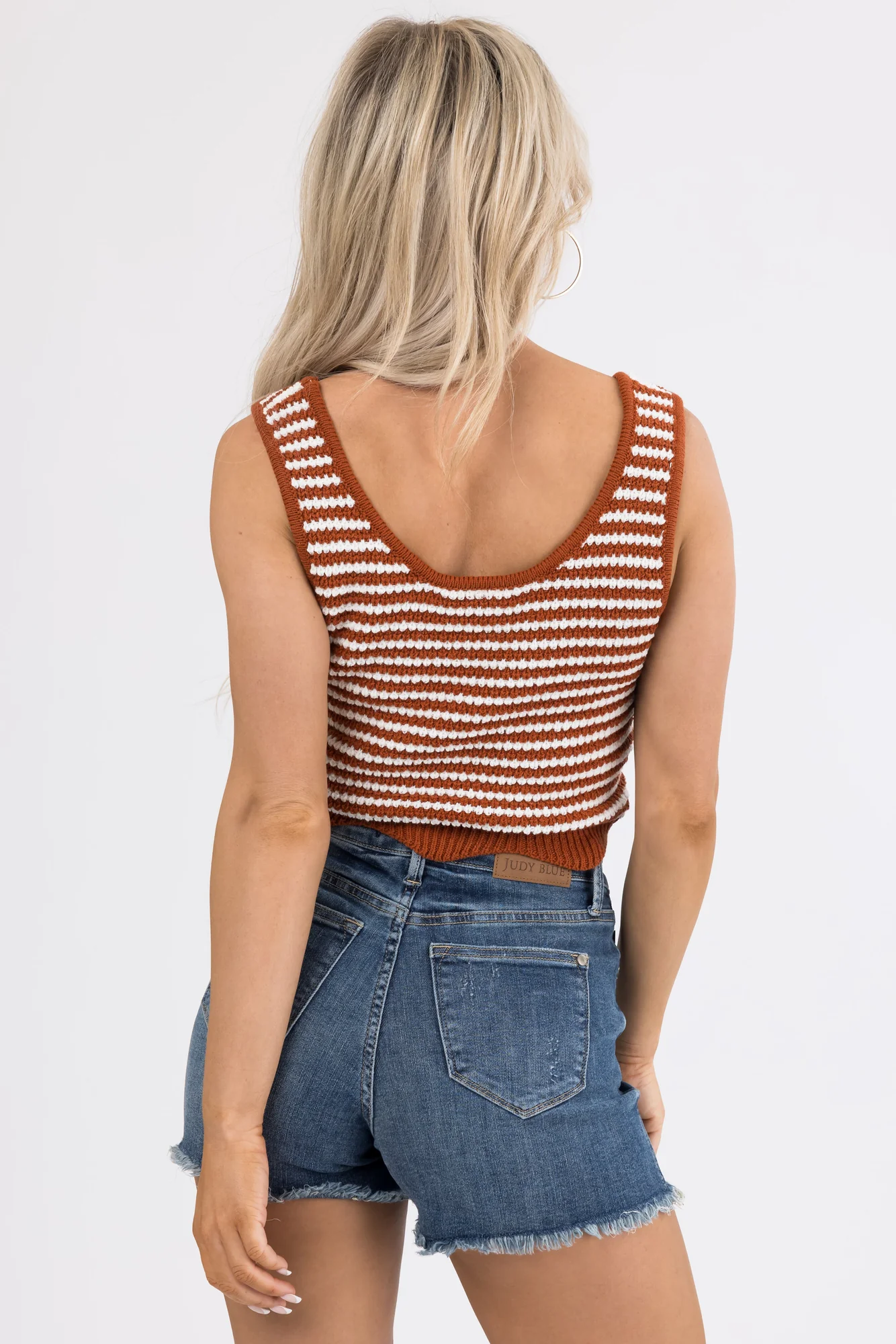 Stay stylish and comfortable in this Brown Striped Knit Tank Top . Made of a stretchy textured knit blend, this sleeveless top features a deep round neckline, scallop hem, and trendy stripes in Spice and Ivory colors. Perfect for casual and daytime wear, this top is versatile and easy to care for. Available in sizes S/M and M/L.