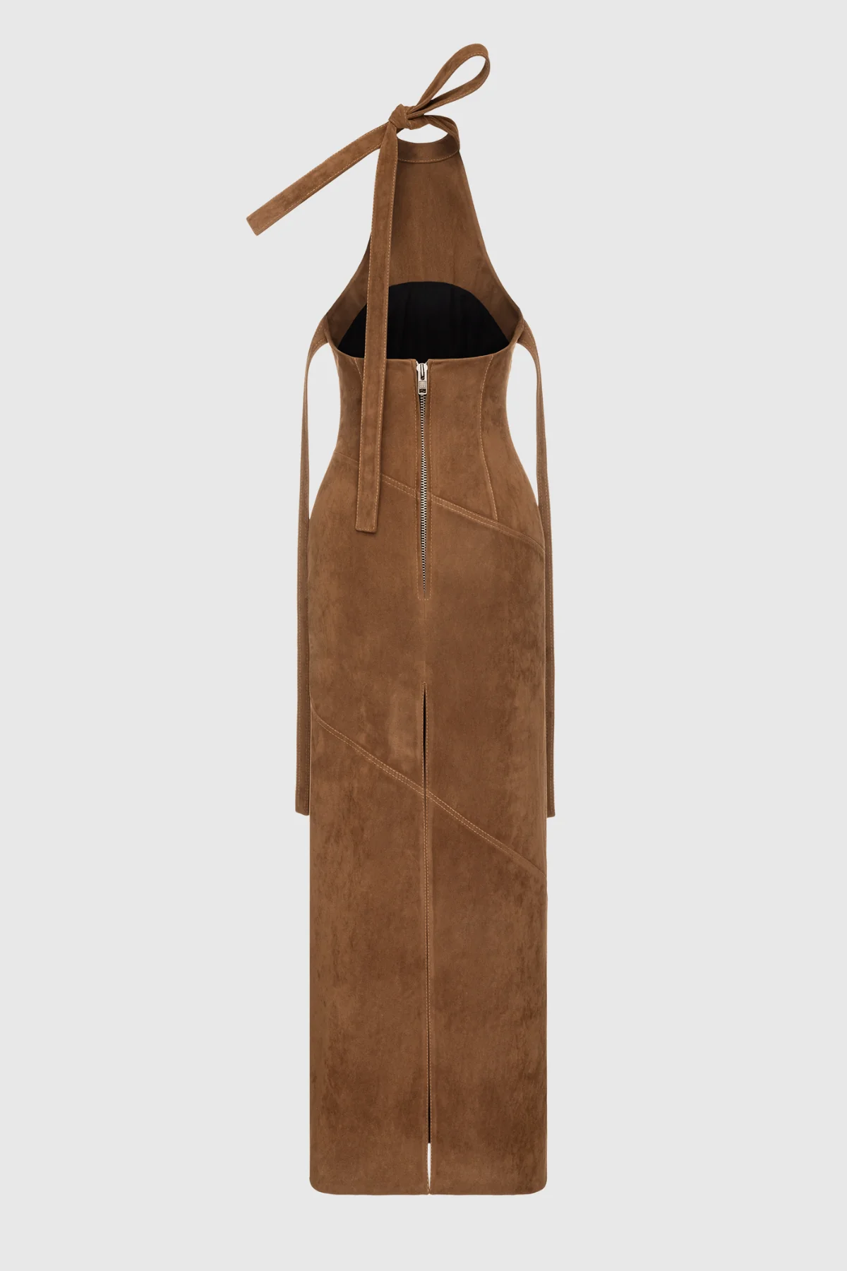 Elevate your wardrobe with our Brown Suede Halter Neck Maxi Dress, designed from premium suede for a luxurious feel. The halter neck style beautifully accentuates the shoulders, while the maxi length enhances graceful movement and coverage. This dress fuses sophistication with modern elegance, perfect for evening occasions where a refined presence is a must. The non-stretch fabric is easy to clean with a gentle machine wash. Please note that actual color may vary due to lighting. Order now and radiate elegance effortlessly!