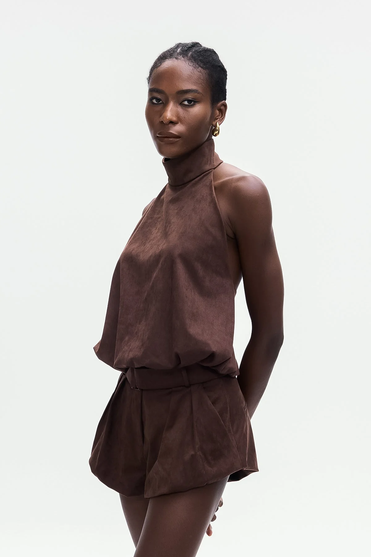 Elevate your wardrobe with the luxurious Brown Suede Halter Neck Top . Made of high-quality suede, this top features a stylish halter neck design for a chic and sophisticated look, blending urban edge with timeless elegance. Perfect for any occasion, it offers both style and comfort. This top is a must-have addition for a versatile, fashion-forward wardrobe. Material: 50% Polyester, 50% Cotton. Stretch Factor: Non-Stretch. Care Instructions: Gentle machine wash. Please note, color may vary due to lighting variations in images.