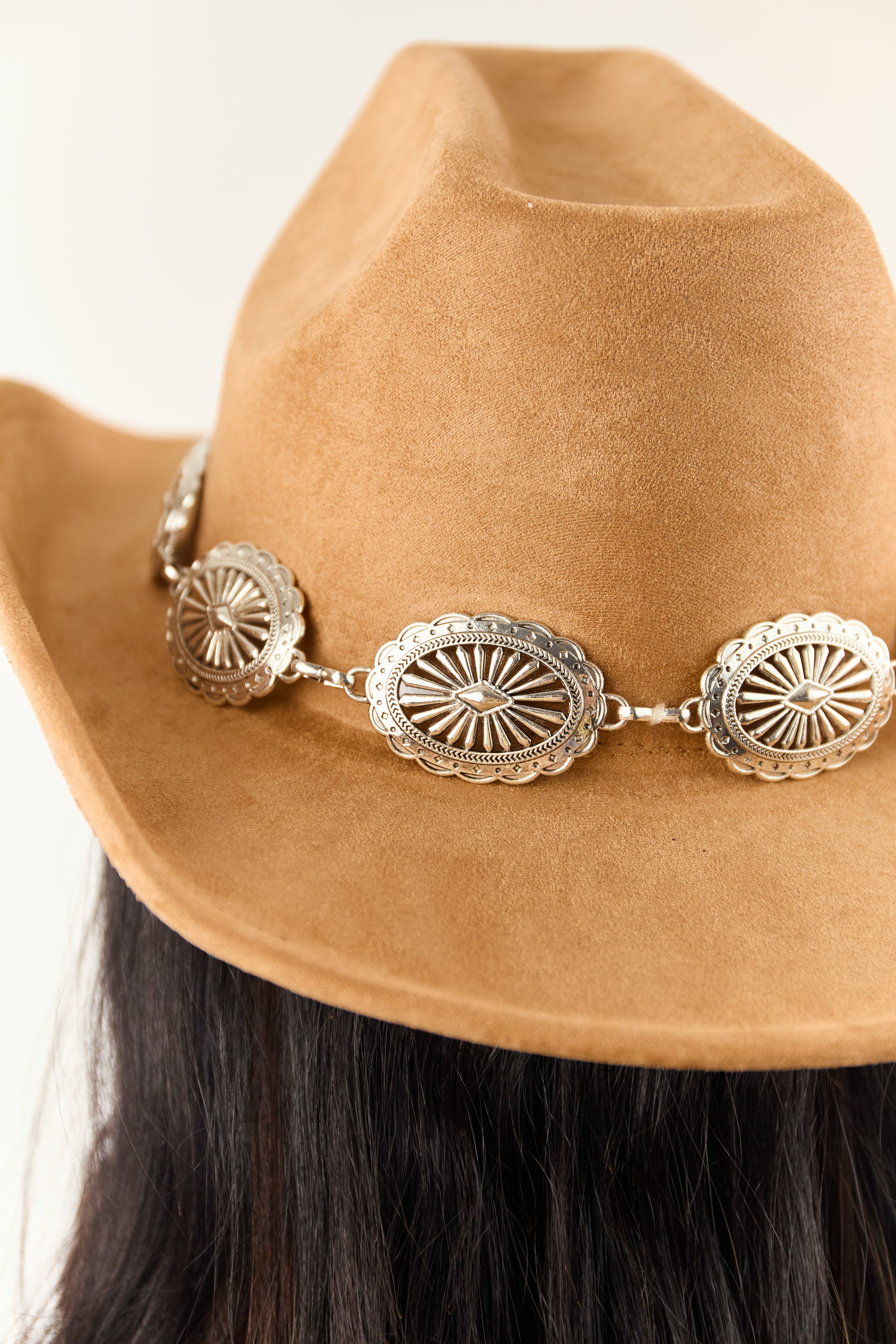 Upgrade your Western look with this brown suede cowboy hat featuring a unique concho disc detail. Made of high-quality faux suede, it boasts a curved brim, dented crown, and comfortable fit. Stand out with this stylish and versatile accessory that complements any outfit effortlessly. This hat has a height of 5 inches, a 3-inch brim, and a 24-inch circumference. Crafted from 90% Polyester and a touch of Alloy for durability. Perfect for anyone looking to add a touch of Western flair to their wardrobe!