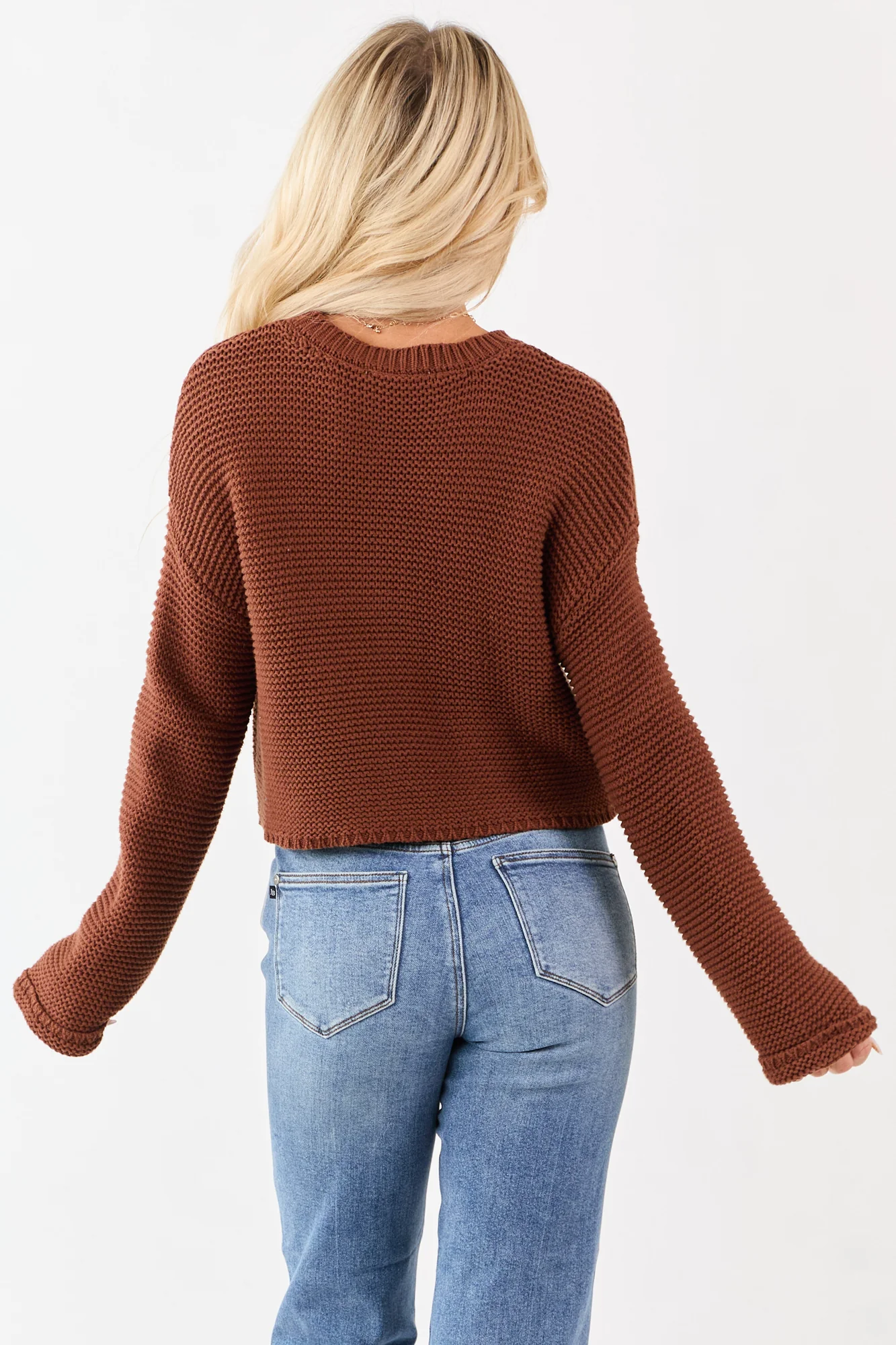 The Spice Textured Knit Long Sleeve Crop Sweater comes in sizes Small, Medium, and Large, featuring a relaxed fit with wide sleeves and a refined textured finish. Made from a stretchy knit blend of 60% Cotton and 40% Acrylic, this sweater includes semi-open knit, banded rolled cuffs, drop shoulder design, and is imported. The model is wearing a size Small, with a profile of Size 3, Height 57″, Bust 35″, Waist 26″.
