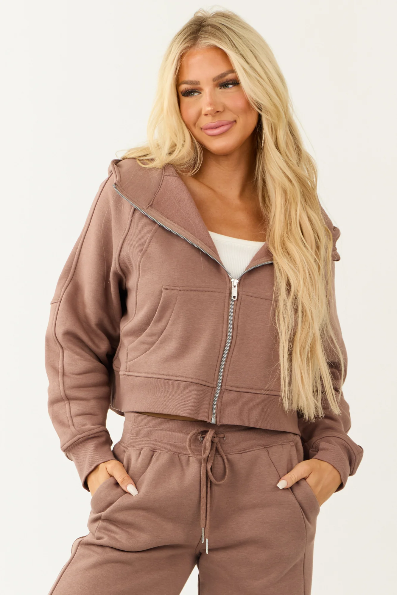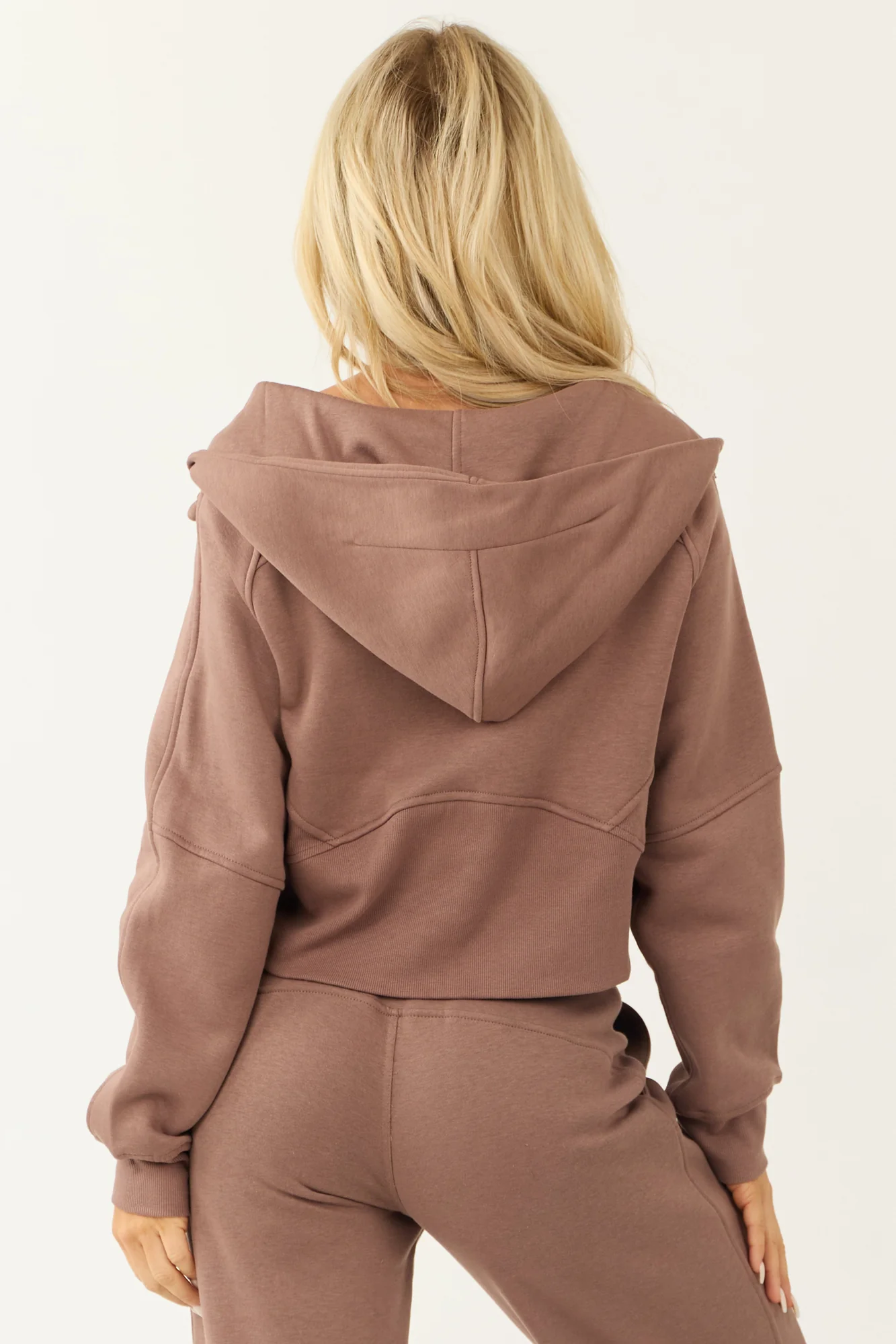 Stay cozy in this Brown Zip-Up Knit Hoodie with Thumbholes, available in sizes S, M, and L. The stretchy knit material and fleece lining provide warmth and comfort. This mid-length hoodie features a zip-up front, front pockets, and a hood for added style and functionality. Made of a blend of cotton, polyester, and spandex for a perfect fit. Machine wash cold for easy care. Perfect for casual wear or lounging. Model is wearing a size Small.