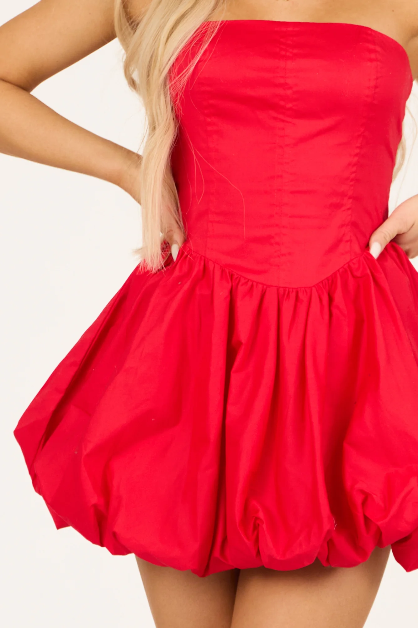 This stunning Bubble Hem Corset Style Mini Dress in red is a wardrobe essential for those special occasions. Made from 97% cotton and 3% spandex, it offers a perfect fit with a drop waist design and an elastic bubble hem. The strapless neckline enhances your elegance, while the pleated skirt details add a touch of sophistication. Stay comfortable and stylish in this lined dress, ideal for date nights and holiday parties. Dress length options: S (23″), M (24.5″), L (26″).