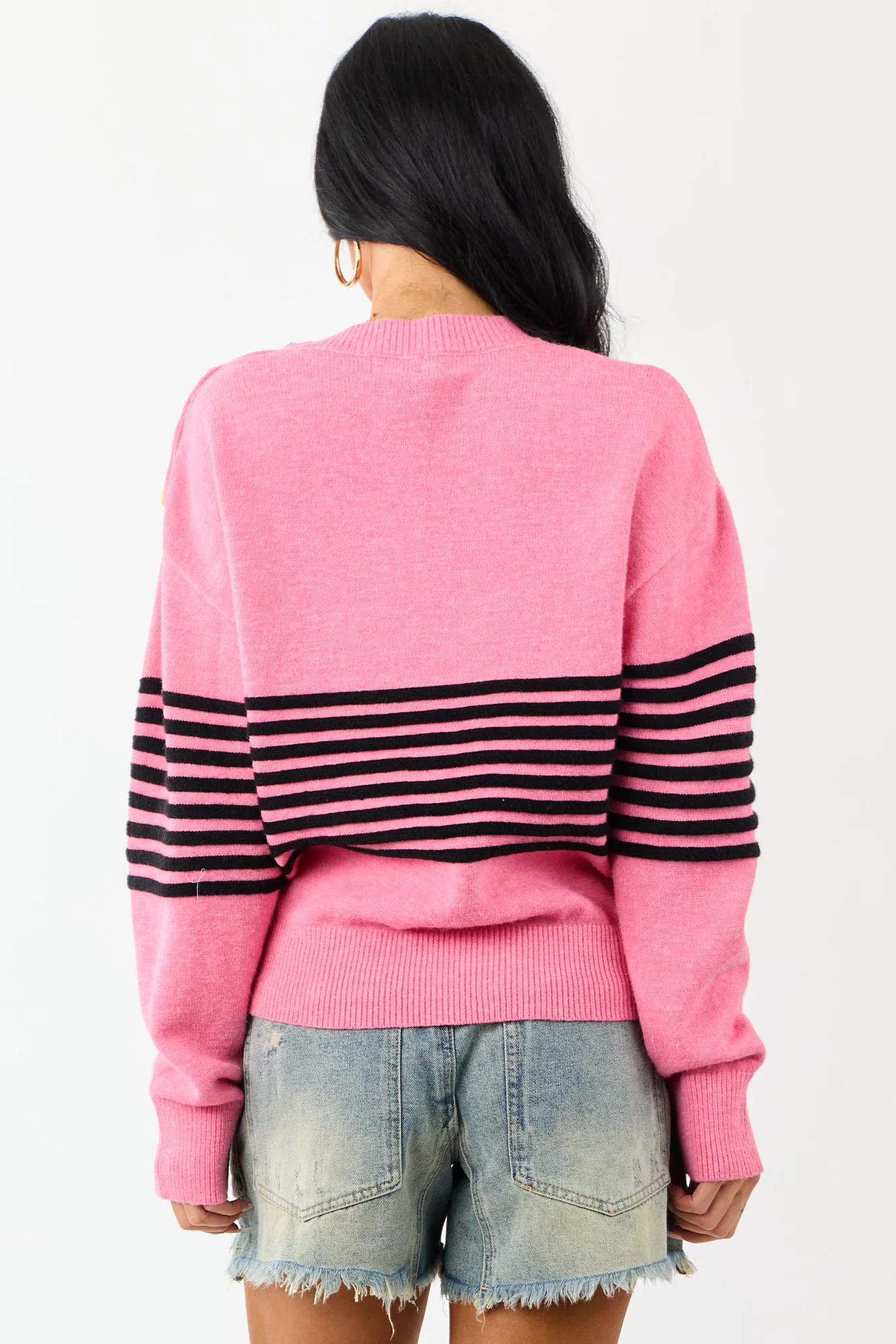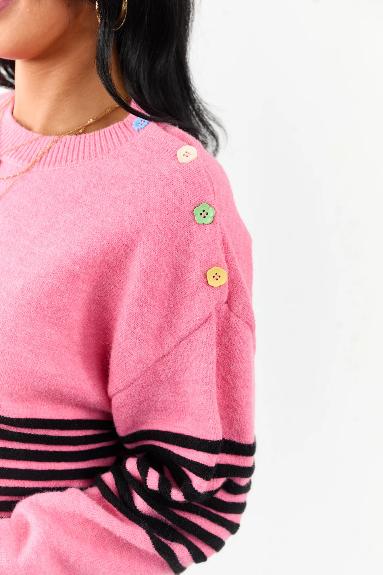 Elevate your style with our vibrant Bubblegum Striped Shoulder Button Sweater. Crafted with a relaxed fit and playful buttoned shoulder detail, this sweater features bright black stripes and colorful button accents. Made of a stretchy knit blend of Acrylic, Nylon, and Polyester, it offers comfort and style in one. Perfect for any casual or semi-casual occasion, this ribbed trim sweater is a must-have addition to your wardrobe. Available in sizes S, M, and L. Imported.