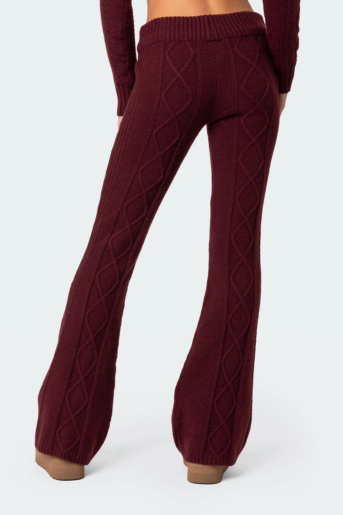Upgrade your wardrobe with our Burgundy Cable Knit Flared Pants. Crafted from a premium blend of Polyester and Rayon, these pants offer both style and comfort. The matching set design adds versatility to your outfits. Available in sizes XS to XL, these pants feature a flattering low-rise fit. Elevate your look with these chic and cozy pants. Model wears size S. Model height is 58. To keep them looking new, wash with similar colors.