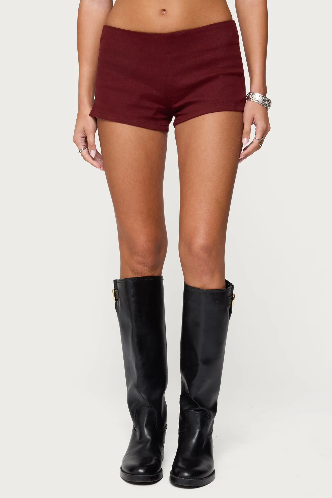 Upgrade your summer wardrobe with our Burgundy Denim Micro Shorts for women. Featuring a low-rise waist and side slit detailing, these shorts are made from stretch denim fabric (Cotton, Spandex) for a comfortable fit. Available in sizes XS to XL, with an inseam of 1.77 inches for size S. Machine wash at a maximum of 30ºC with similar colors. Say goodbye to boring shorts and embrace style and comfort with our trendy denim shorts.