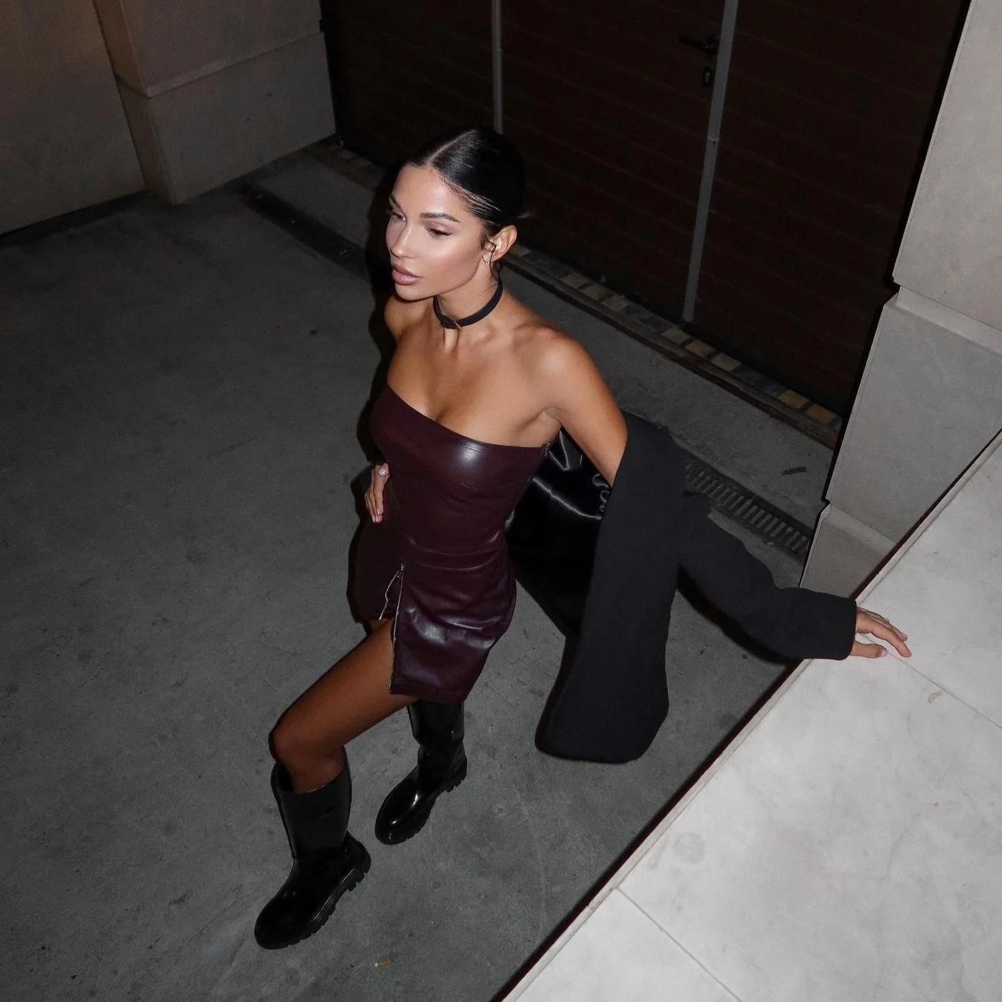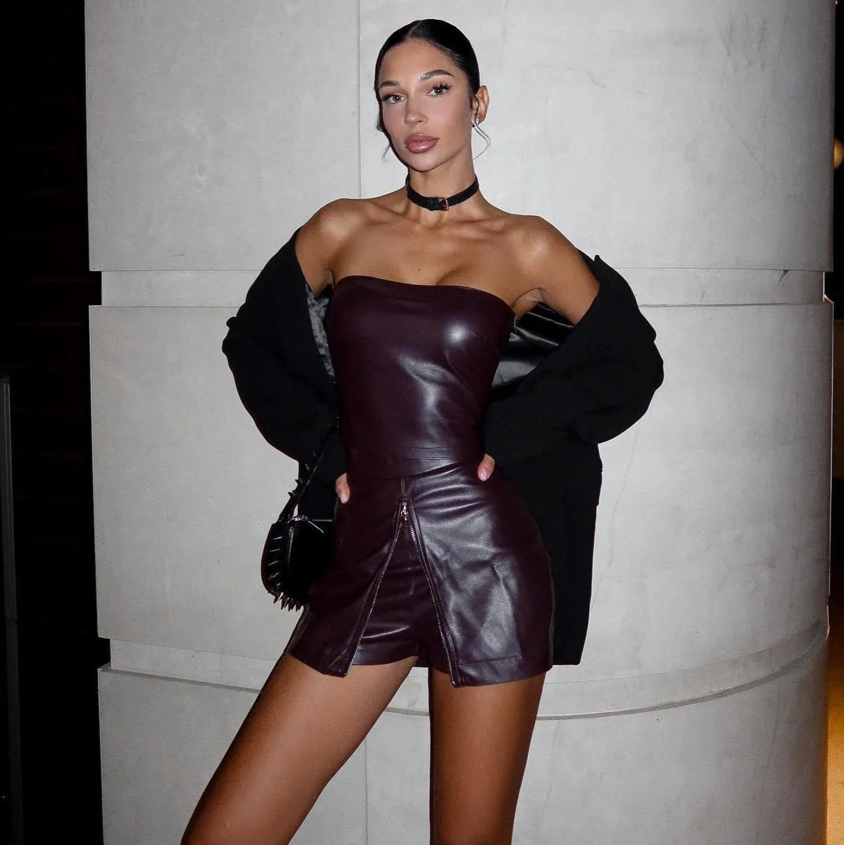 Make a bold statement with this rich burgundy Faux Leather Two-Piece Set. The strapless top offers a sleek, structured fit, while the high-waisted shorts feature a bold front zipper for added edge. Crafted from smooth faux leather, this set is perfect for any occasion, day or night. The deep burgundy shade adds a touch of luxury, and the structured fit flatters your silhouette effortlessly. Pair with heels for a striking look or layer with a jacket for versatility. Discover endless styling possibilities on Instagram @mermaid_way!
