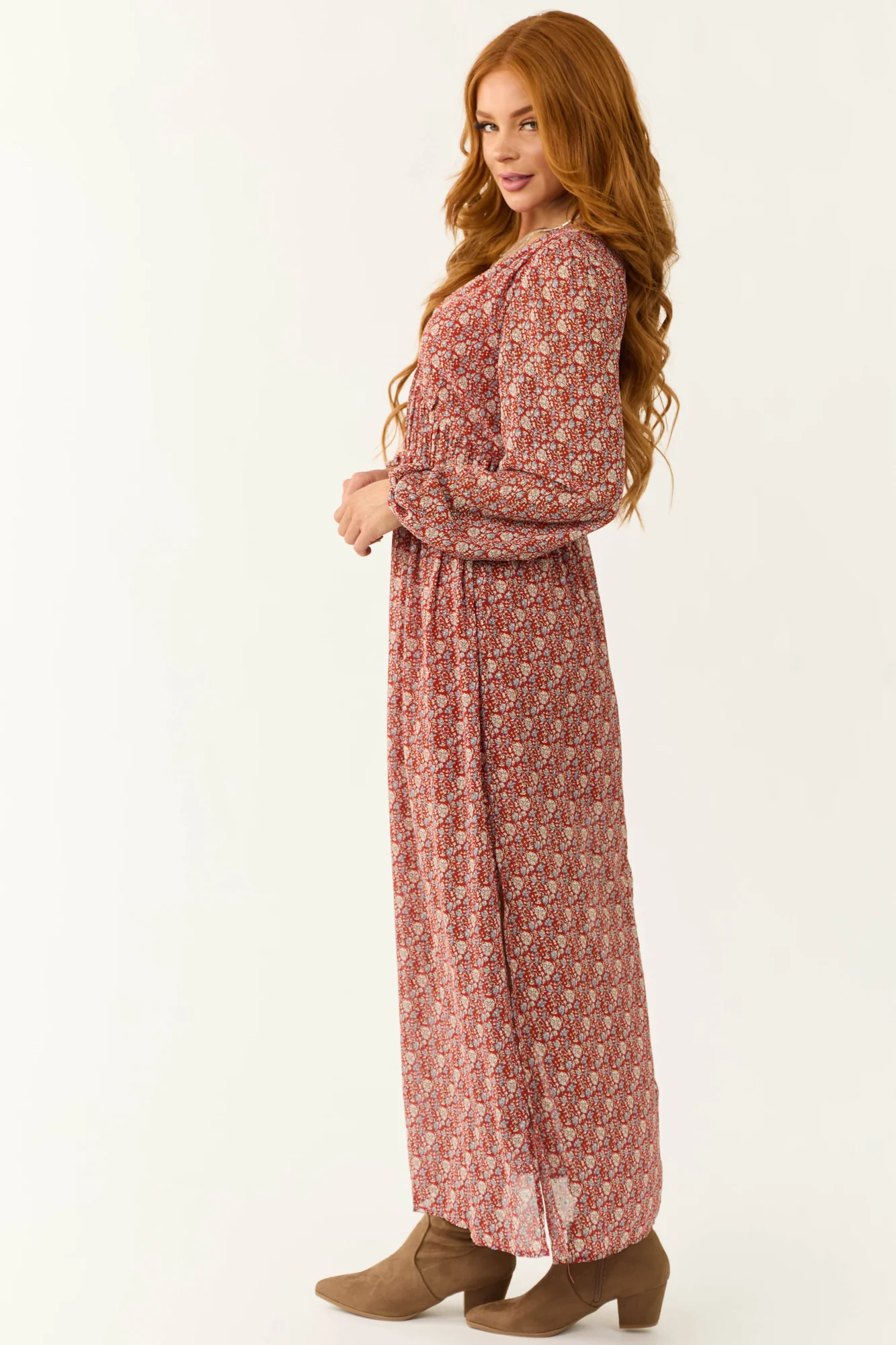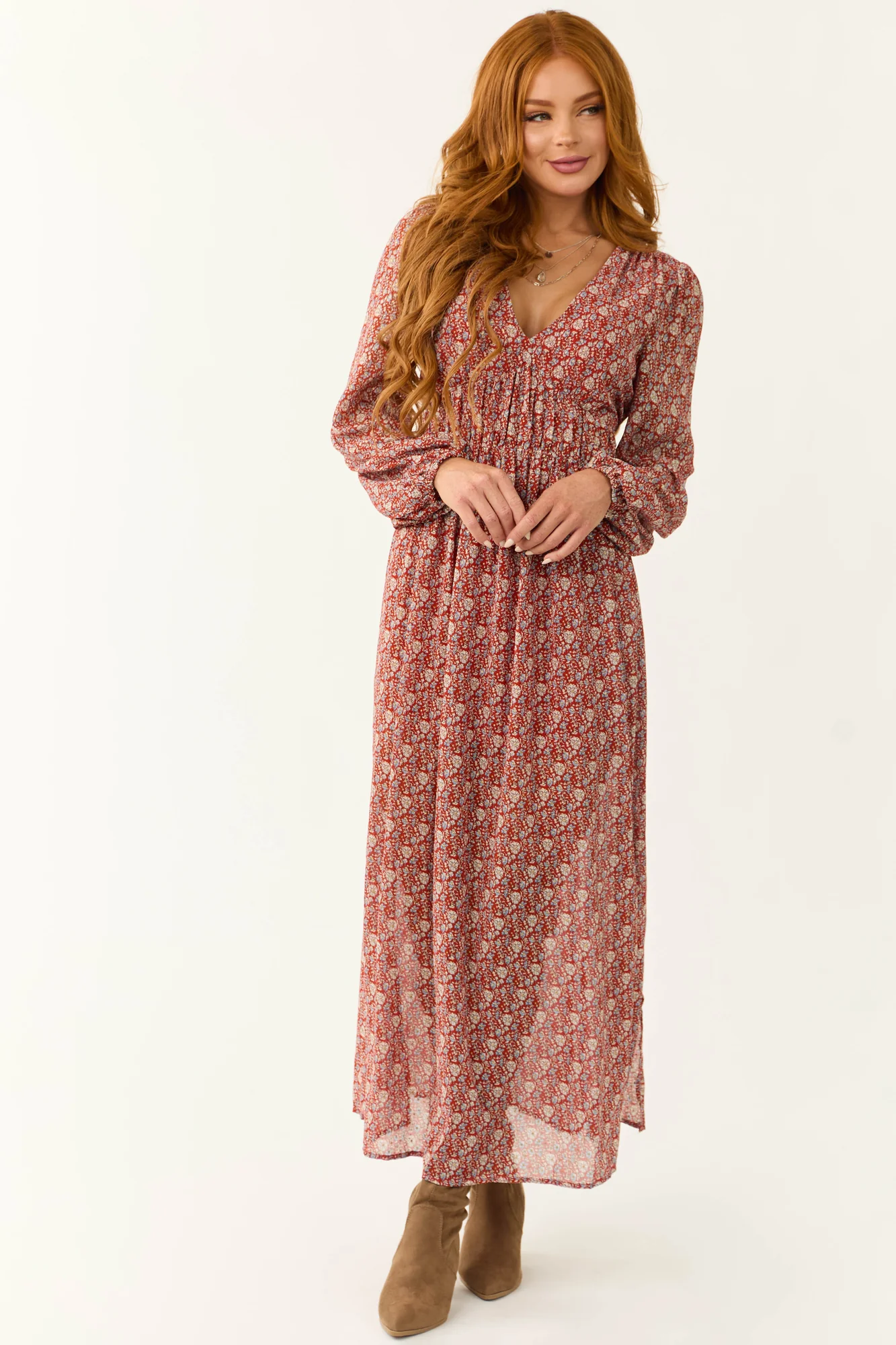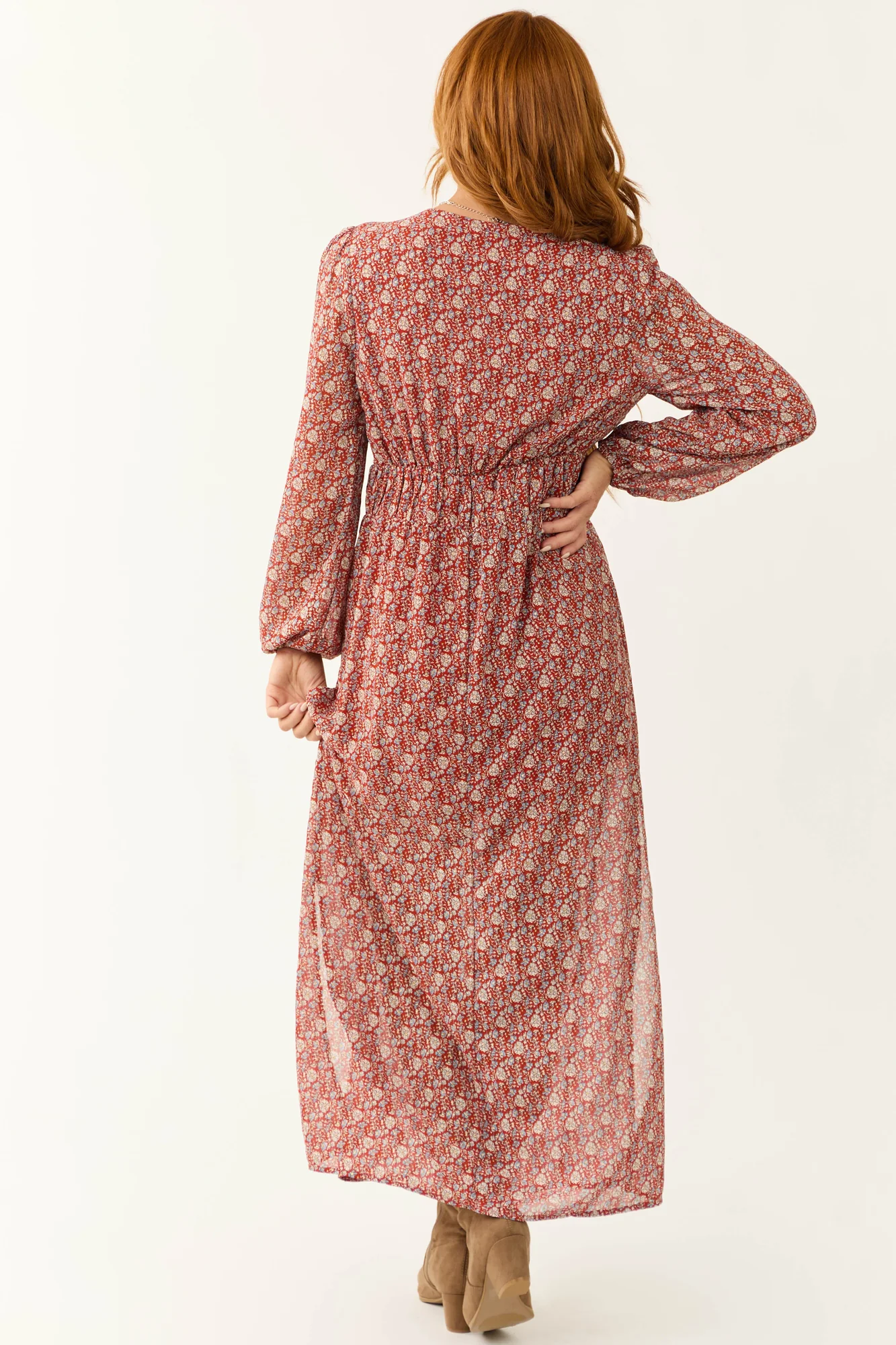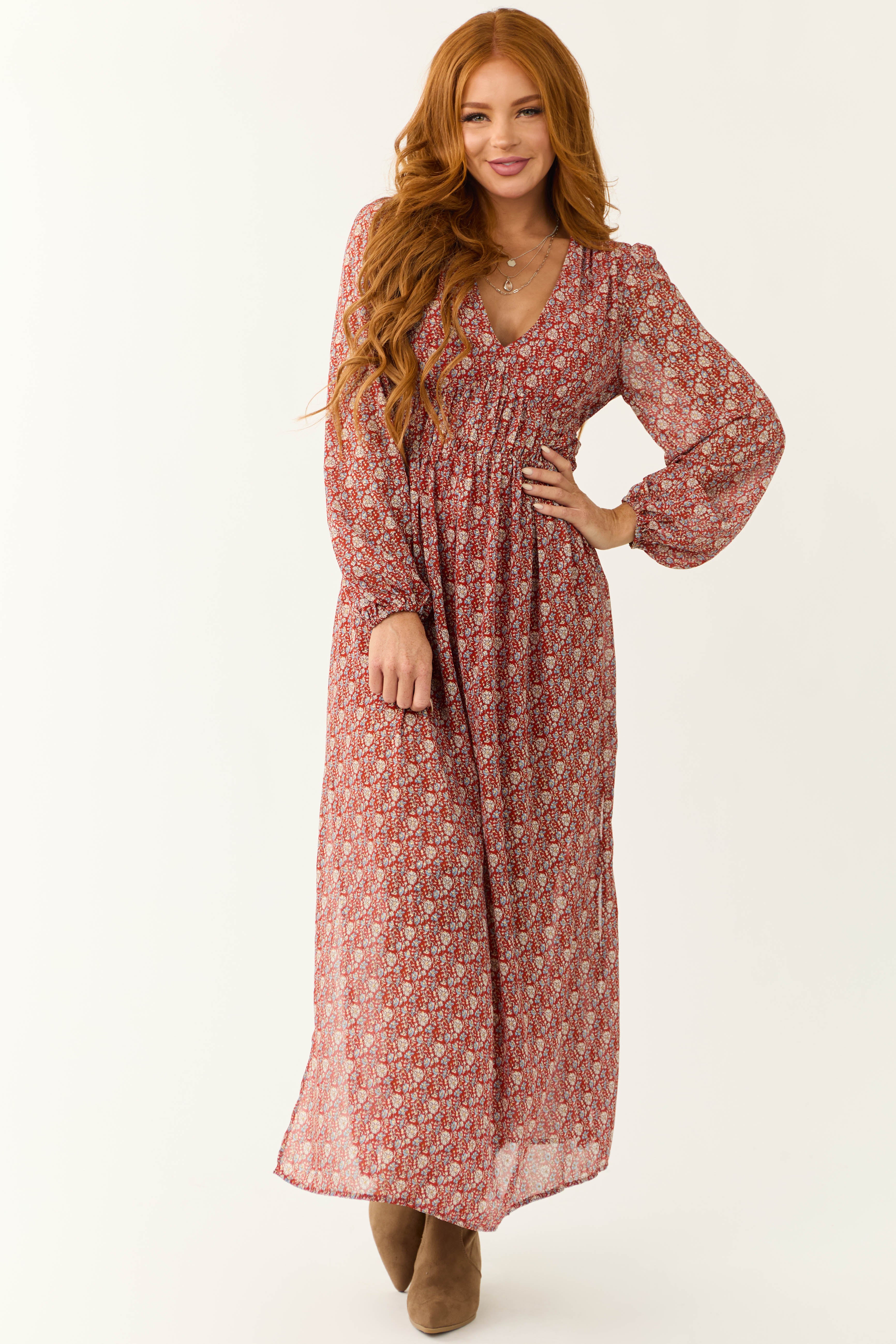 This beautiful Burgundy Ditsy Floral Print Maxi Dress comes in sizes S, M, and L with flattering measurements and charming details. With a V neckline, double elastic waist, slit up to the knee, and long puff sleeves, this maxi dress is perfect for date nights and wedding guests. The dress features a lovely floral print in Burgundy, Ivory, Metallic Gold, Periwinkle, and Steel Blue colors. Made of non-stretchy woven fabric and lined with 100% Polyester, this dress is ideal for a stylish look. Hand wash cold and hang to dry for best results. Model is wearing a size Small and is 55″ tall.
