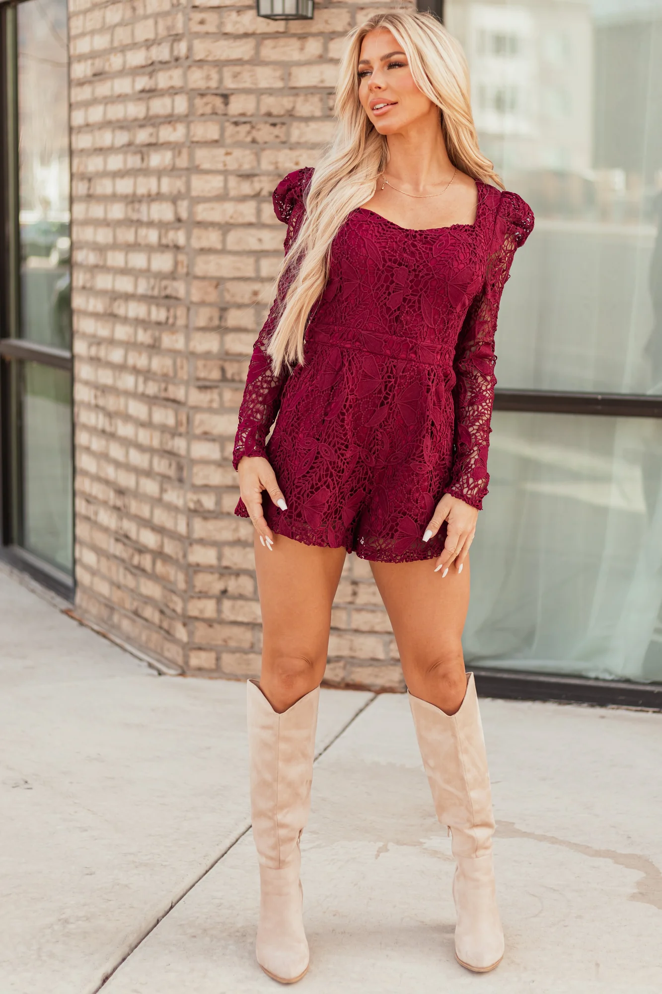 This stylish romper features a sweetheart neckline, long floral lace sleeves, and a non-stretchy woven fabric. Perfect for holidays or winter events, it comes in sizes S, M, and L. Make a statement with this romper that offers a comfortable fit and elegant look. Hand wash only.
