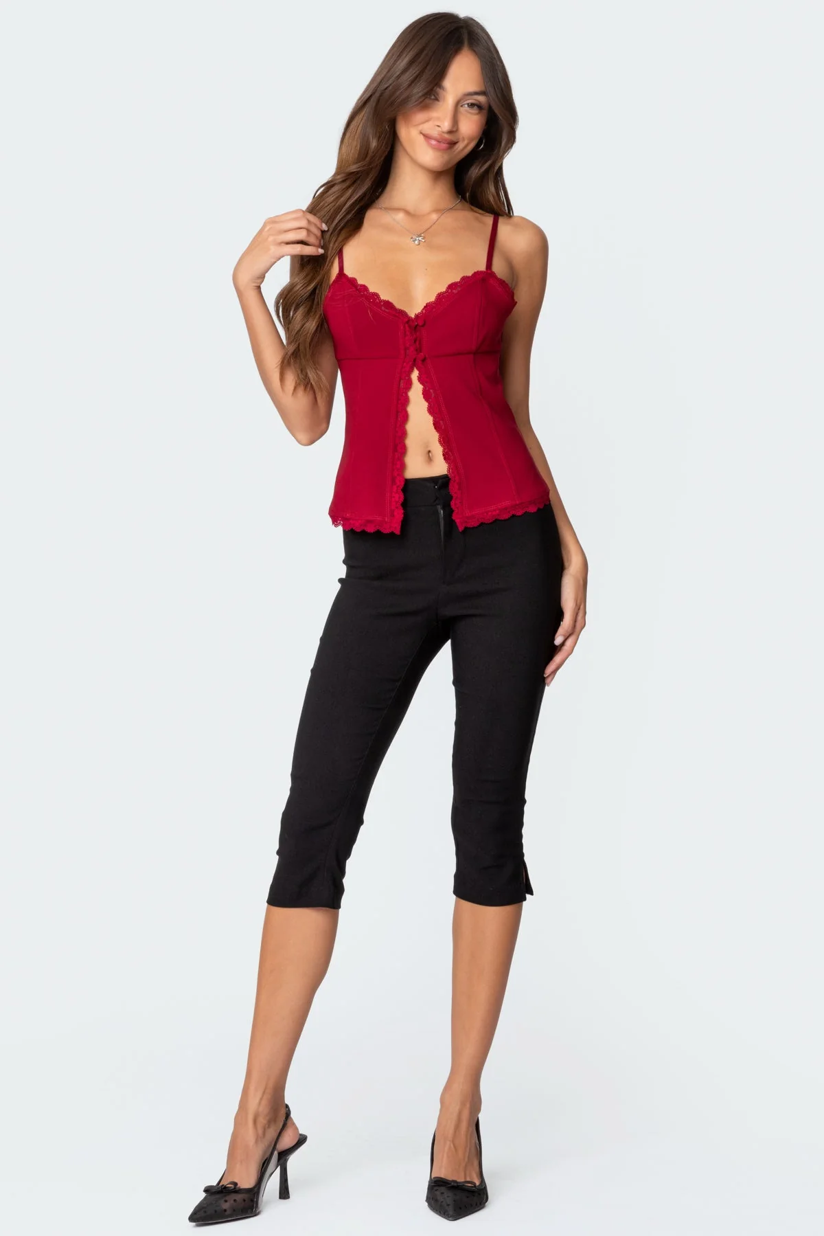 Elevate your style with our Burgundy Lace Trim Tank Top featuring adjustable straps, a split front design, and front button closures. Made of high-quality Polyester and Spandex blend, this top is perfect for any occasion. The lace trim adds a touch of femininity. Pair it with your favorite jeans or skirt for a versatile look. Machine washable for easy care.