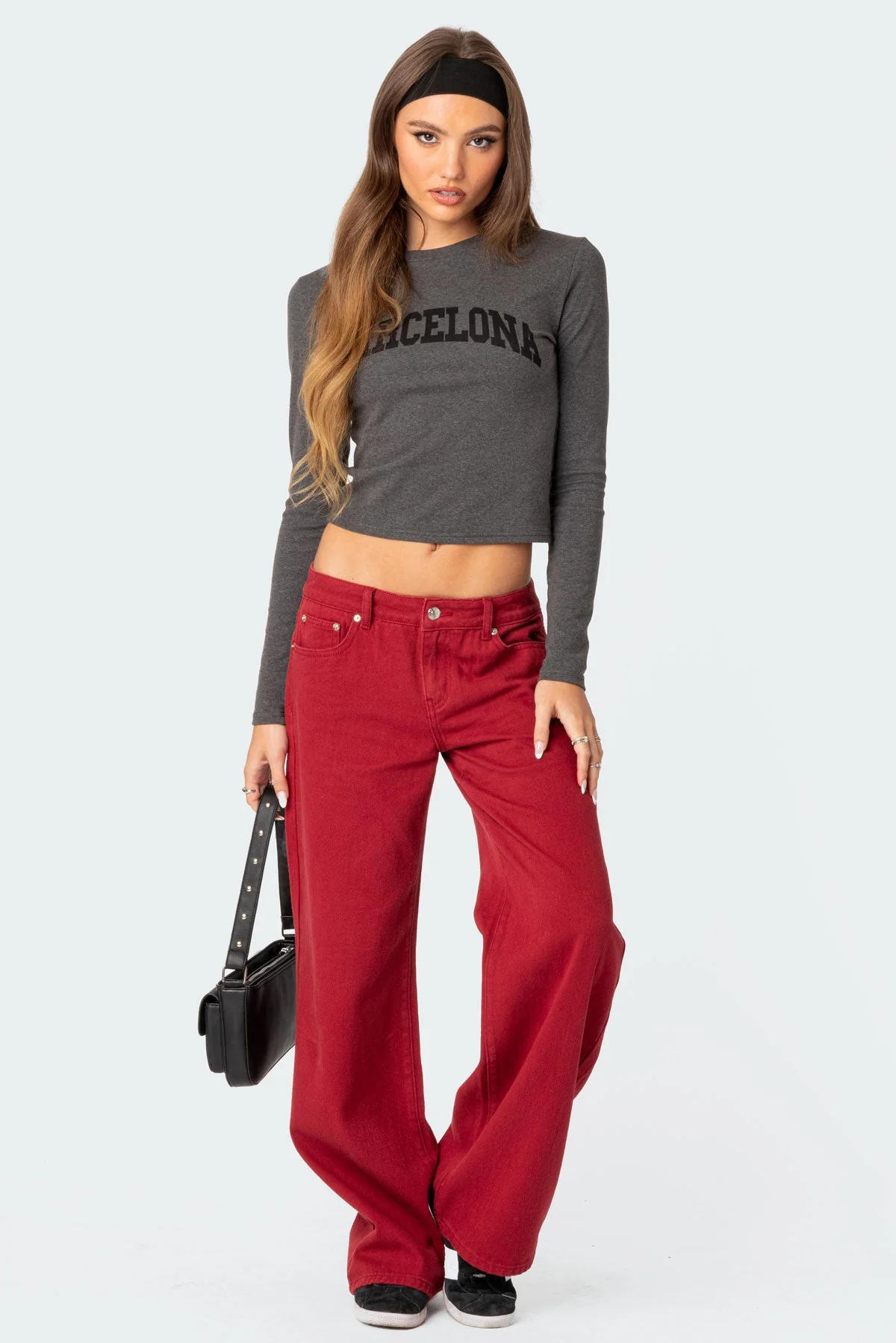 Upgrade your style with these burgundy low rise slouchy denim pants made from 100% cotton fabric for ultimate comfort. Perfect for all-day wear, these pants feature a stylish slouchy fit and a low-rise waist. Available in multiple sizes. Model wears size S, height 58. To care for the item, wash with similar colors.