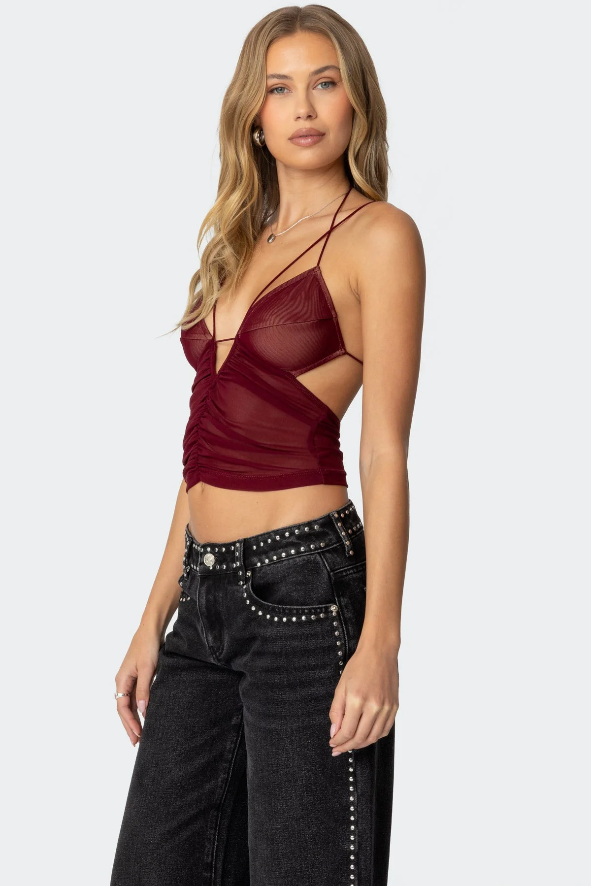 Elevate your style with our Burgundy Mesh Halter Top featuring side cut-out detailing, ruched center, and back tie closures. Made of Polyester and Spandex blend, this top offers a perfect fit. Suitable for machine wash at 30ºC, ironing at 110ºC, and tumble drying.