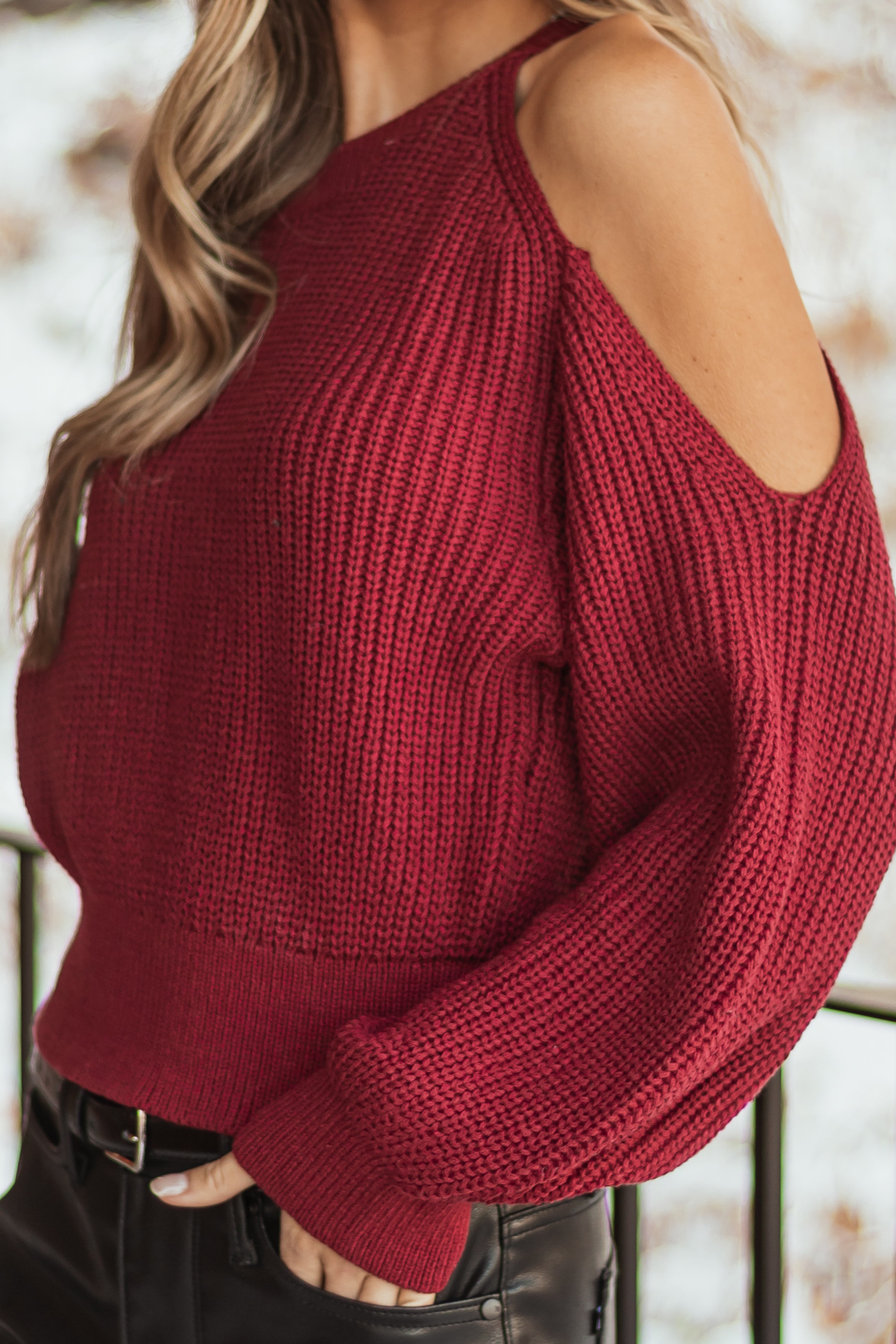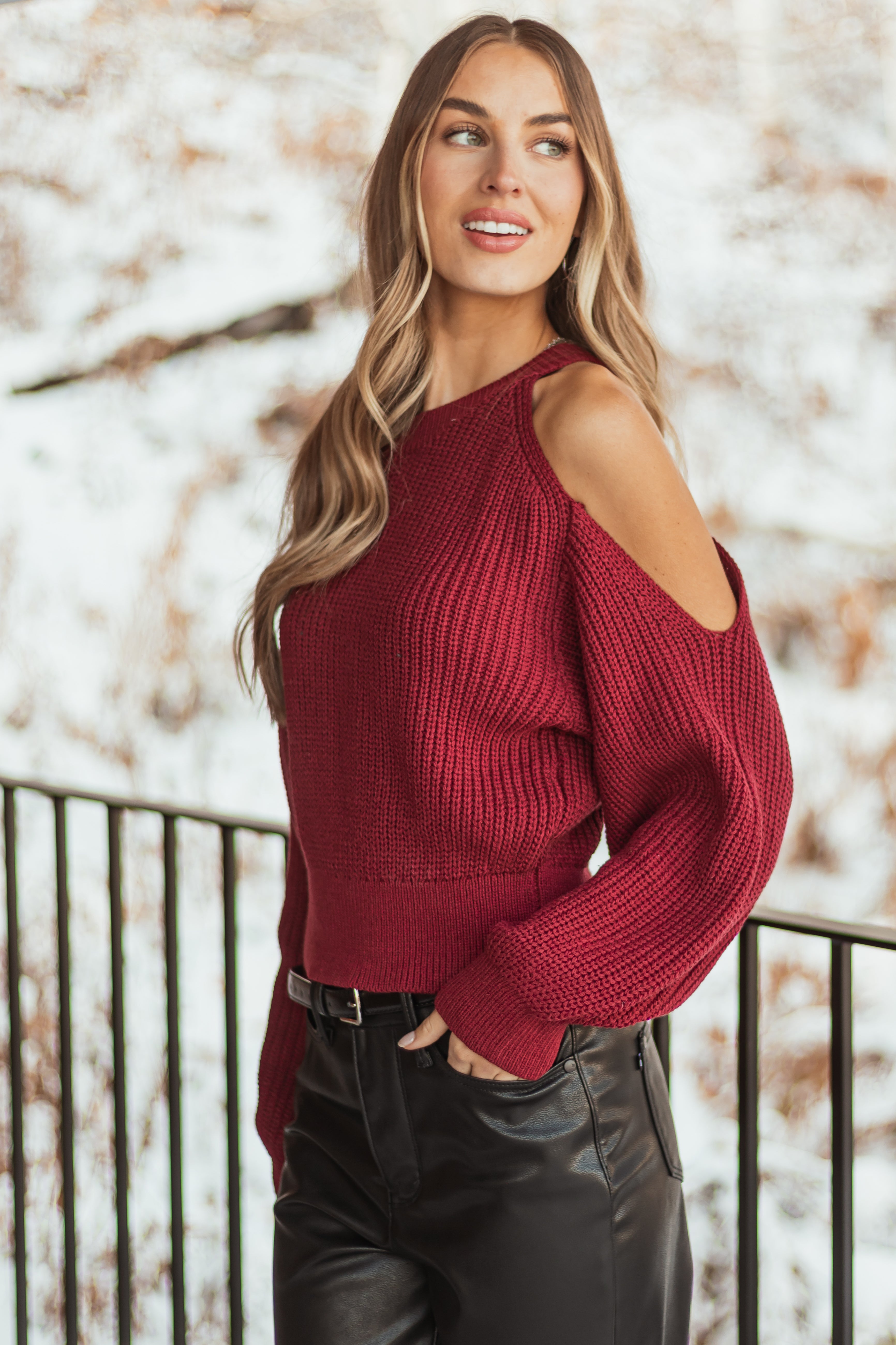 Elevate your style with our Burgundy Rib Knit Cold Shoulder Sweater. Crafted from a semi-stretchy blend of 60% Cotton and 40% Acrylic, this sweater features long balloon sleeves, a drop shoulder design, and ribbed trim for a trendy look. The cozy rib knit construction ensures comfort while making a bold fashion statement. Ideal for various occasions, pair it with your favorite bottoms for a chic ensemble. Available in sizes S, M, and L.