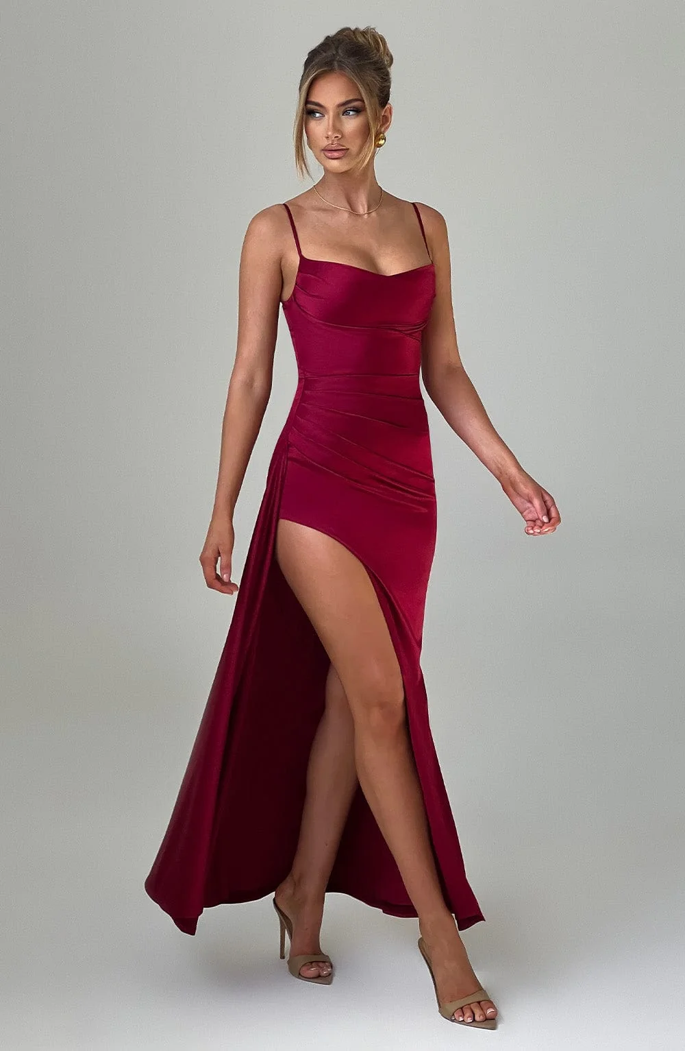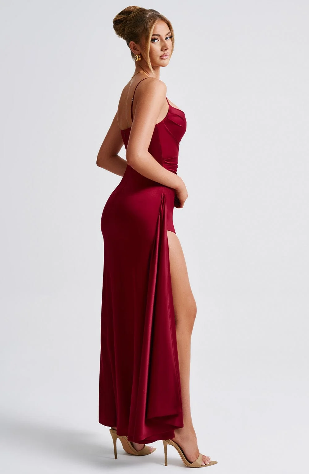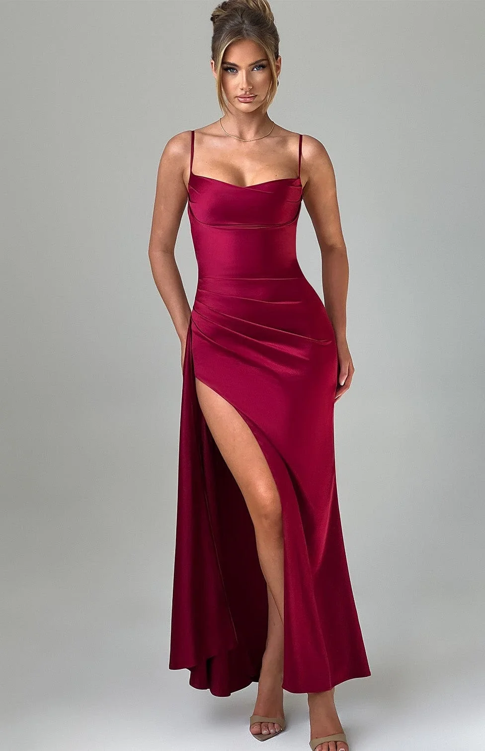 Elevate your style with the Burgundy Satin Maxi Dress featuring a luxurious stretch satin fabric that beautifully accentuates your figure. This elegant dress boasts a cowl neckline, asymmetrical pleats, and a draped thigh-high split for a glamorous touch. Perfect for formal events, parties, or weddings. Keep heads turning with this premium maxi dress.