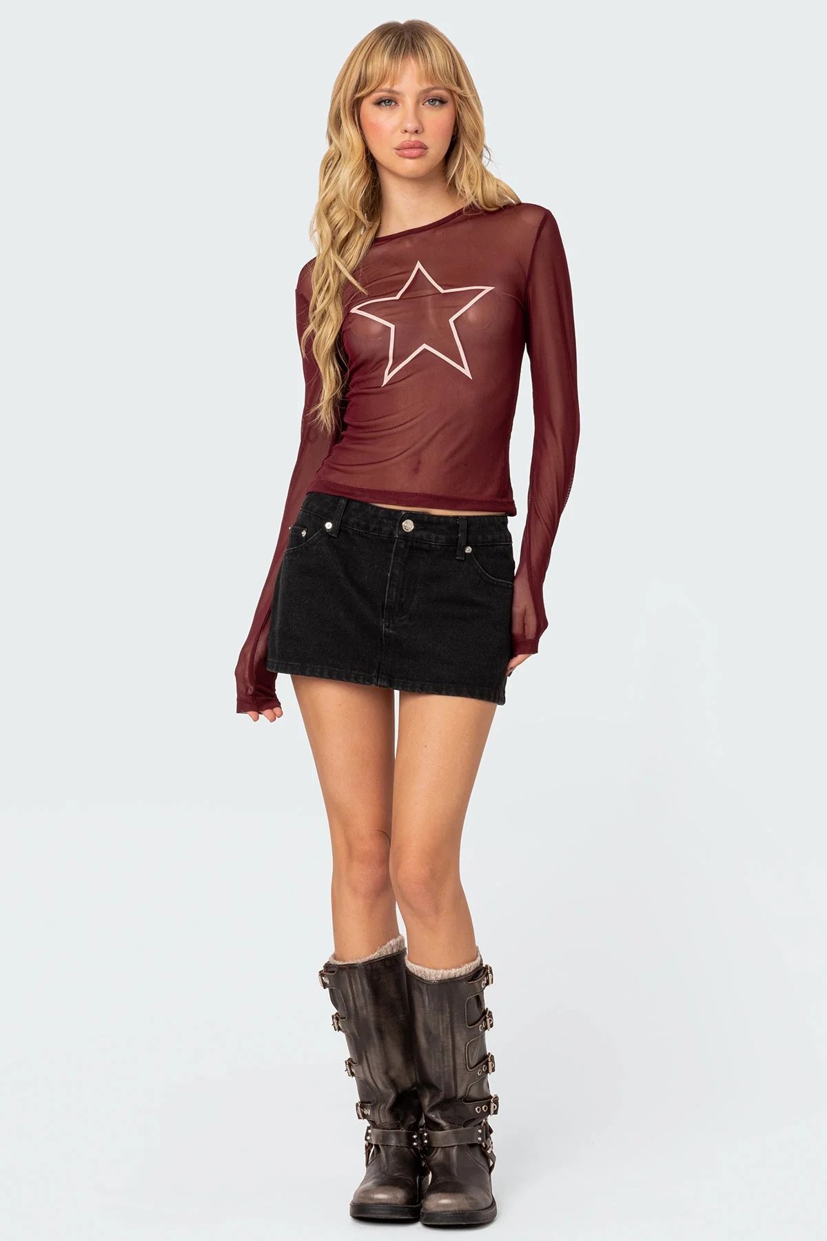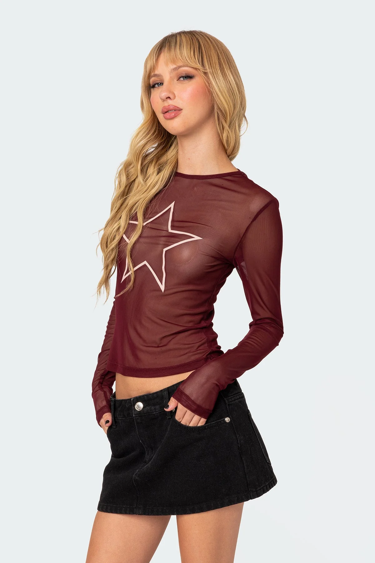 Elevate your style with our Burgundy Sheer Mesh Stargaze Top featuring long sleeves, a graphic print, and a blend of polyester and spandex for ultimate comfort. This trendy top is perfect for any occasion and adds a touch of glamour to your wardrobe. Embrace your unique fashion sense with this versatile piece that pairs effortlessly with your favorite bottoms. Care Instructions: Wash with similar colors for lasting quality and vibrant appearance.