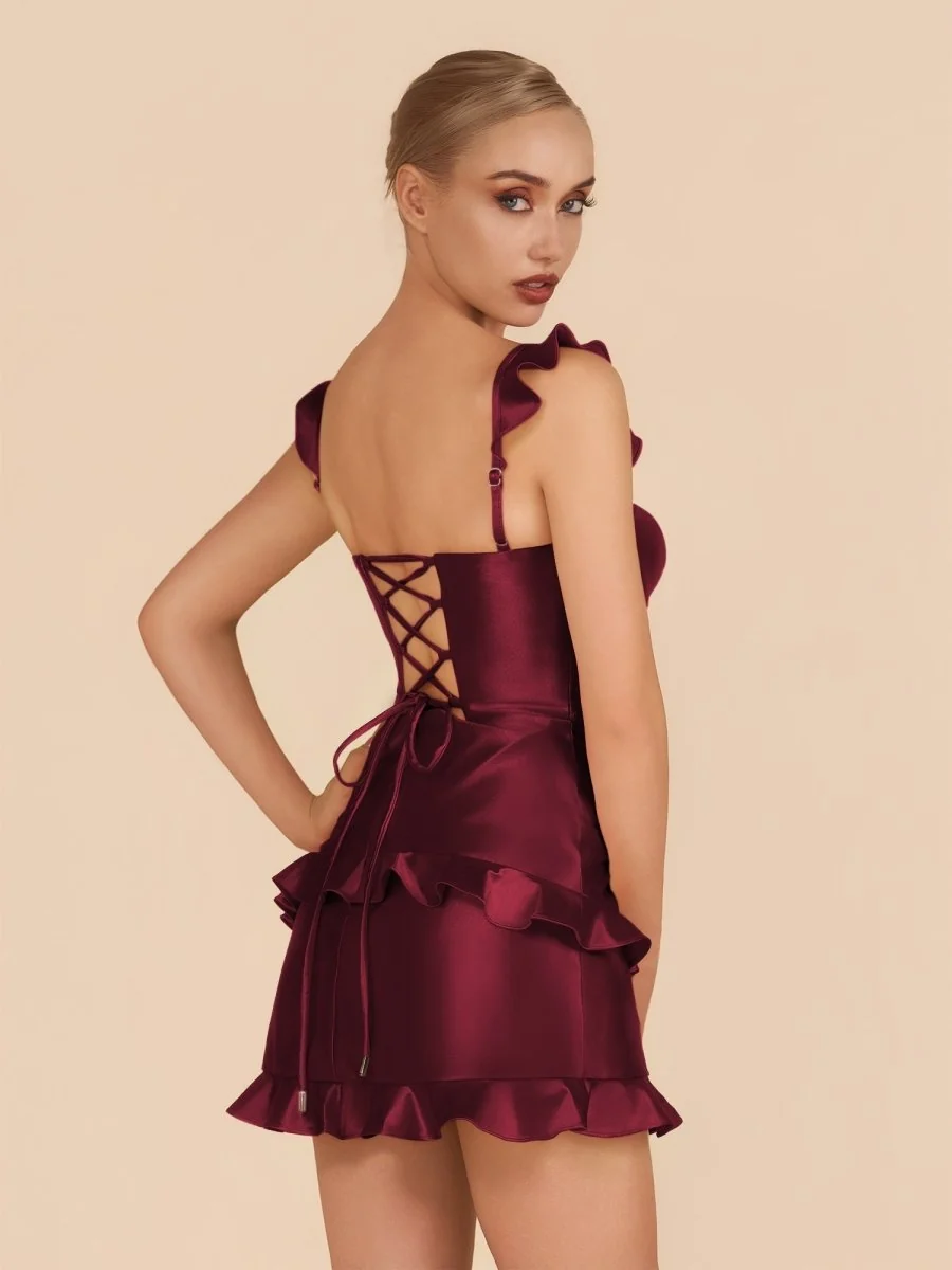 Elevate your style with Junelles Burgundy Sweetheart Satin Ruffles Short Homecoming Dress. Crafted from sleek satin, this sheath silhouette boasts a flattering sweetheart neckline, delicate ruffle accents, and a lace-up back for a perfect fit. Whether its homecoming, a cocktail party, or a night out, this dress exudes charm and confidence. Playful yet elegant, its a versatile choice for any special occasion. Available in Red, Sky Blue, Lavender, Black, Dark Green, Navy Blue, and Royal Blue.