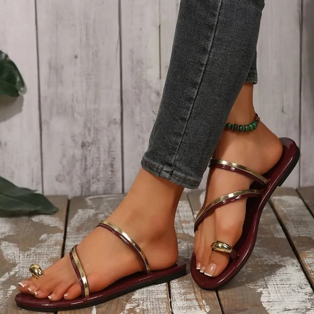 Enhance your style with these comfortable burgundy toe loop flats sandals for women. These flats feature a true-to-size fit made of PU leather and rubber, offering both elegance and durability. Box not included. Heel height: Flats. Available in multiple sizes: 35(US4) – 43(US11). Elevate your fashion with these imported must-have sandals.