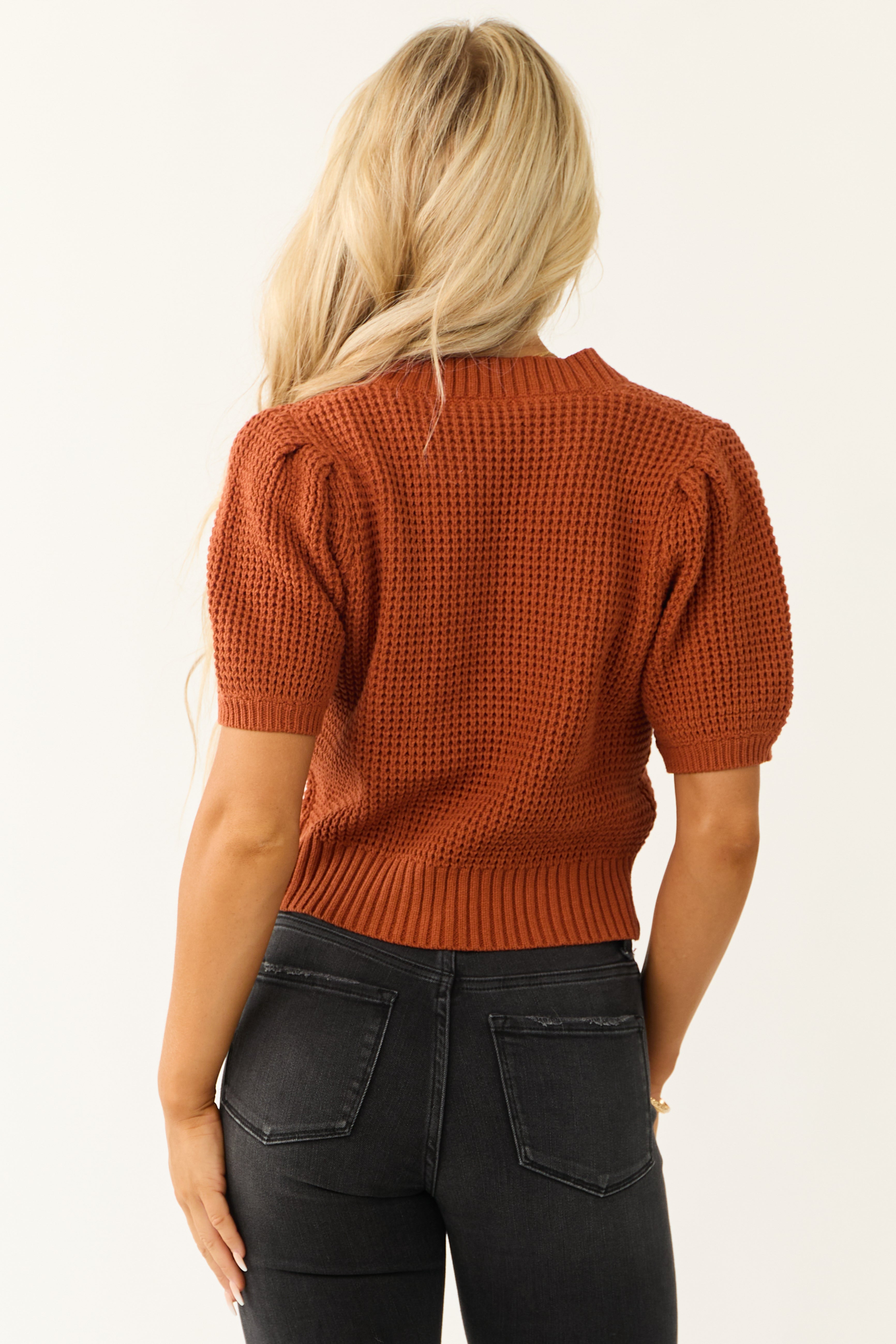 Embrace comfort and style with our Burnt Orange Puff Sleeve Sweater Top. Crafted from a stretchy waffle knit blend of 60% Cotton and 40% Acrylic, this top features short puff sleeves, banded ribbed trim, and a semi-cropped length for a trendy look. Perfect for various occasions, this top is versatile and easy to care for. Available in sizes S, M, and L.