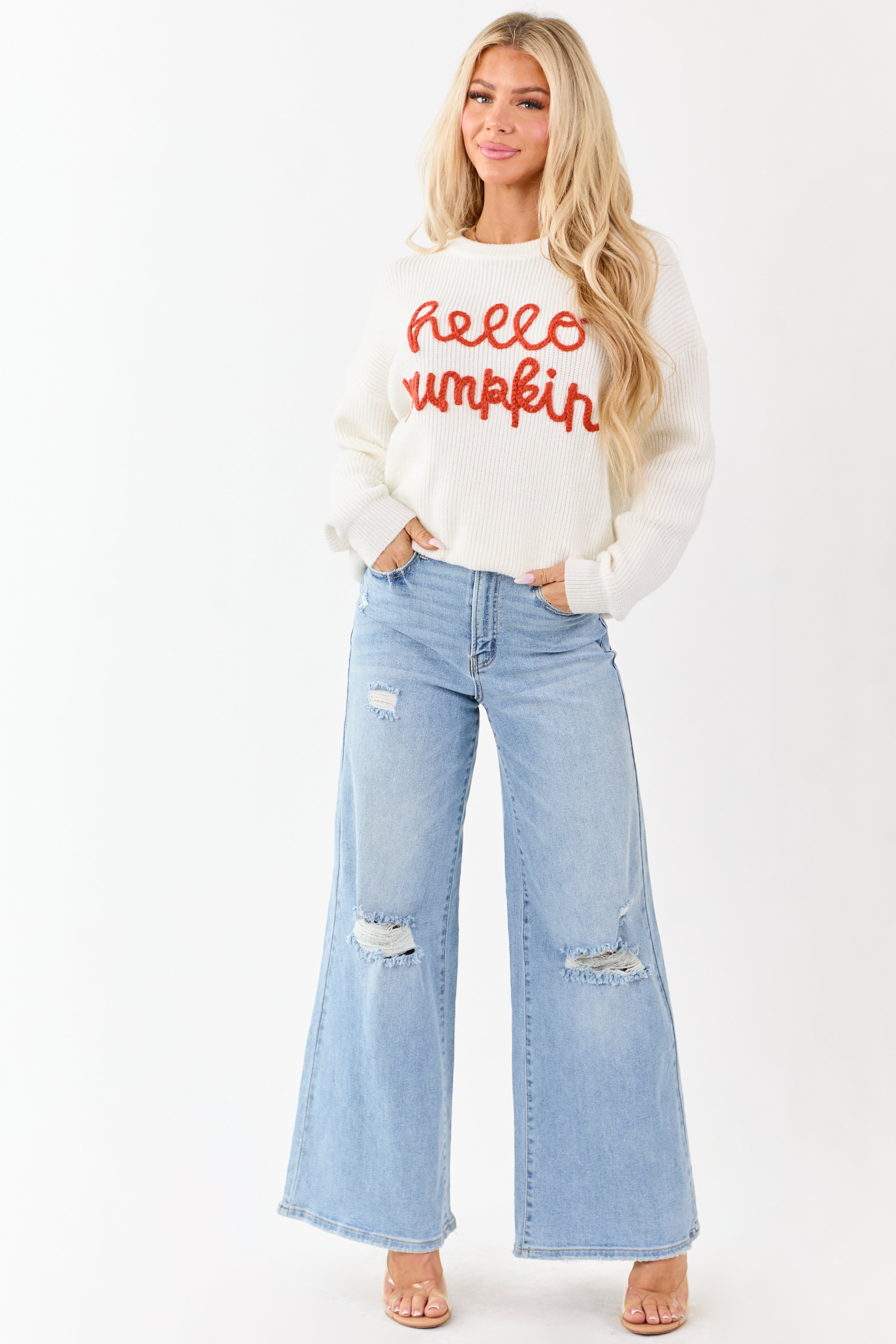 Stay stylish with our oversized knit sweater featuring charming ‘Hello Pumpkin’ embroidery in a beautiful Burnt Orange shade. This sweater boasts an oversized fit, stretchy rib knit, and banded ribbed trim for extra comfort and style. Made of 100% Acrylic, this sweater is perfect for the Fall season. The length ranges from 26 inches to 27 inches while the sleeve length varies from 26 inches to 27 inches, ensuring a cozy feel. Imported.