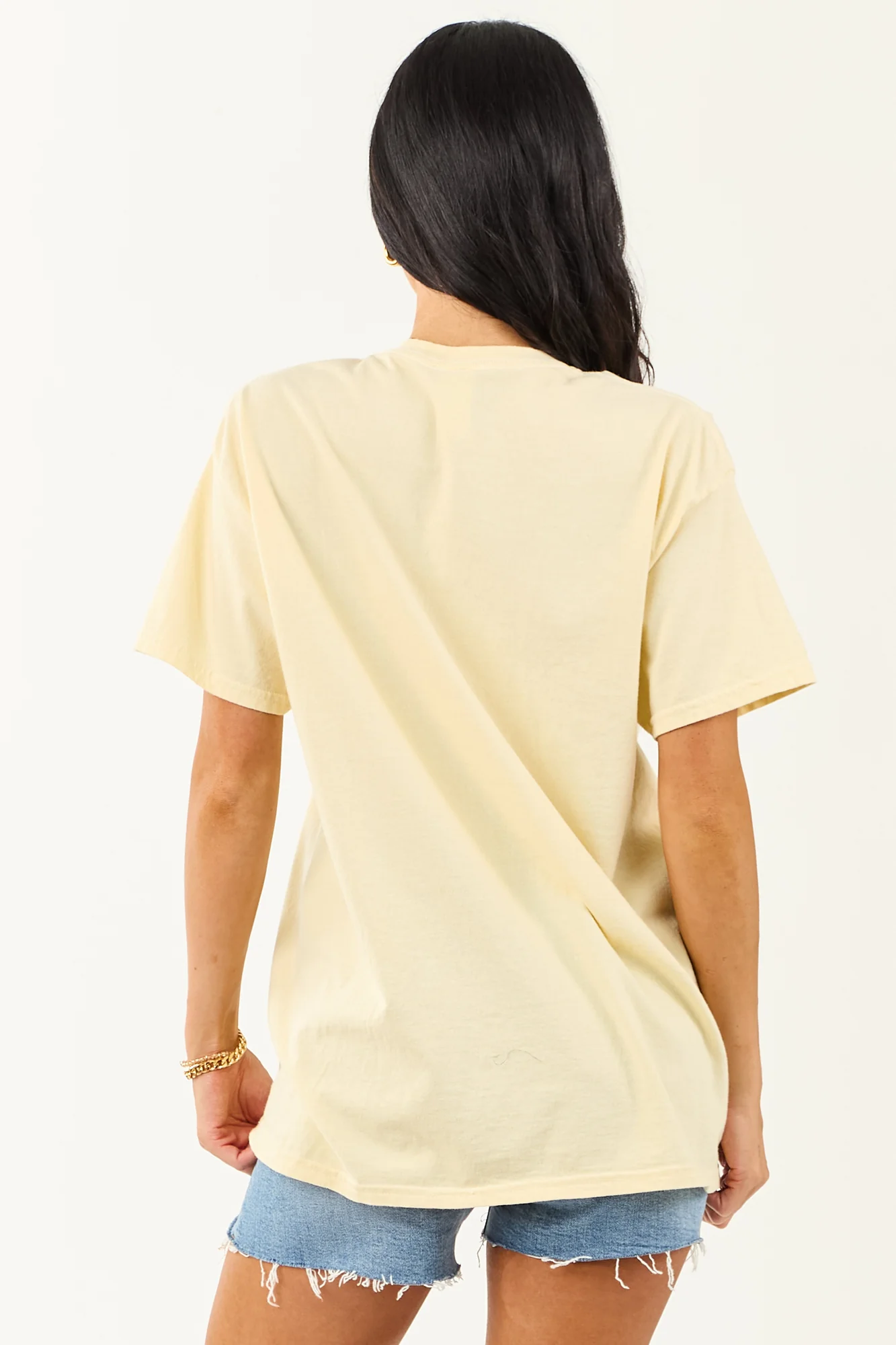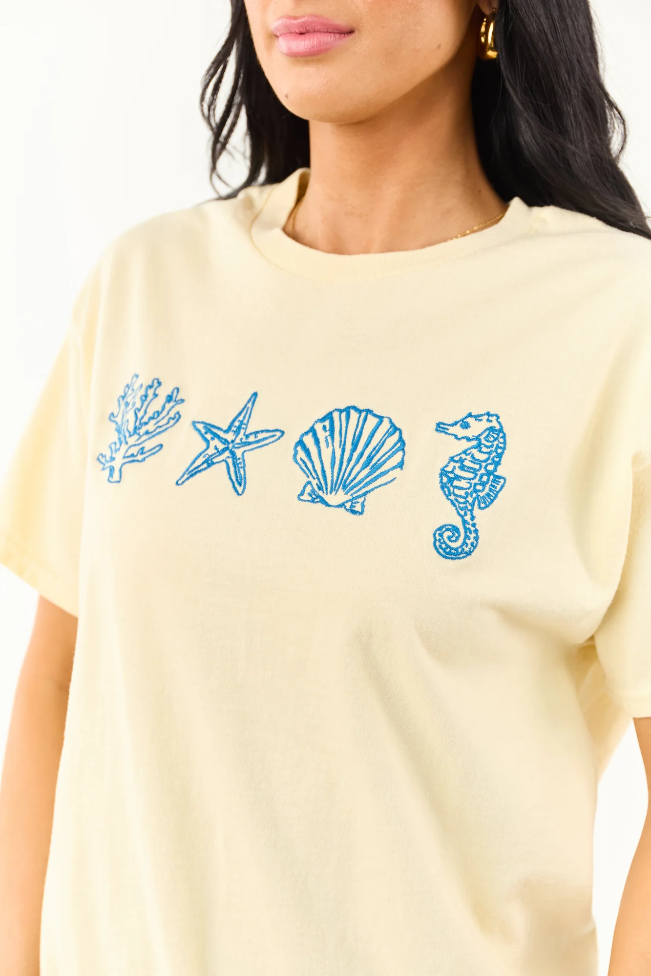 Indulge in the cozy comfort of this buttercream beachy embroidery relaxed tee . Perfect for sandy beach days, this oversized top in stretchy lightweight cotton offers a relaxed fit. The beachy embroidery in a soothing sapphire shade adds a touch of whimsy. Each piece is unique due to the dying and washing process. Available in sizes S/M and L/XL, and recommended for sizing down.