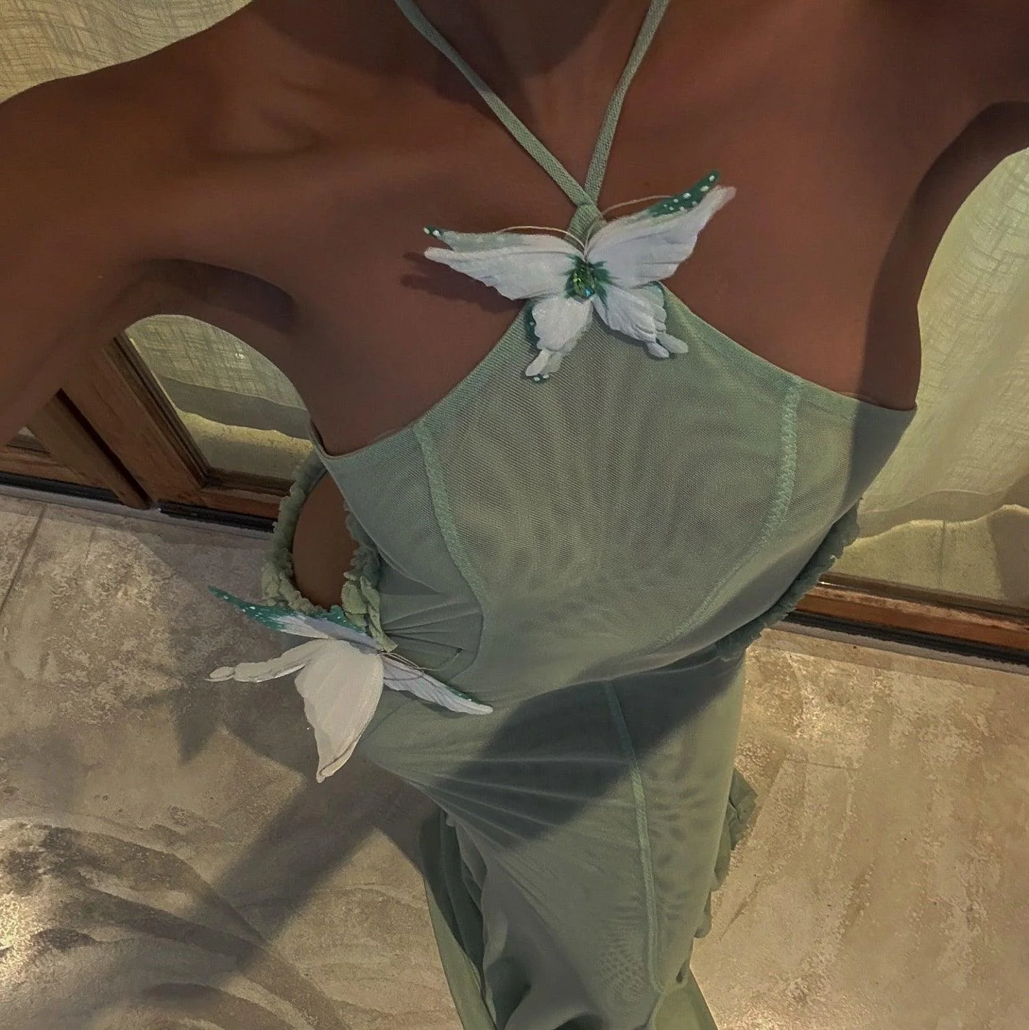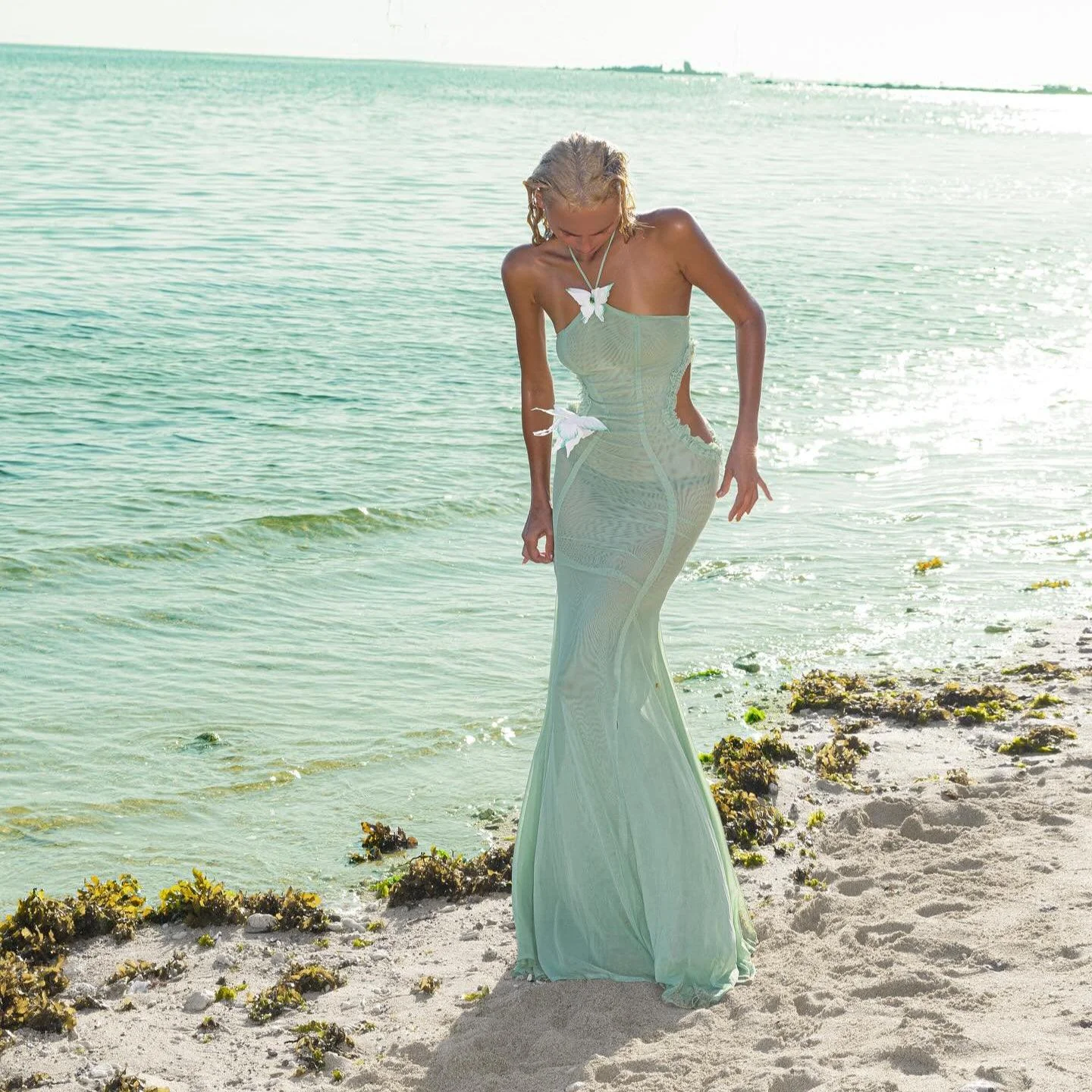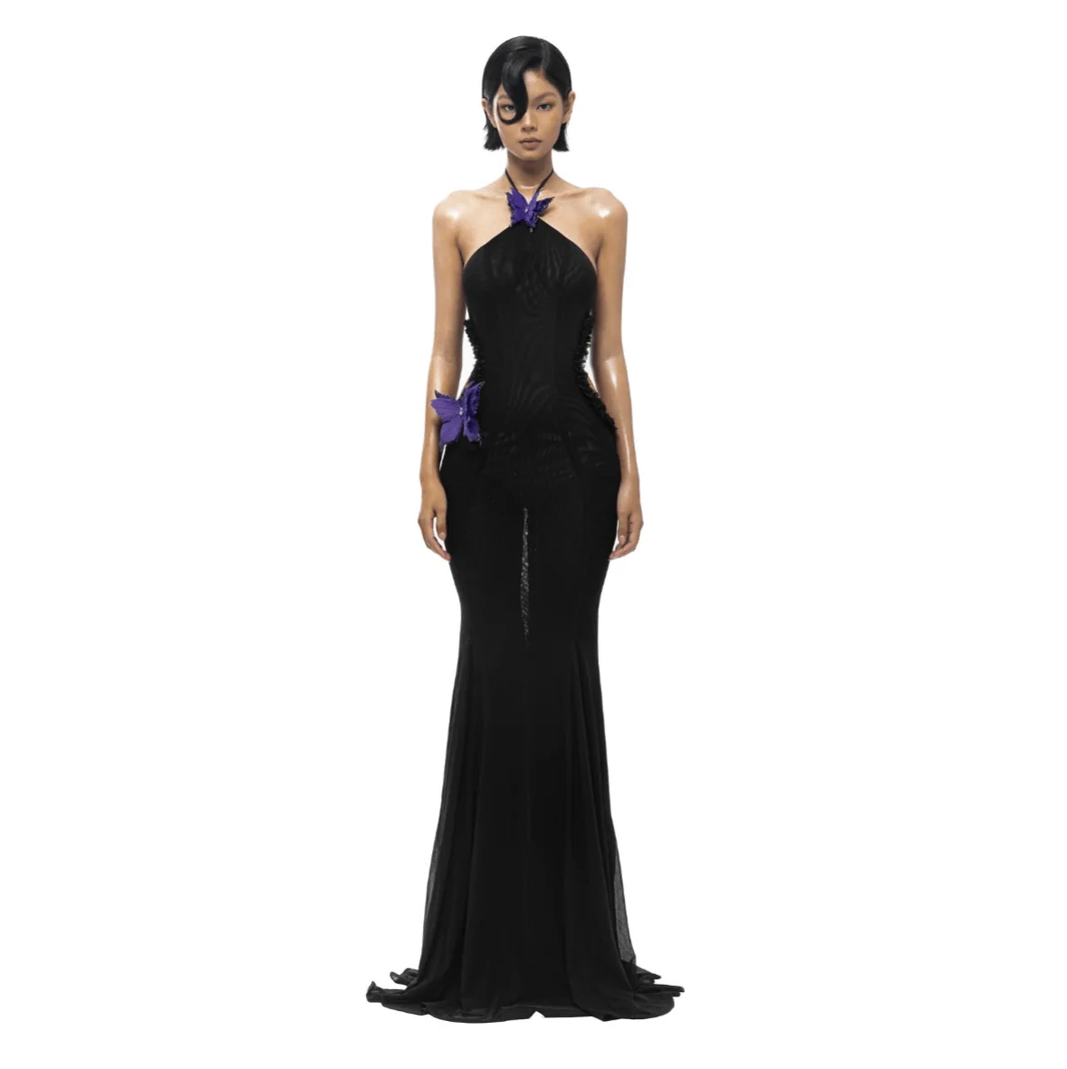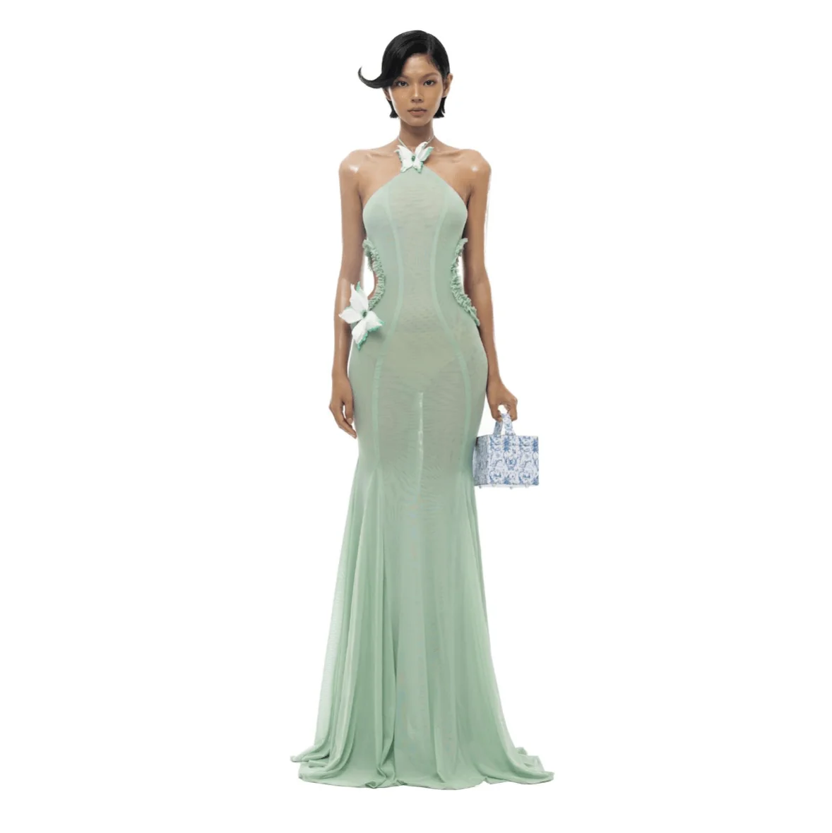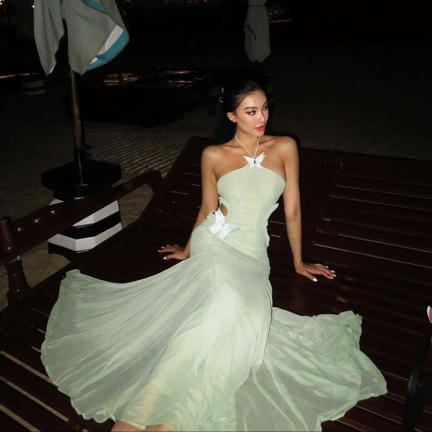 Indulge in the enchanting allure of the Butterfly Halter Elegant Maxi Dress offered in two opulent shades. This halter neckline dress features delicate butterfly embellishments for a charming and distinct look. The form-fitting design accentuates your figure, while the side cutouts add a playful touch. Made from a comfy, stretchy fabric, this maxi dress combines comfort and style seamlessly. The mermaid-style hemline cascades gracefully, exuding elegance with every step you take. Ideal for formal events and special occasions, this dress is a show-stopper. Complete your ensemble with minimal accessories for a captivating appearance. Experience fashion at its finest with our Instagram account @mermaid_way. Enjoy hassle-free size exchanges for the perfect fit.
