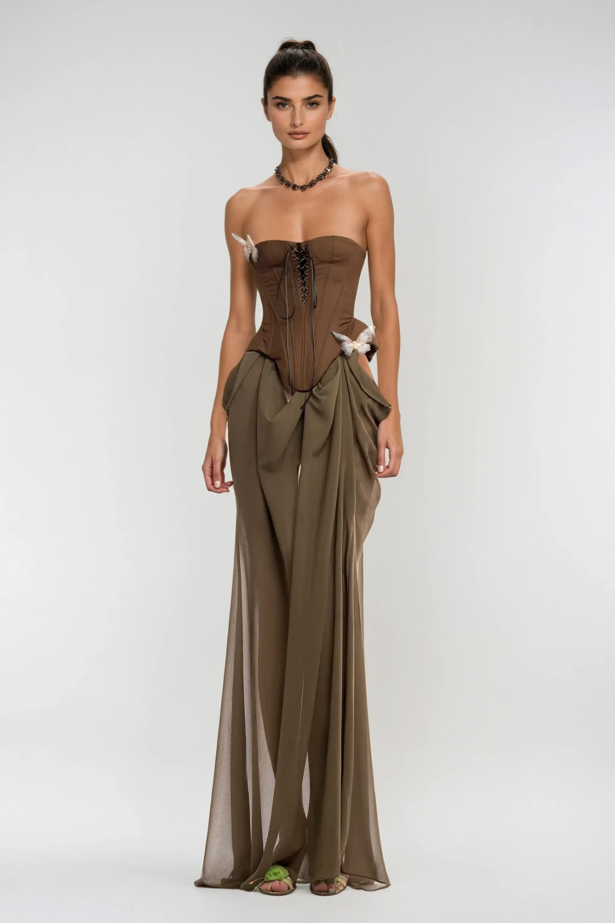 Upgrade your wardrobe with the Butterfly Lace Up Two-Piece Skirt Set. This elegant set includes a stylish strapless top and a matching skirt adorned with butterfly-inspired lace-up details. Made from 95% Polyester and 5% Spandex for a perfect fit, this versatile ensemble transitions seamlessly from day to night, ensuring you stand out with every wear. The set may vary in color due to lighting effects. For the best fit, consider sizing up if between sizes. Enjoy the perfect balance of comfort and sophistication with this must-have set.