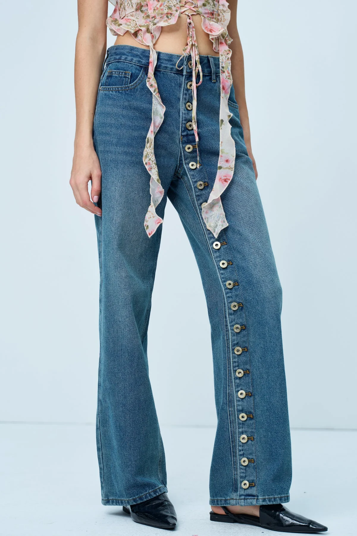 Discover the perfect blend of style and comfort with our Button Detail Denim Jeans. These jeans feature unique button detailing that adds a touch of edginess while ensuring a comfortable fit for all-day wear. Expertly crafted from 50% Polyester and 50% Cotton for durability. With a non-stretch design, they are ideal for those valuing both fashion and practicality. Enjoy easy care with gentle machine wash. Please note that color may vary slightly due to lighting. Get yours now!