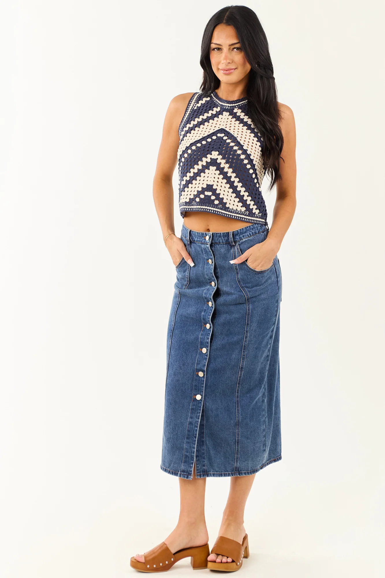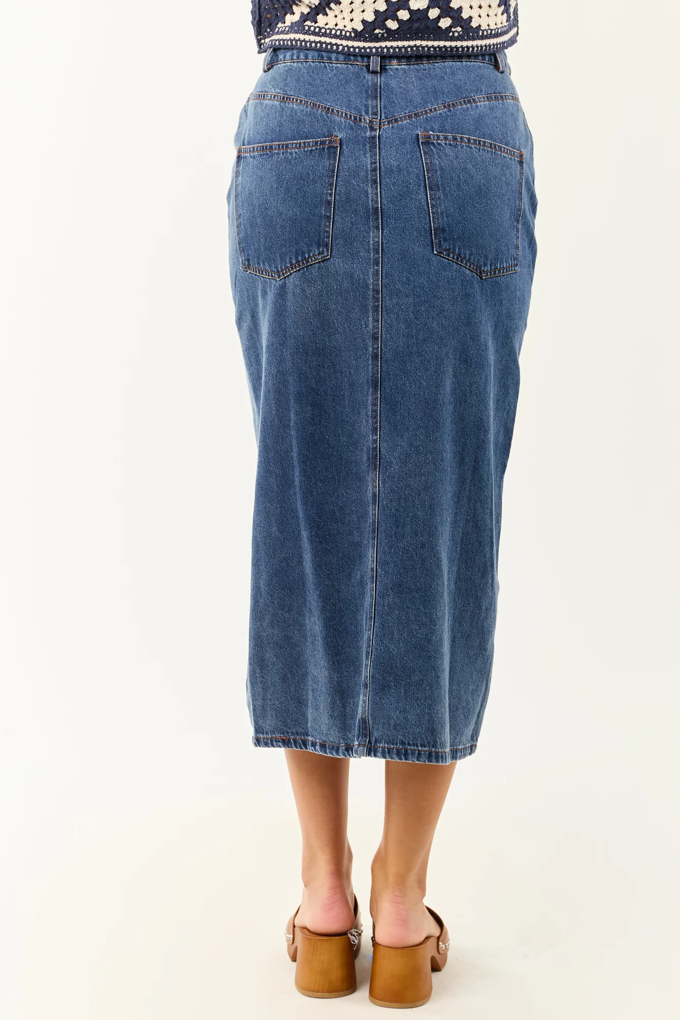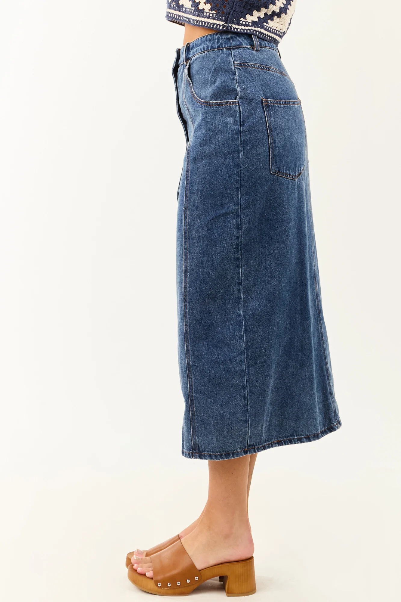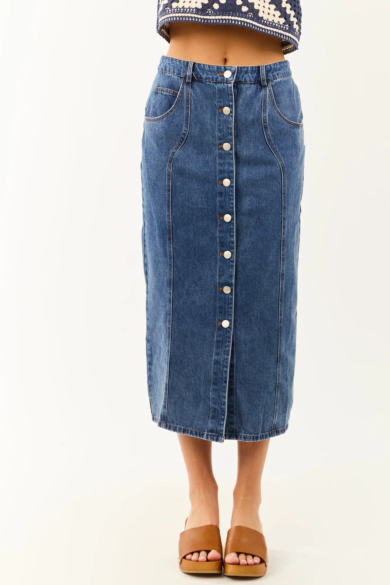 Indulge in the timeless charm of our Button Front Denim Midi Skirt in Medium Wash. Crafted from non-stretchy denim, this skirt features 5 pockets and a slightly loose fit around the waist. With a waist size range of 28″-32″ and hip measurements of 36″-40″, it offers both comfort and style. This versatile skirt is a must-have for casual or semi-formal occasions. Made of 95% Cotton and 5% Rayon. Imported. Model is 59″ tall, a Size 1, with a 34″ bust and 26″ waist, wearing a size Small.