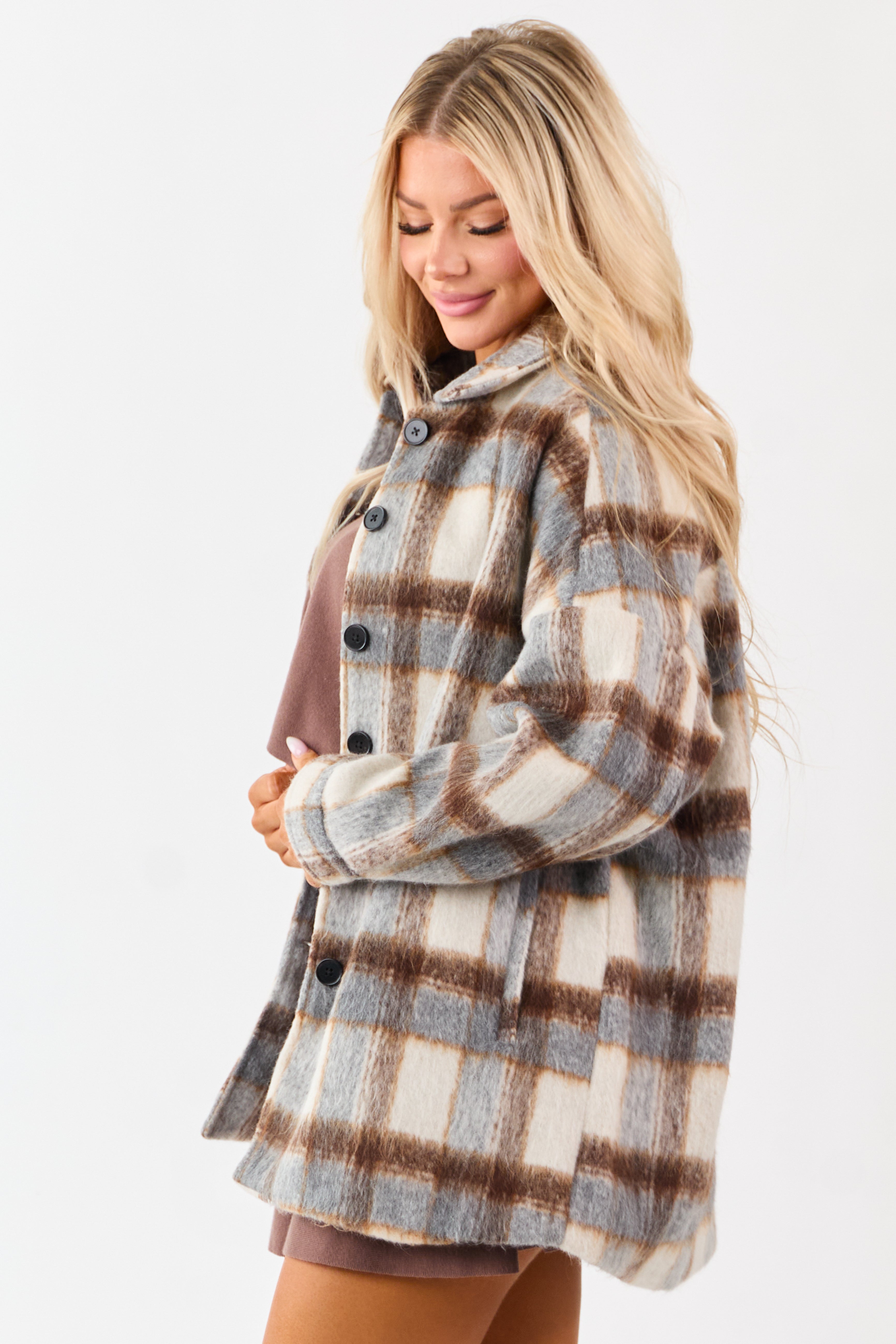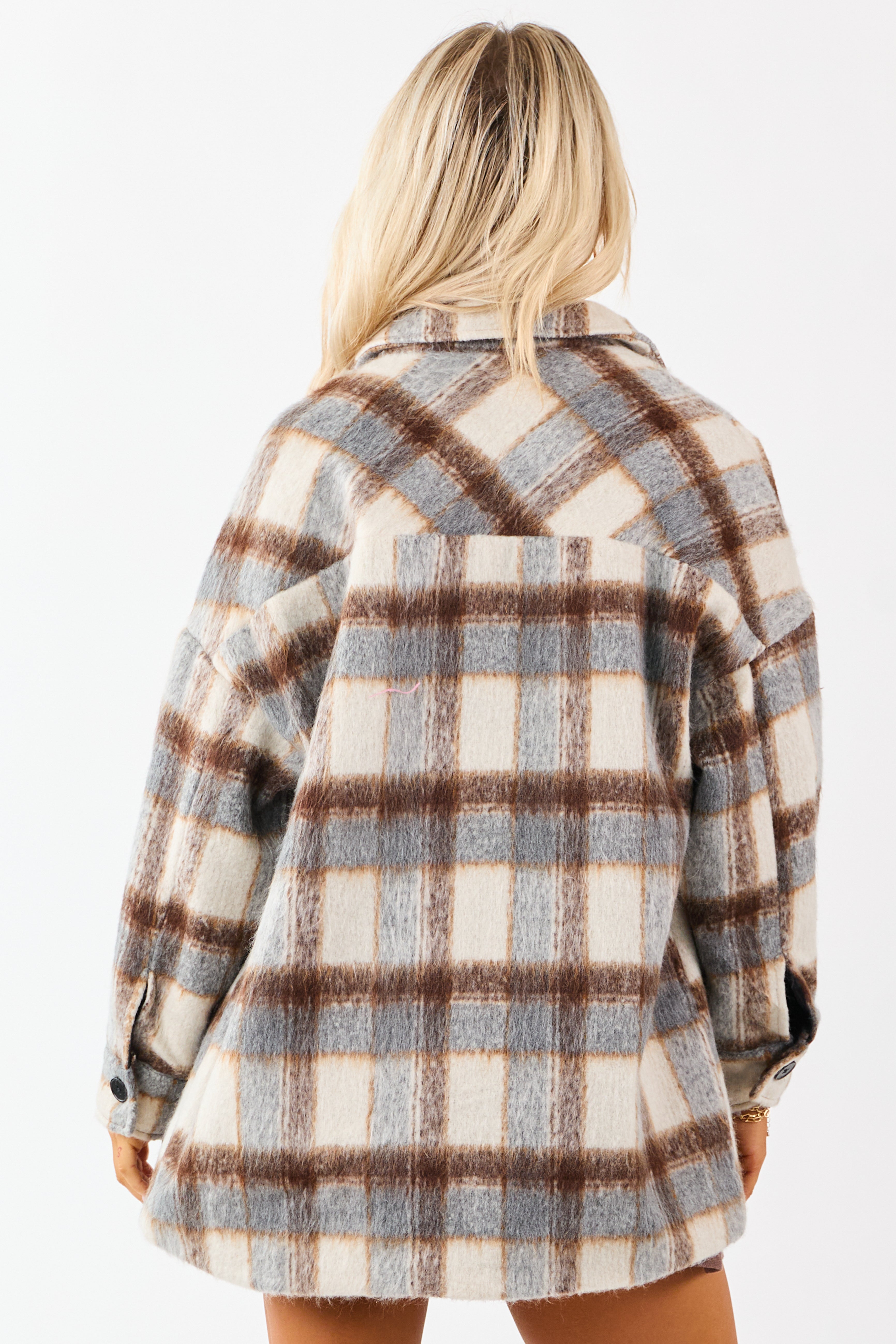 Indulge in the softness of a brushed fleece texture with this cozy plaid shacket designed for crisp fall days. Featuring a relaxed fit, banded button cuffs, drop shoulders, and 2 pockets. Made of 100% polyester, this imported shacket in slate grey, almond, and camel shades is a must-have for your wardrobe. Available in sizes S, M, and L with bust measurements of 46, 48, and 50respectively. The length varies from 32to 33, and sleeve length ranges from 27to 28. Model is wearing size Small. Perfect for a casual yet stylish look this fall season.