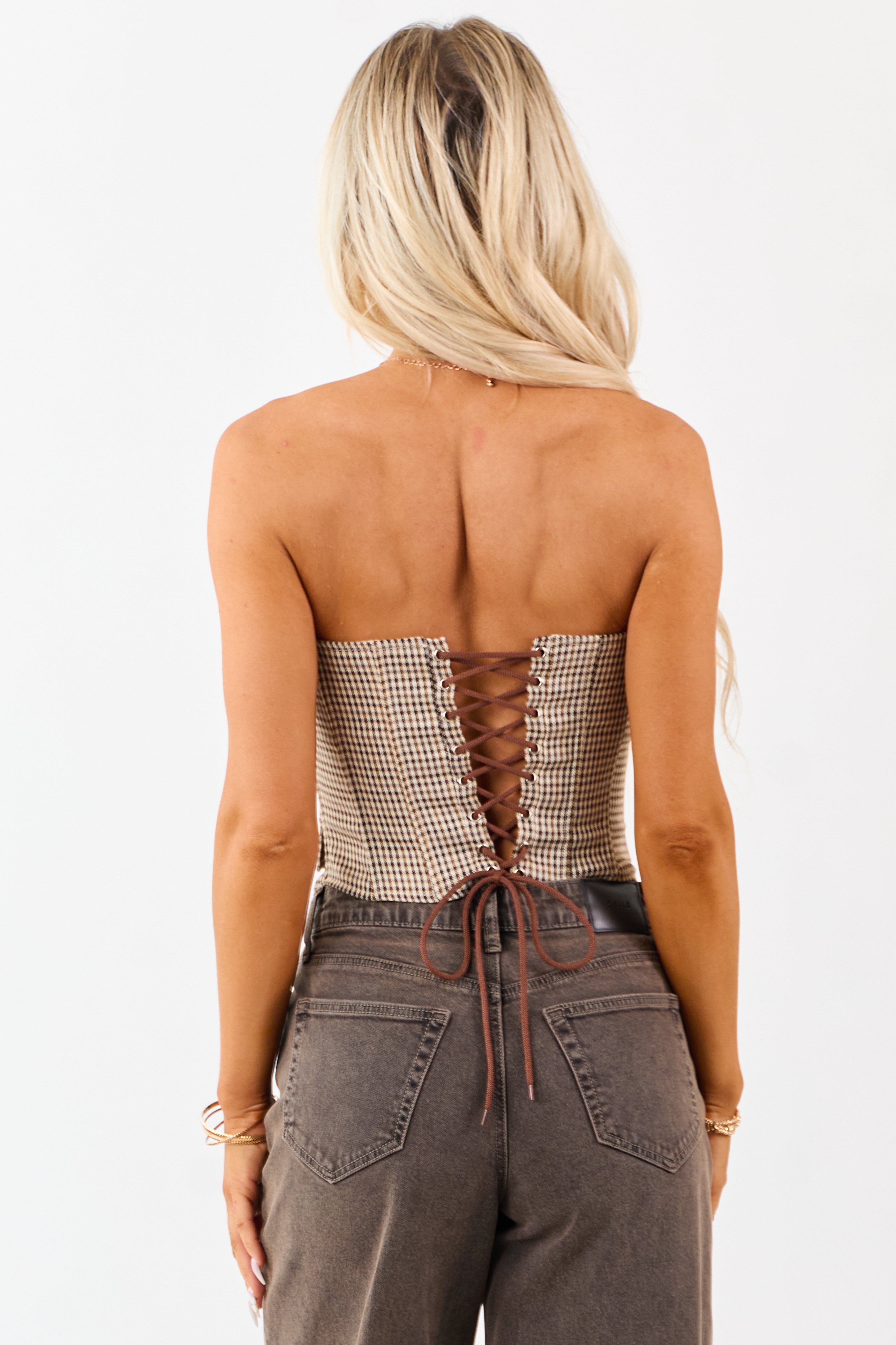 This stylish tank top combines comfort with fashion, featuring a supportive padded bust, pointed vest-style hem, and a breezy strapless fit. The fall-toned design in shades of Camel, Mocha, Chocolate, and Ivory adds a touch of sophistication. It includes boning detail, faux button-down accents, and front pocket details for added charm. Made of 89% Polyester, 10% Rayon, and 1% Spandex with a 95% Polyester and 5% Spandex lining. Look effortlessly chic with this versatile top . Model is wearing a size Small. Model’s Profile: Size 3, Height 57″, Bust 35″, Waist 26″.