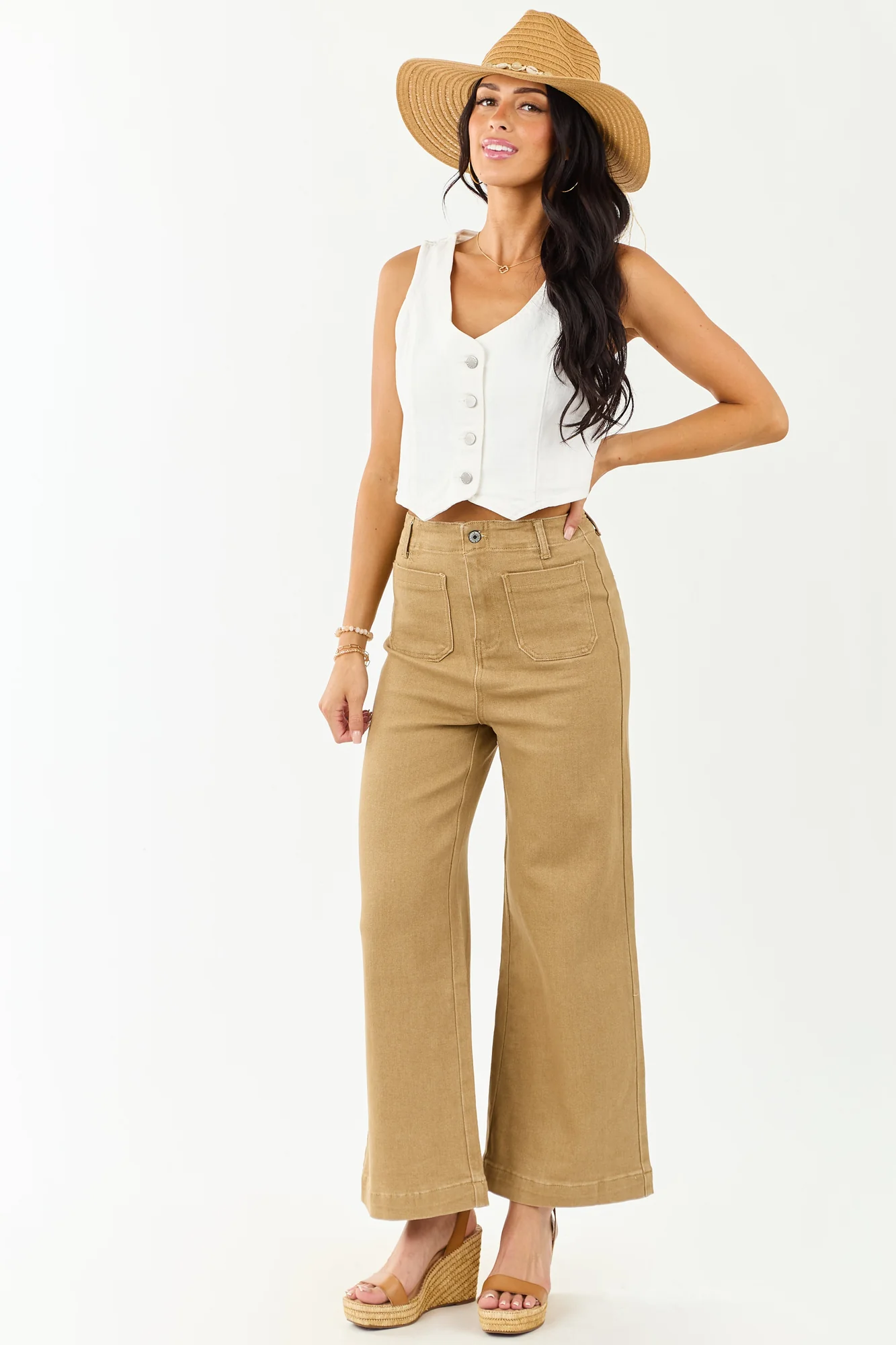 Discover versatile neutral camel wide leg jeans perfect for any outfit. These high-rise jeans offer comfort and style with a stretchy denim fabric. Find your perfect fit with sizes ranging to XL. Features include zipper fly, button closure, belt loops, sewn back pockets, and ankle-length design. Made of 70% Cotton, 28% Polyester, and 2% Spandex. Imported. Elevate your wardrobe with these premium wide leg jeans from the Lovelo x GeeGee collection. Model is wearing a size Small. Enhance your fashion statement with these chic and trendy jeans today!
